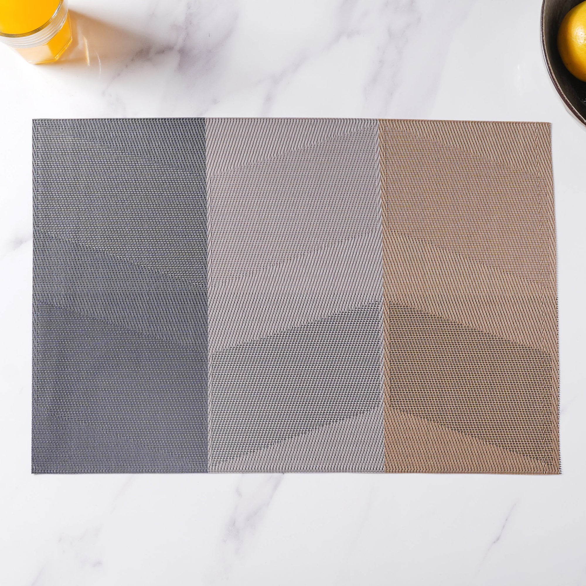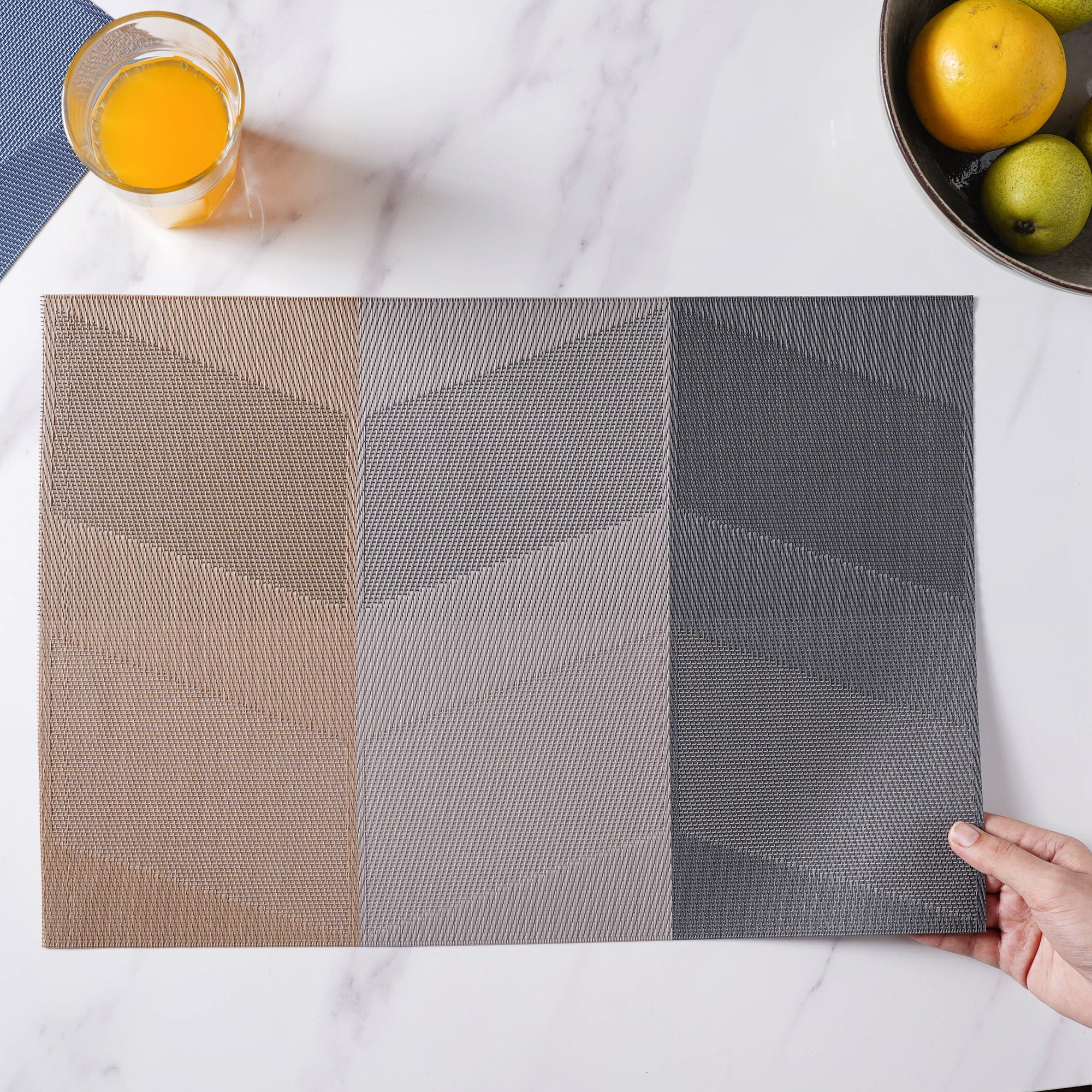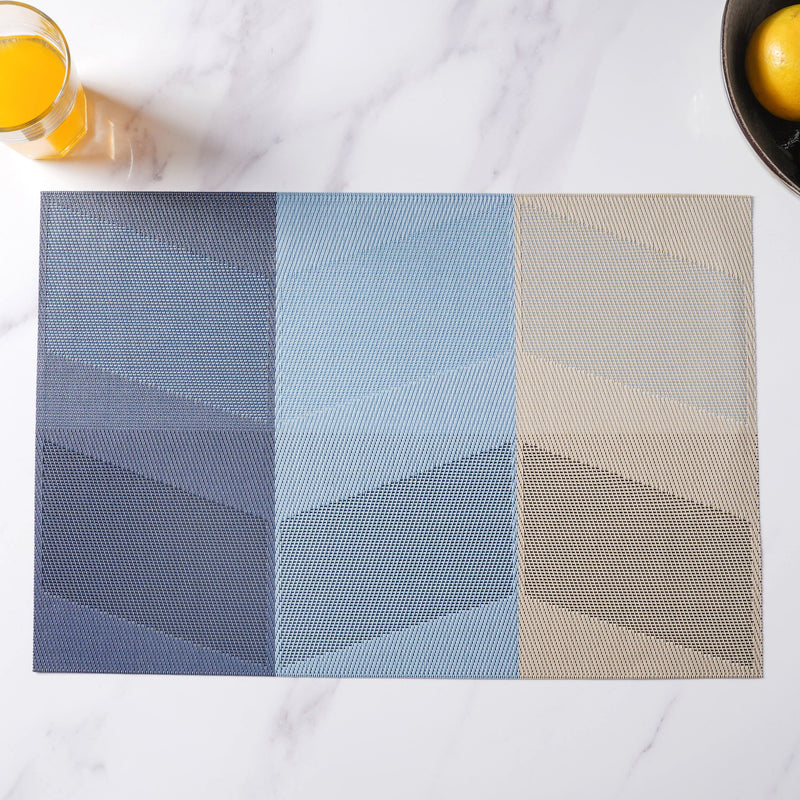 Rectangular table mat or placemat with a playful colour gradient pattern. The mats are effortlessly cleanable and foldable and can also be rolled up and kept in mat rings. The mat protects the table from scratches, spills and heat damage and can also be spread on the dressing table for placing boxes and showpieces. The mats add charm and finesse to any dining space.