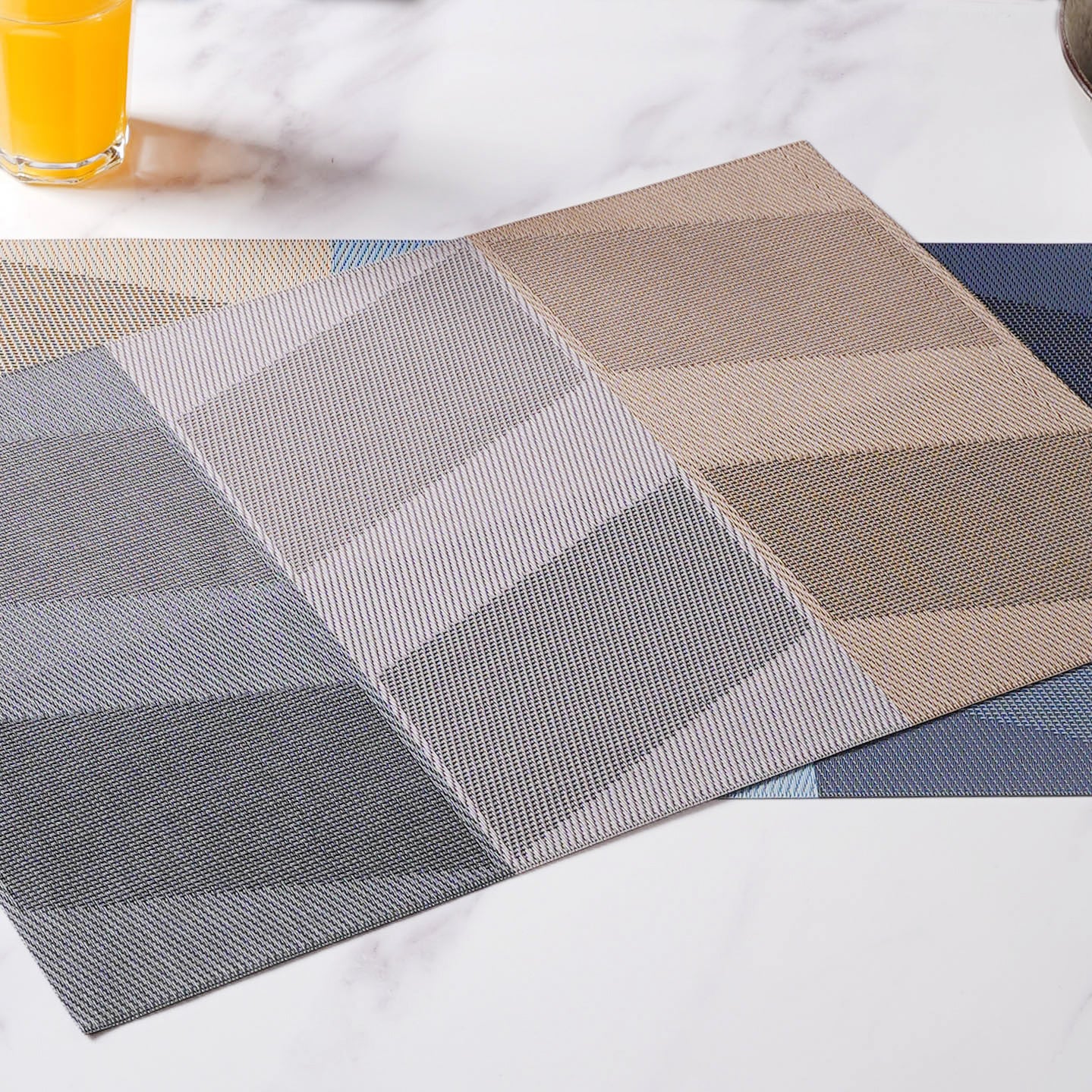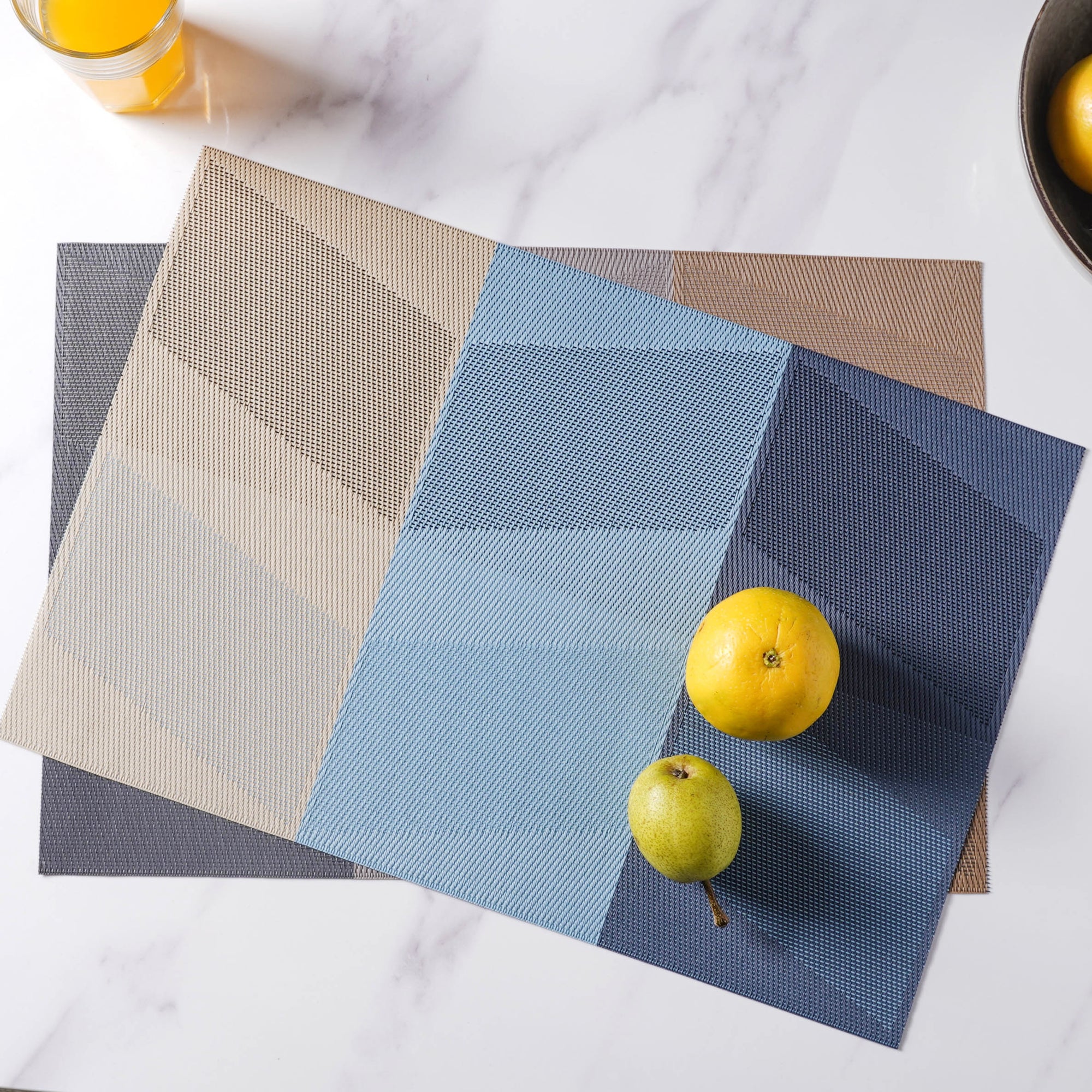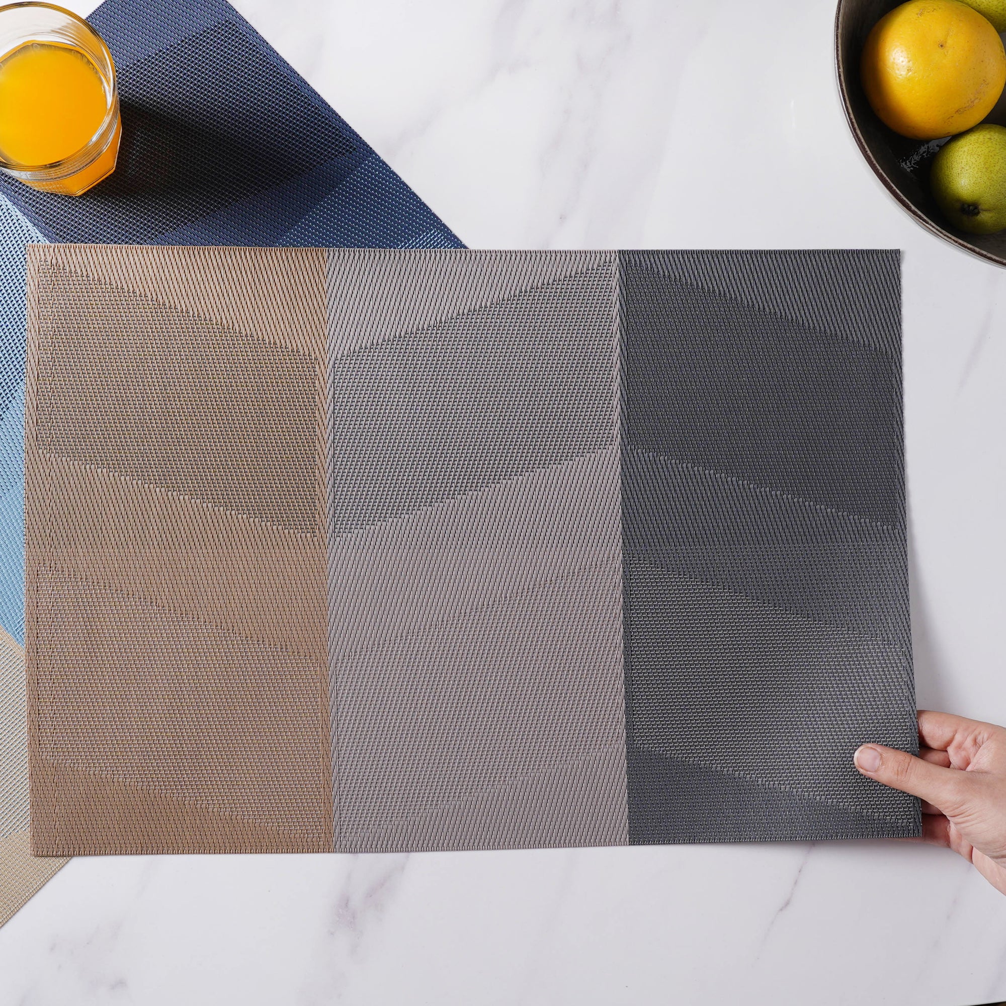 Rectangular table mat or placemat with a playful colour gradient pattern. The mats are effortlessly cleanable and foldable and can also be rolled up and kept in mat rings. The mat protects the table from scratches, spills and heat damage and can also be spread on the dressing table for placing boxes and showpieces. The mats add charm and finesse to any dining space.
