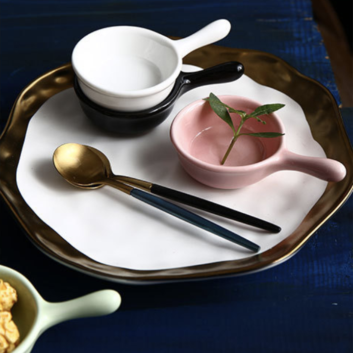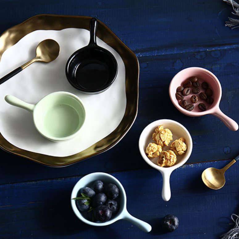 The dip bowl set in five alluring pastel shades of pink, blue, black, white, and green is perfect for serve chutneys, dips, condiments, or hot sauces. The vivid dip bowls make great pieces to serve an assortment of flavored chutneys with samosas, momos, fries, and much more. The ceramic handle attached to the tiny bowls allows for the easy handling of hot sauces, bitter, or ghee. Dunk into all the junk food one wants to have on the weekend or give the weekdays a weekend vibe by binge eating and binge-watching. The dip bowls have a finely polished surface adding to the overall charm of the coffee table.