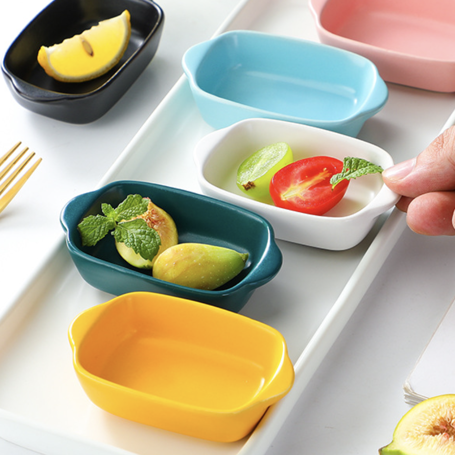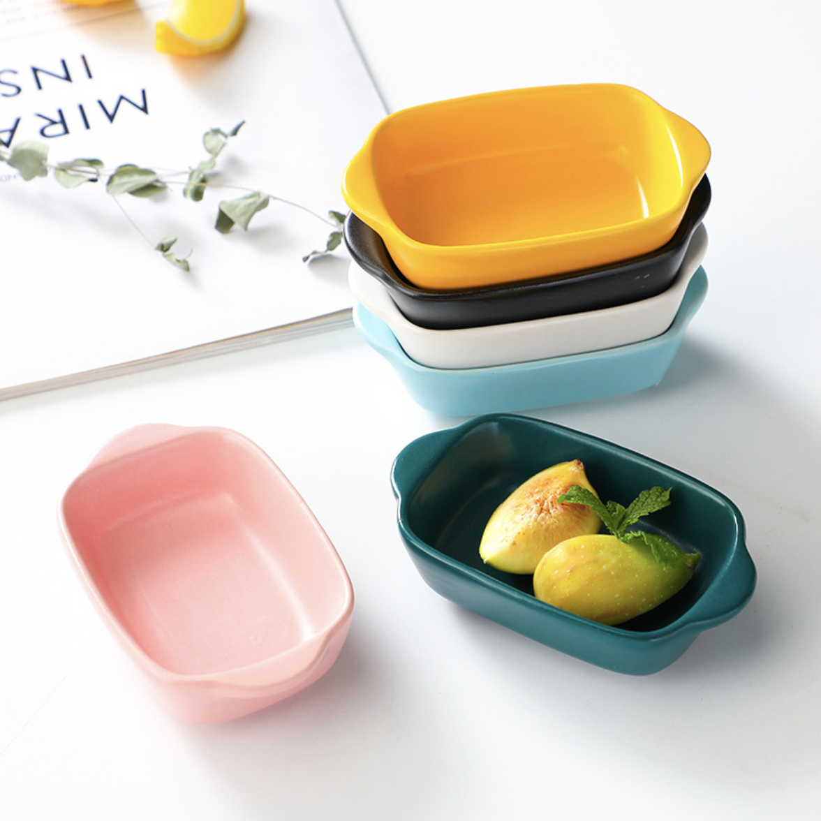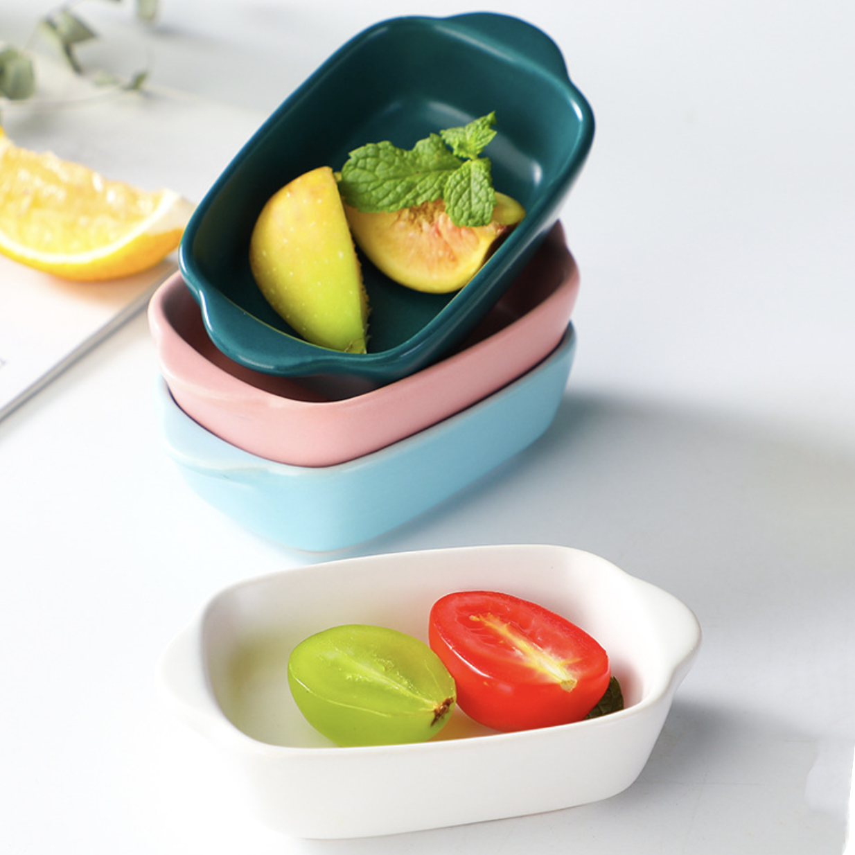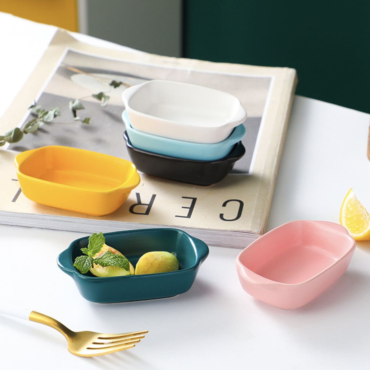 The baking dish for the oven in a rectangular shape is made in ceramic and comes in the colors yellow, pink, white, dark green, light blue, and black. The dish adds a splash of color to any dinner table setting. The microwave-safe dishes are ideal for serving straight from the microwave oven. In the dip bowl with handles, serve dips, oils, and chutneys. One could also serve snacks such as dry fruits, candy, and popcorn, or desserts, on the dish with an elevated rim. The dish makes the perfect oven-to-table piece, ideal for serving all one's favorite delectable dishes. The dish is emblematic of utmost style and refinement, with a simple and beautiful design. The product is made of high-grade ceramic, ensuring its longevity and high quality.