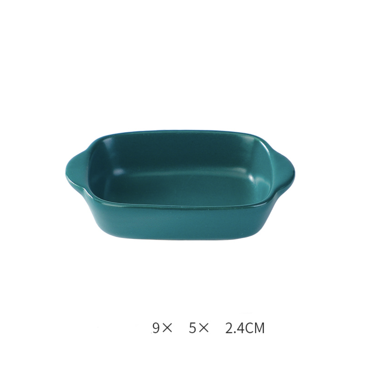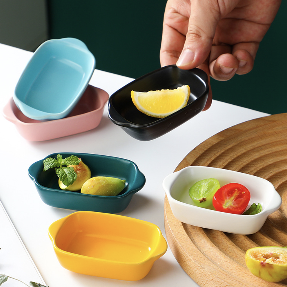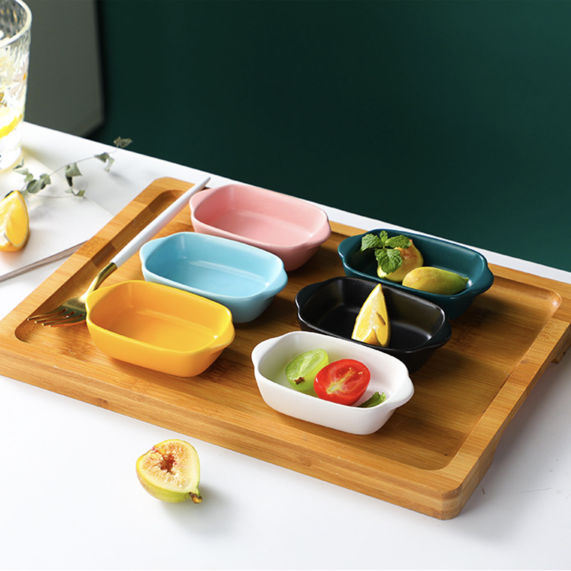 The baking dish for the oven in a rectangular shape is made in ceramic and comes in the colors yellow, pink, white, dark green, light blue, and black. The dish adds a splash of color to any dinner table setting. The microwave-safe dishes are ideal for serving straight from the microwave oven. In the dip bowl with handles, serve dips, oils, and chutneys. One could also serve snacks such as dry fruits, candy, and popcorn, or desserts, on the dish with an elevated rim. The dish makes the perfect oven-to-table piece, ideal for serving all one's favorite delectable dishes. The dish is emblematic of utmost style and refinement, with a simple and beautiful design. The product is made of high-grade ceramic, ensuring its longevity and high quality.