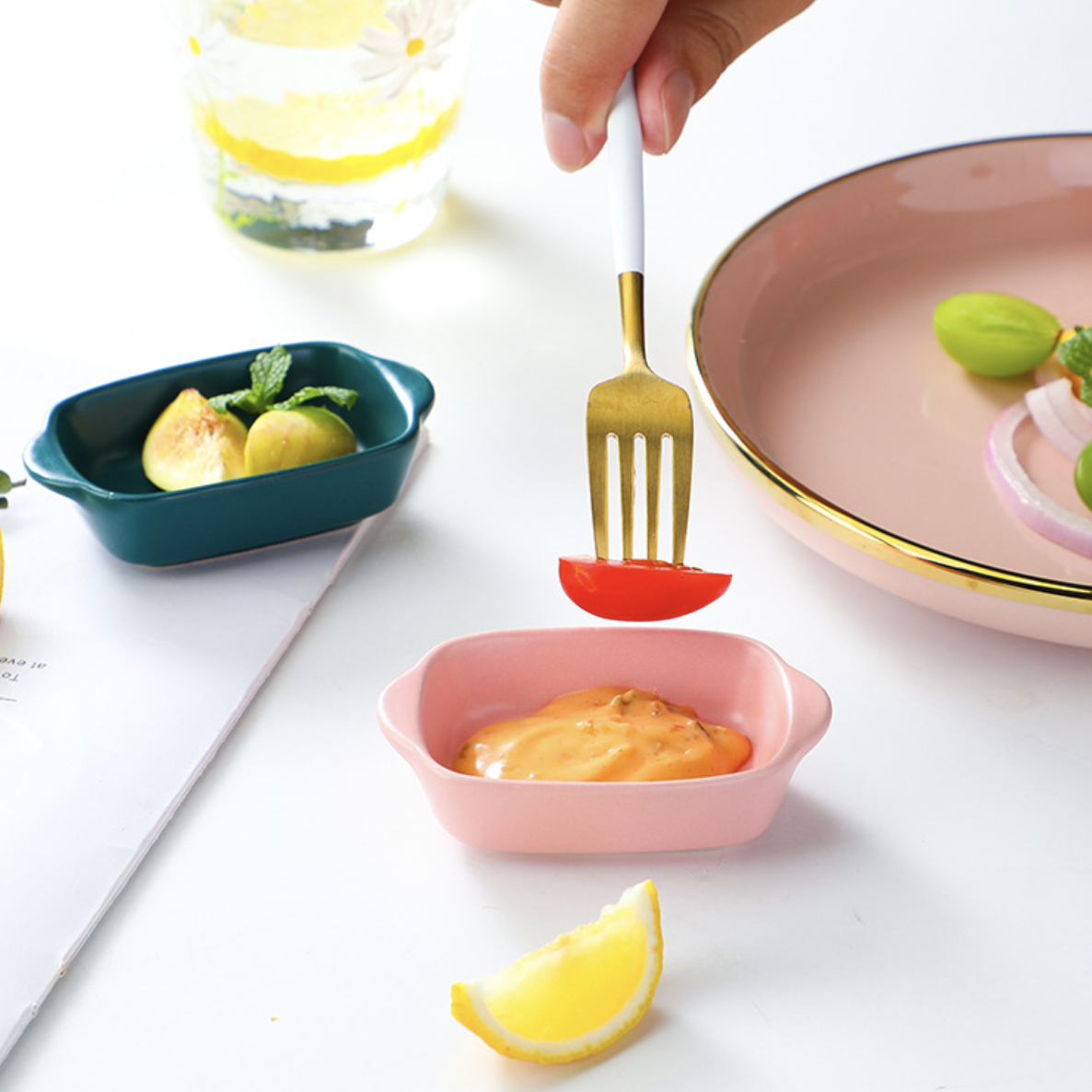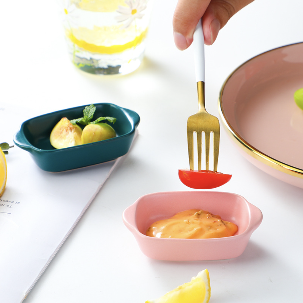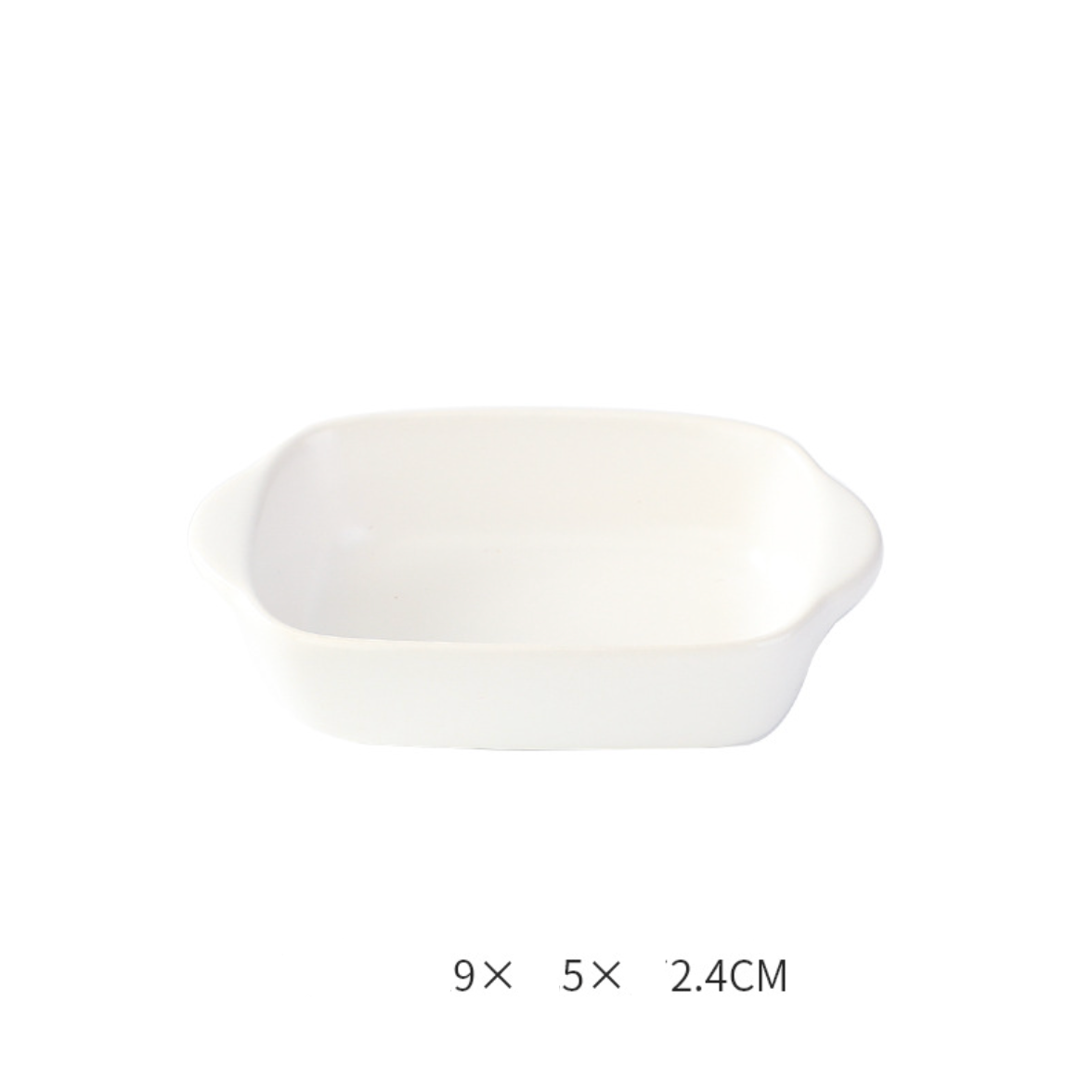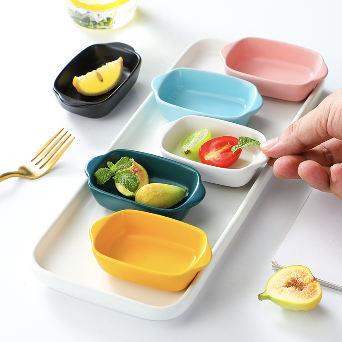 The baking dish for the oven in a rectangular shape is made in ceramic and comes in the colors yellow, pink, white, dark green, light blue, and black. The dish adds a splash of color to any dinner table setting. The microwave-safe dishes are ideal for serving straight from the microwave oven. In the dip bowl with handles, serve dips, oils, and chutneys. One could also serve snacks such as dry fruits, candy, and popcorn, or desserts, on the dish with an elevated rim. The dish makes the perfect oven-to-table piece, ideal for serving all one's favorite delectable dishes. The dish is emblematic of utmost style and refinement, with a simple and beautiful design. The product is made of high-grade ceramic, ensuring its longevity and high quality.