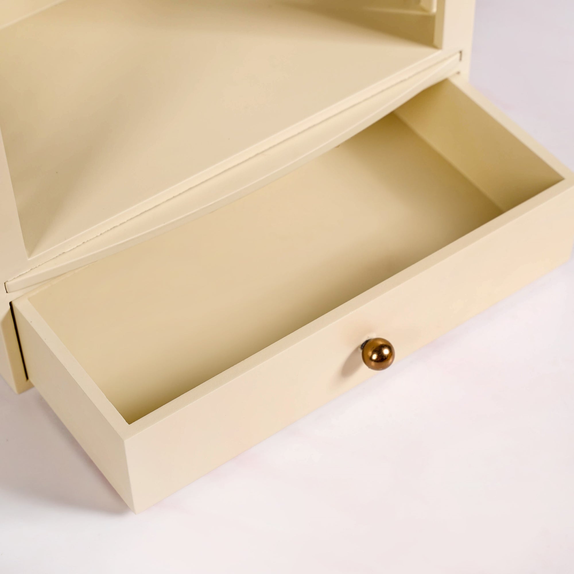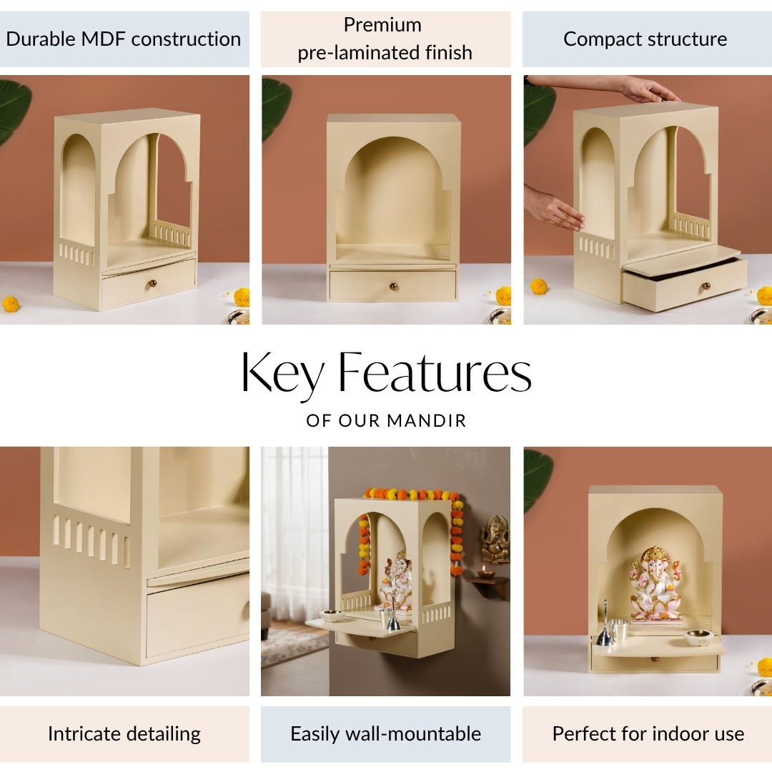 Design: Crafted from durable MDF, the home temple showcases a warm beige hue that radiates calm and harmony. The arched doorway takes cues from temple silhouettes, while the clean lines and minimal detailing make it perfect for both classic and modern interiors. Two holes on the back ensure that the mandir can also be wall-mounted. The matte finish and elegant brass knob add subtle sophistication, giving your sacred space a refined yet inviting presence.
