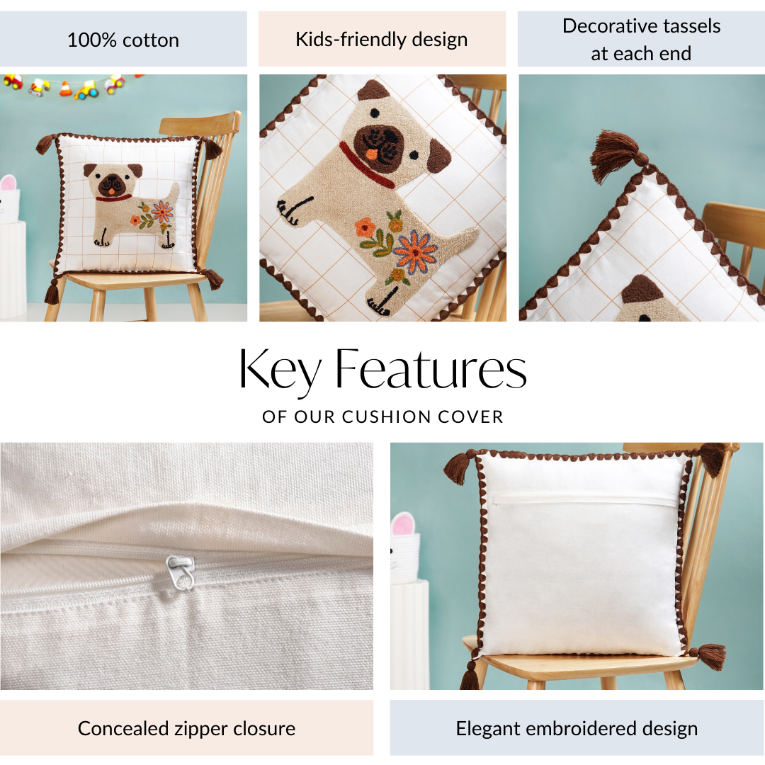 Design: It is made with breathable cotton and set against a gentle grid. Each corner is accented with a tidy tassel, and embroidered borders outline the pattern. A vibrant dog motif takes centre stage, adding a cheerful twist. The concealed zipper keeps the look seamless, and the classic square shape rounds it all off. After washing, the cotton may shrink slightly, giving the cover a naturally snug fit. With a light press, the fabric settles back into its original shape, keeping everything looking fresh.