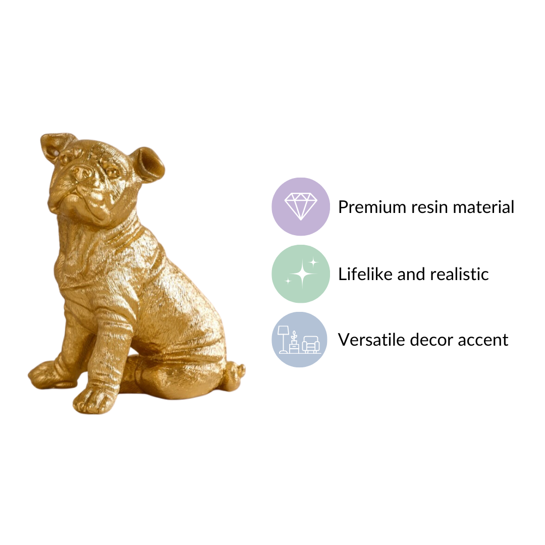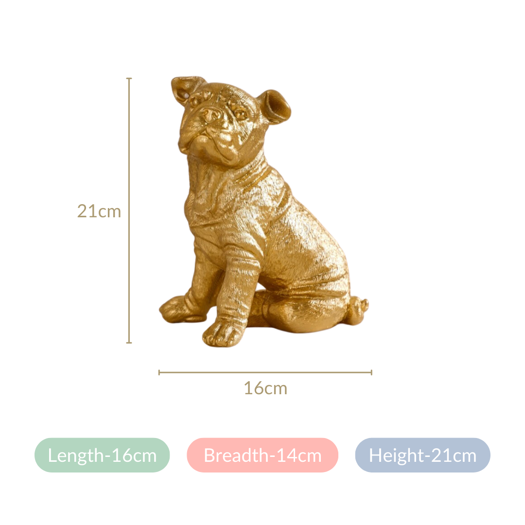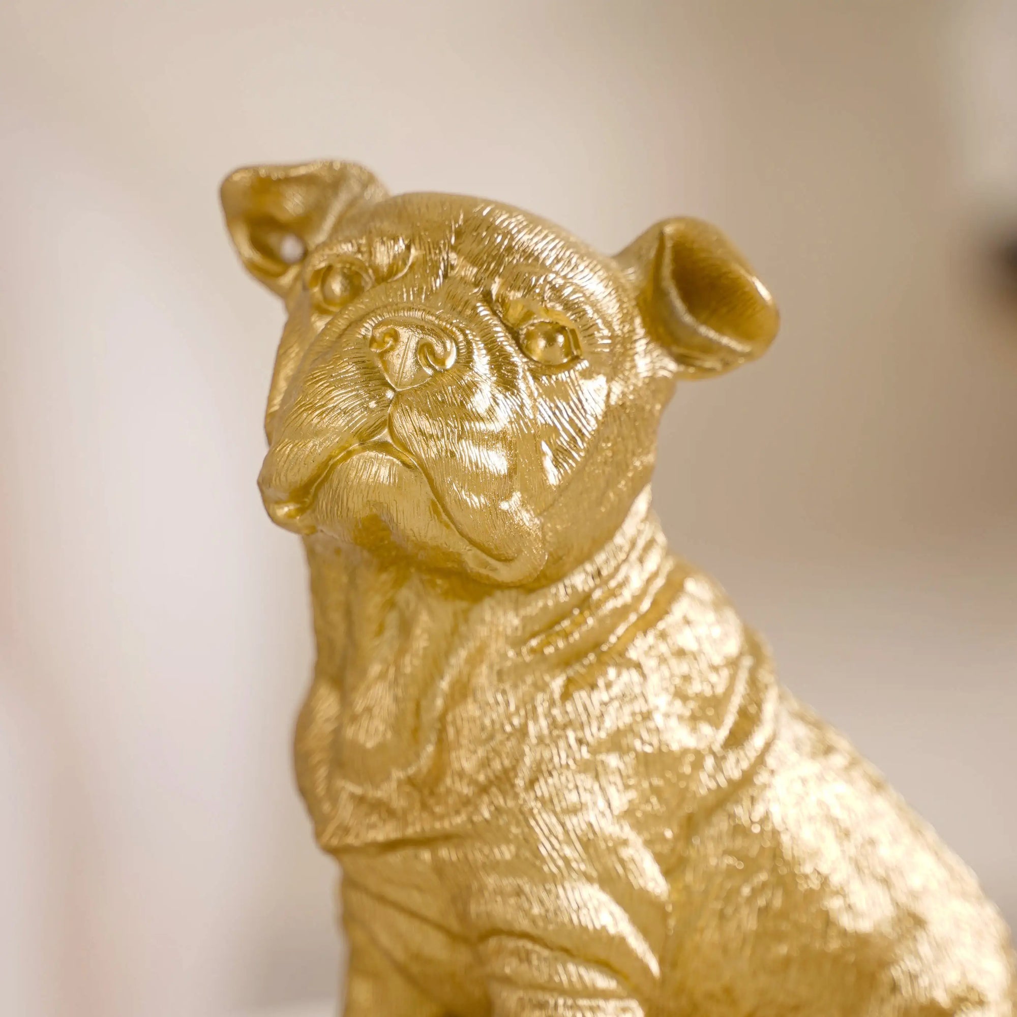 Prepare to be captivated by our incredibly endearing bulldog resin showpiece! Capturing the very essence of this cherished breed, the piece portrays a seated bulldog with an enchanting gaze that effortlessly tugs at your heartstrings. Its golden hue infuses an air of sophistication and warmth, beautifully complementing the bulldog's lovable nature. Each intricate detail has been meticulously crafted to deliver a lifelike and utterly heartwarming representation of this loyal and endearing creature. If you're a dog lover or a lover of animals in general, this showpiece is destined to steal your heart.