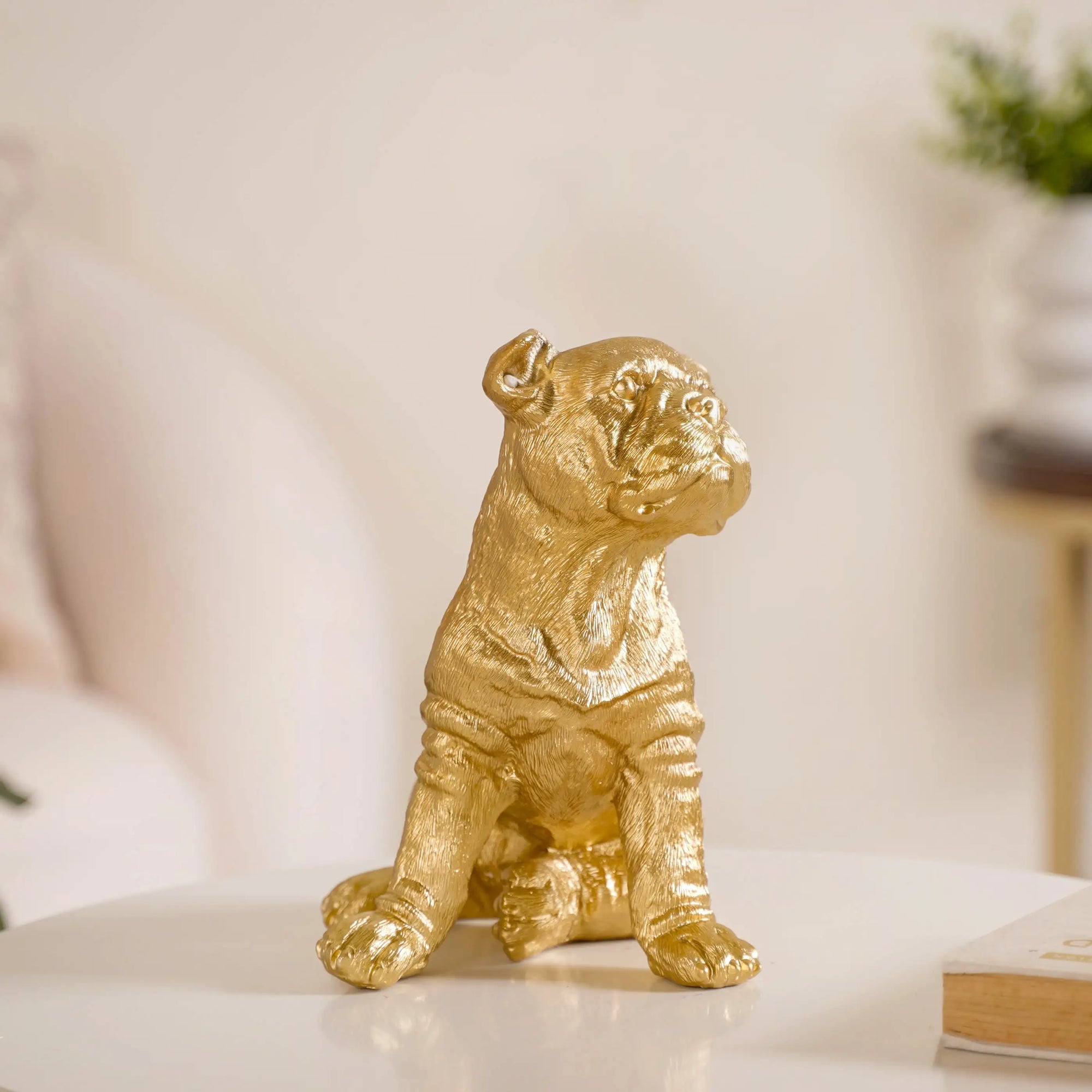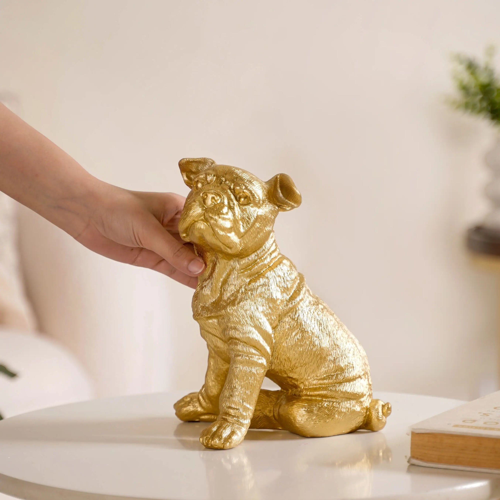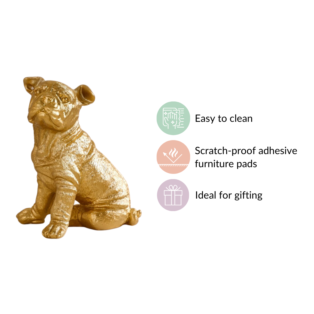 Prepare to be captivated by our incredibly endearing bulldog resin showpiece! Capturing the very essence of this cherished breed, the piece portrays a seated bulldog with an enchanting gaze that effortlessly tugs at your heartstrings. Its golden hue infuses an air of sophistication and warmth, beautifully complementing the bulldog's lovable nature. Each intricate detail has been meticulously crafted to deliver a lifelike and utterly heartwarming representation of this loyal and endearing creature. If you're a dog lover or a lover of animals in general, this showpiece is destined to steal your heart.