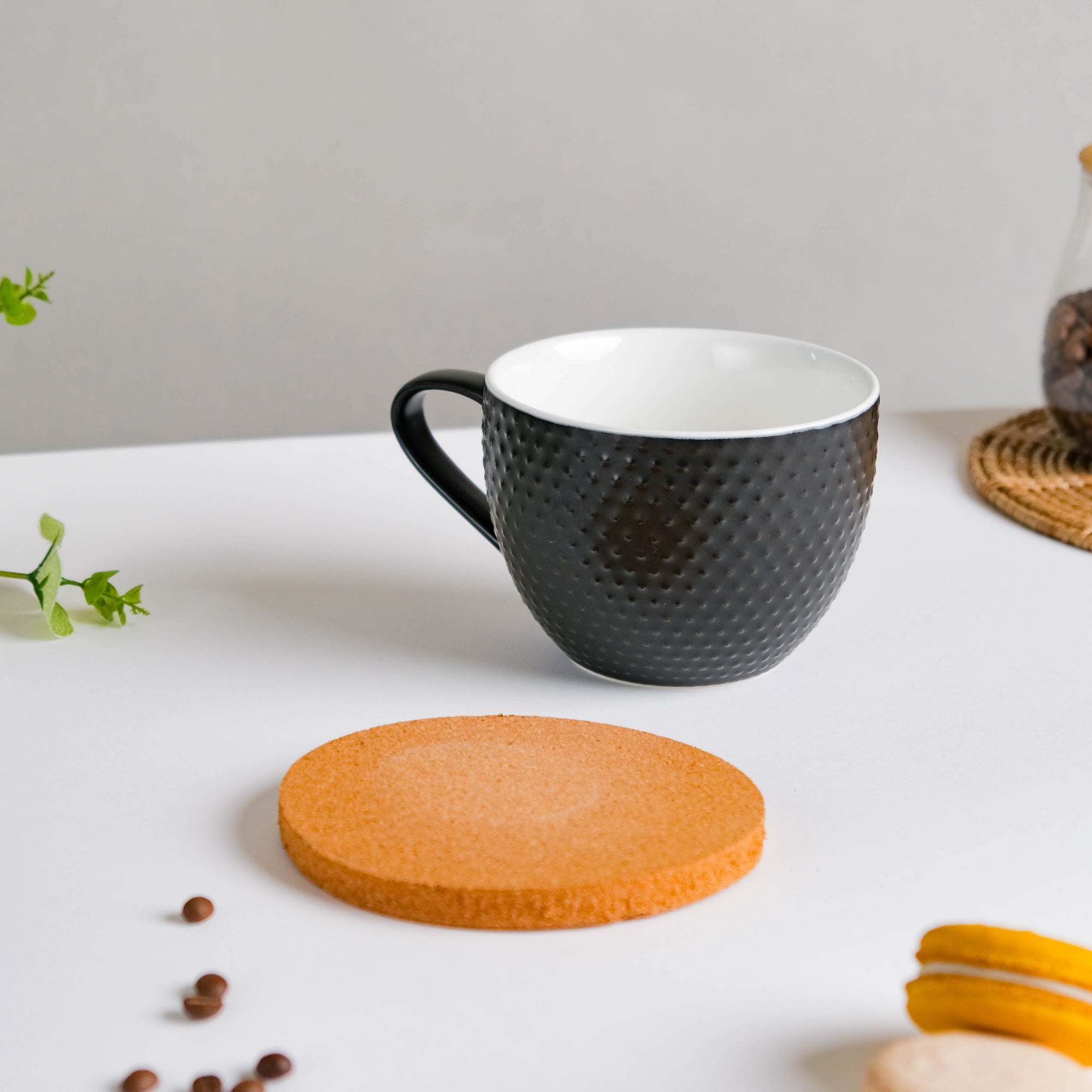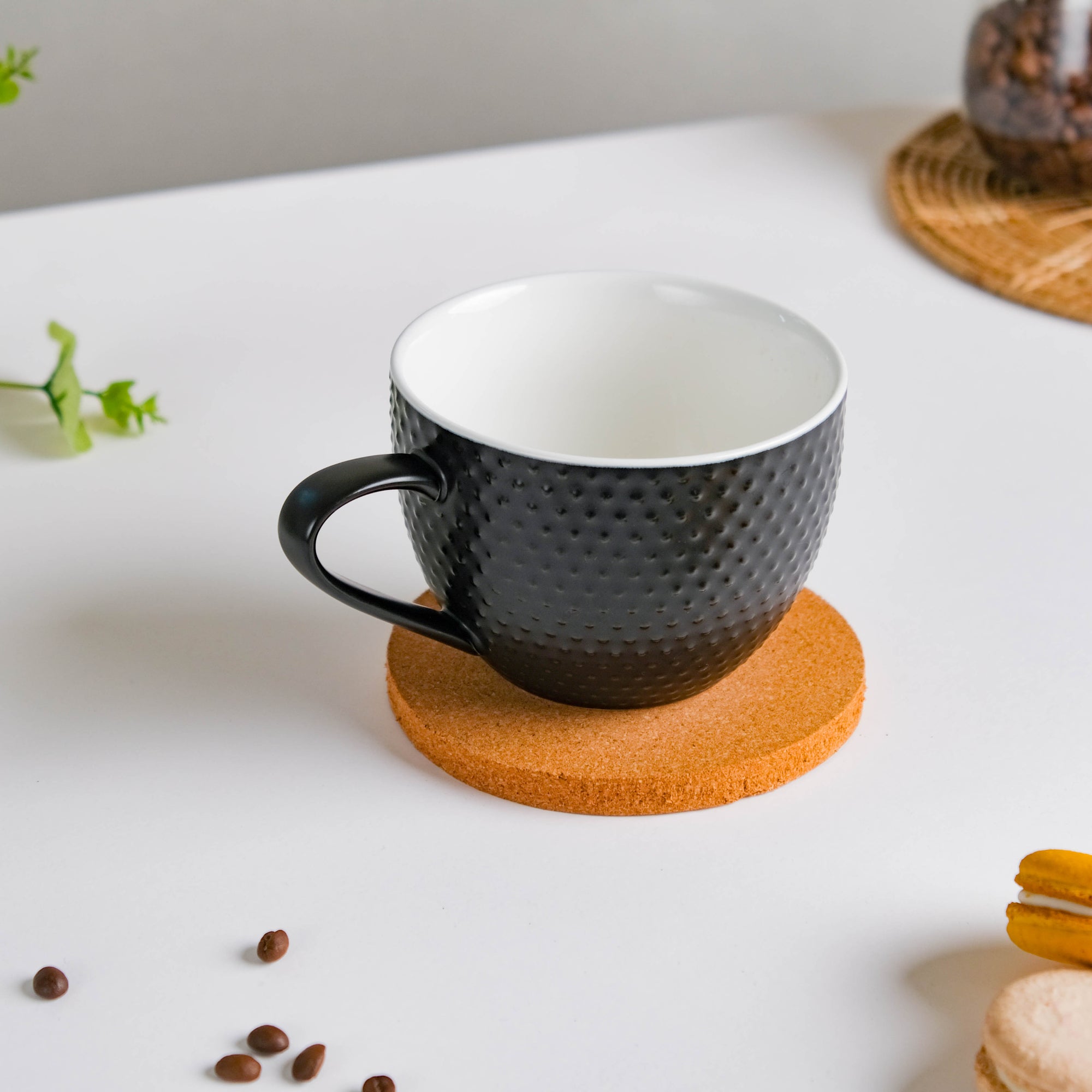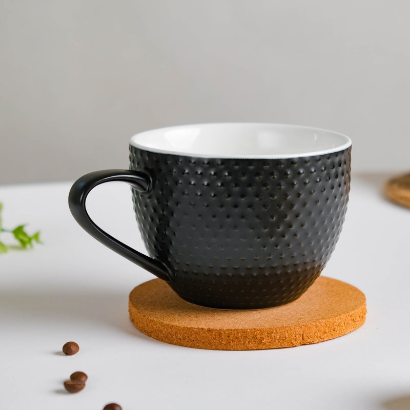 The modish black ceramic cup with handle, sheathed in a texture of dots, qualifies as a magical inclusion to any curator's cupboard. Warm liquids, such as hot chocolates, or soups, can be served in the black-colored ceramic cup with an inner coating of white, supported by a wooden coaster, to help in keeping the hot liquid without burning hands while gripping it; the handle, too, assures it. The cup with a handle may also be used to serve wonderful desserts like fruit cream or mug cake, as well as for serving cornflakes or porridge when used as a breakfast cup. The cup's coaster is designed to match the cup's simplicity and refinement and can also be used as a lid to aid in keeping the meal warm within the cup. The cup is microwave, oven and dishwasher safe but the coaster? Just wipe clean.