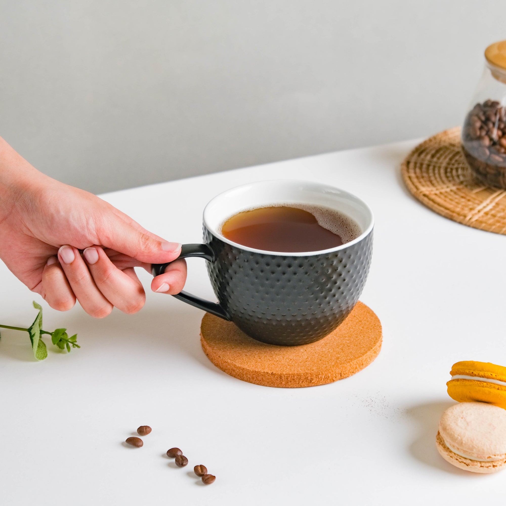 Nestip: Pour a fresh cup of coffee and enjoy a stroll down the memory lane with the dotty modern black ceramic cup on a rainy afternoon as you use the coaster for keeping it safely on a cloth, tabletop, or tablemat.