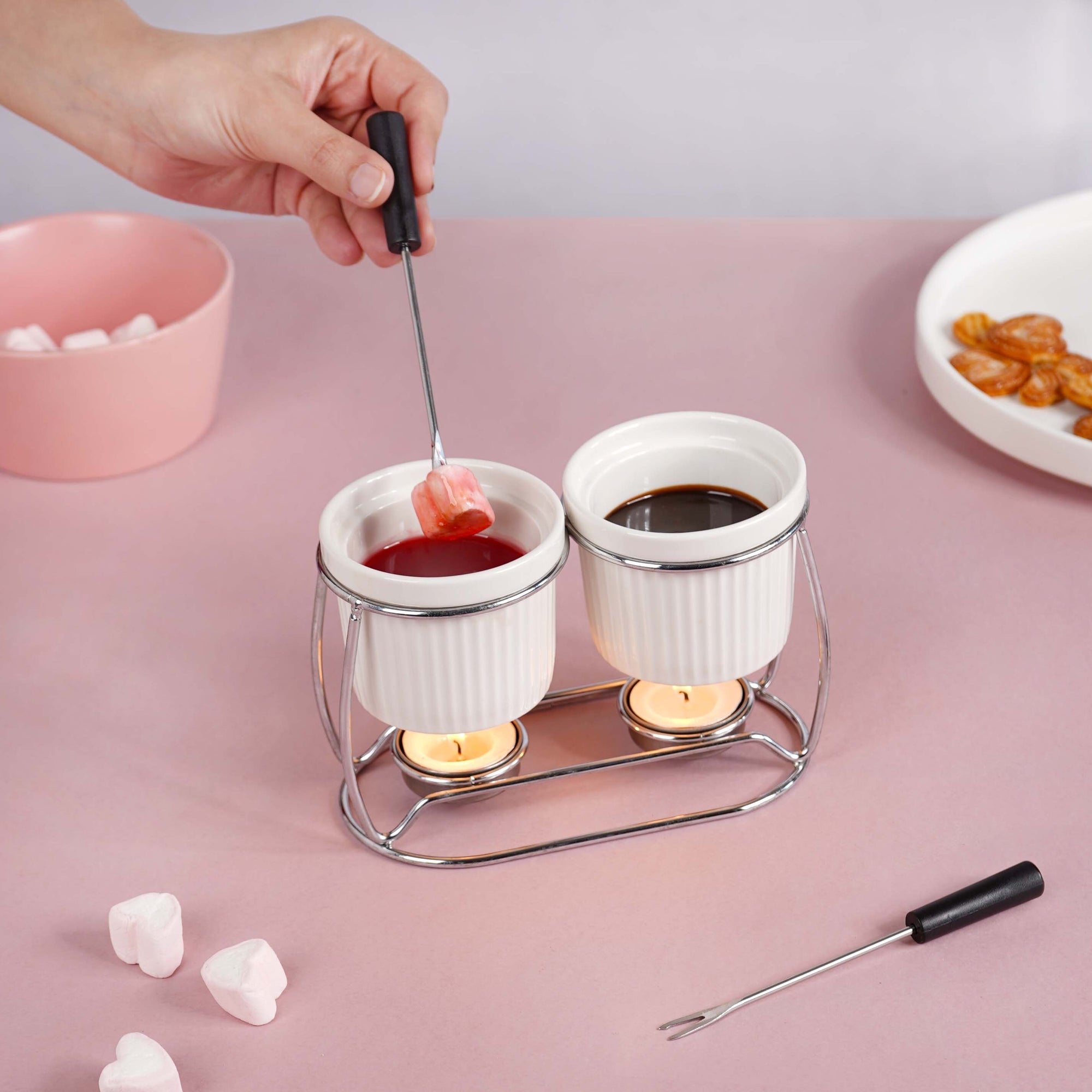 Design: This set features two pristine white ceramic pots, each adorned with a subtly ribbed texture that exudes timeless sophistication. The sleek, modern metal stand supports the pots and holds two tealight candles to keep your fondue perfectly warm while adding a touch of contemporary flair. The black-handled metal skewers complete the look, offering both style and function with every dip.