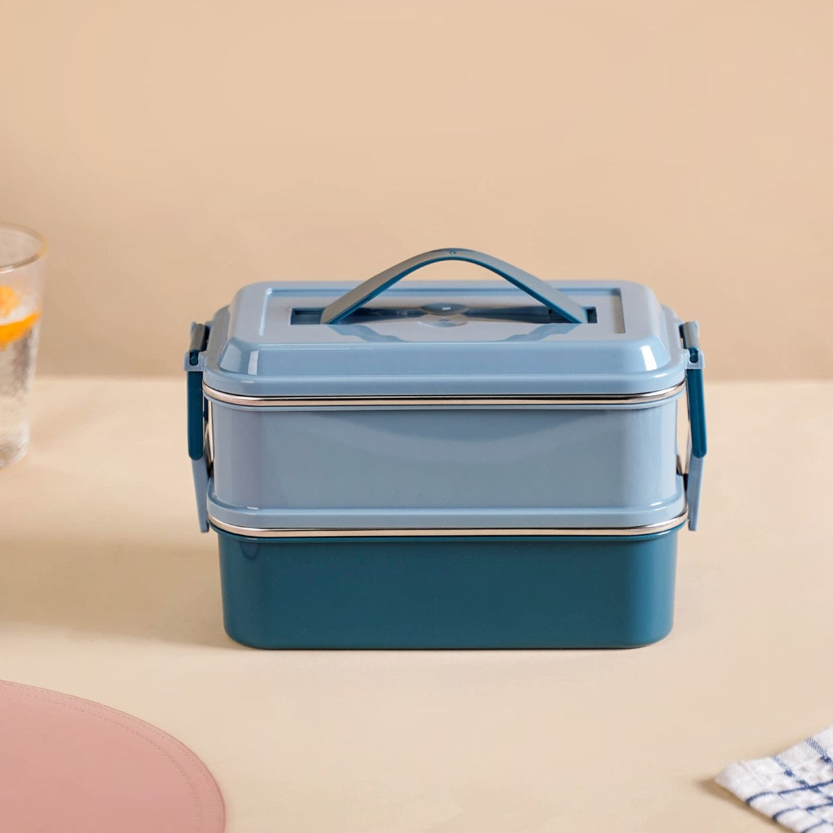 The blue double-decker lunch box is meticulously crafted to adhere to the highest standards of food safety. It features premium 304-grade stainless steel interiors so that your food remains untainted by any harmful substances. Additionally, the BPA-free PP exteriors further contribute to a worry-free meal experience.