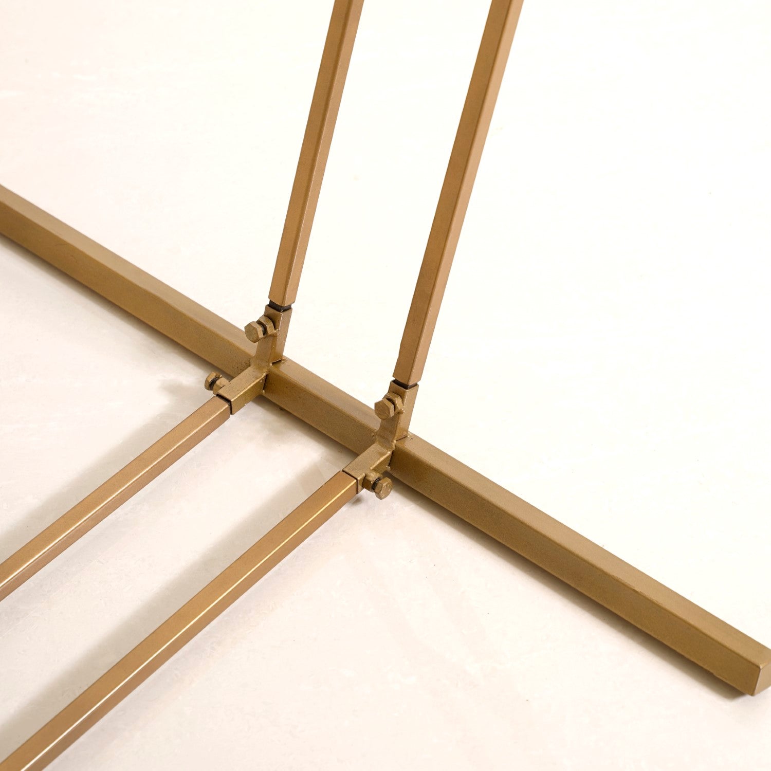 The gold powder-coated finish of the metal backdrop frame provides a neutral yet luxurious base that complements a wide range of colour schemes. To ensure it fits your event’s colours, choose decorations that match or contrast well with the gold. For example, pair the gold with deep reds and greens for a rich, festive look, or use pastels and whites for a soft, romantic atmosphere.