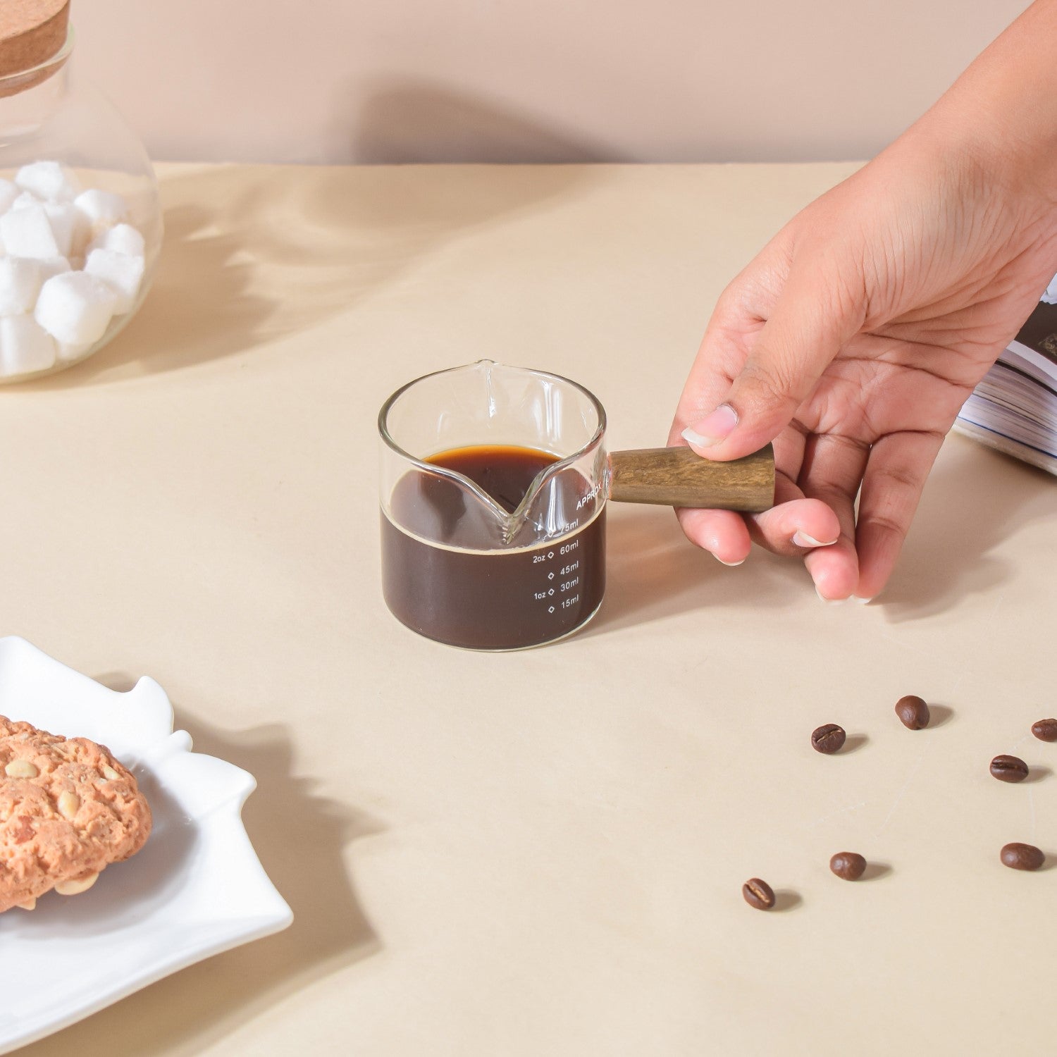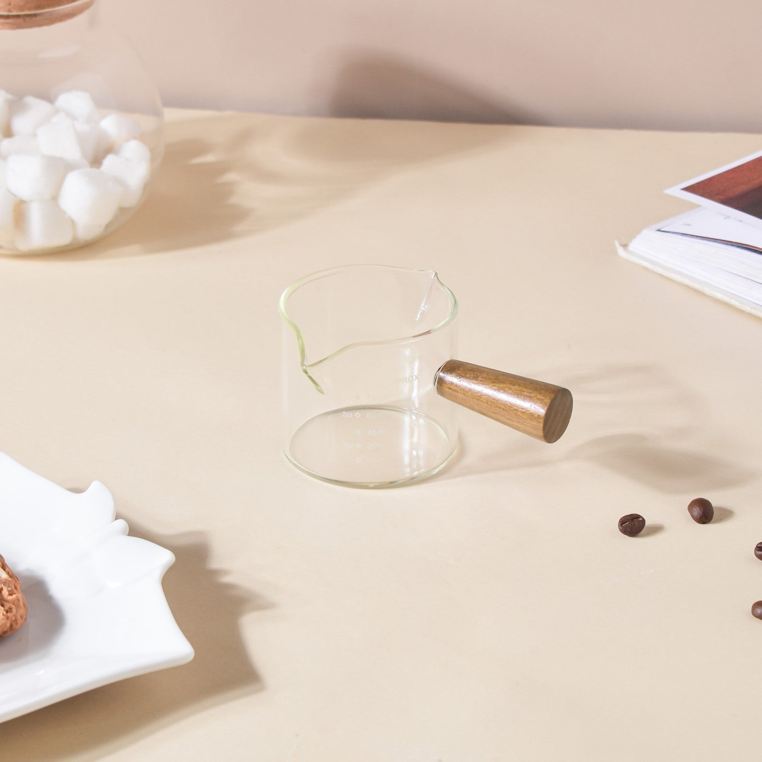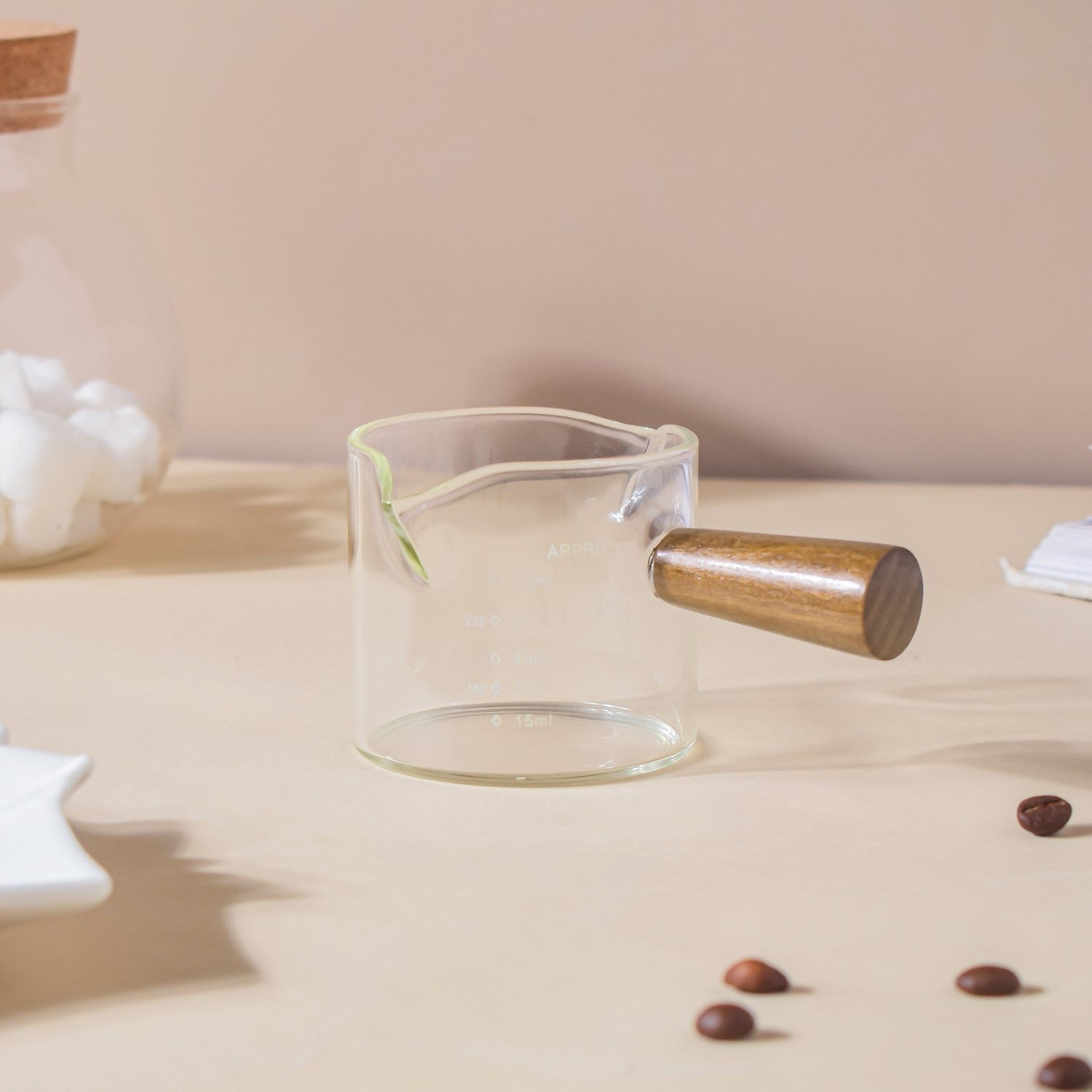 The double mouth glass measuring cup with a wooden hand is ideal for measuring dry ingredients for cooking or baking as well as liquids. Mix delicious beverages, craft cocktails, make cake batters, and more in the cup with handle. One can easily measure and transport smaller quantities without spilling them using the cup.
