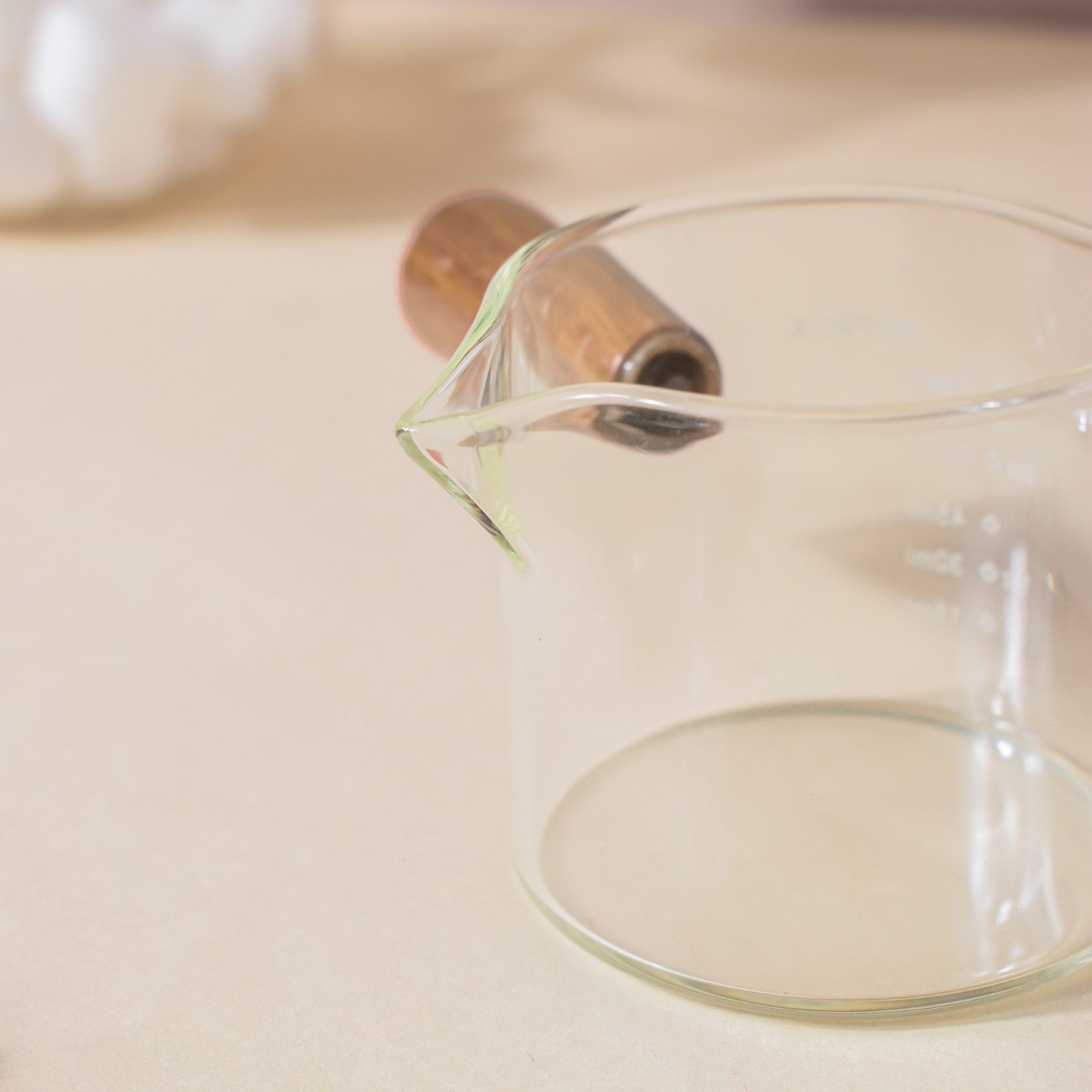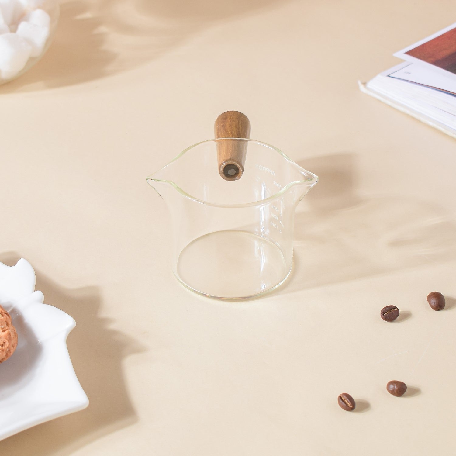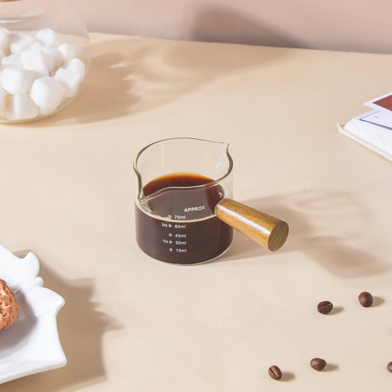 The double mouth glass measuring cup with a wooden hand is ideal for measuring dry ingredients for cooking or baking as well as liquids. Mix delicious beverages, craft cocktails, make cake batters, and more in the cup with handle. One can easily measure and transport smaller quantities without spilling them using the cup.