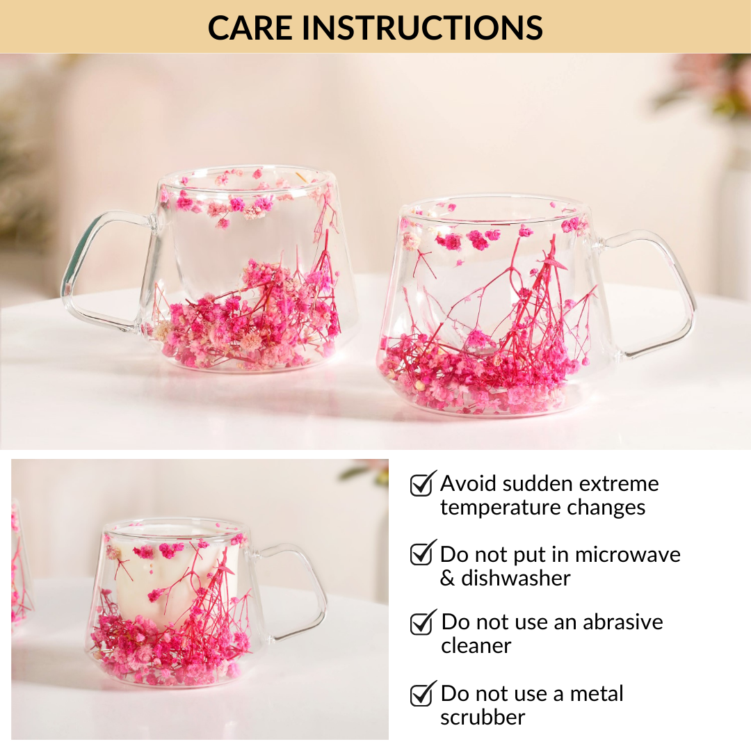 Design: Crafted from premium borosilicate glass, this transparent double-walled mug set features an inner chamber gracefully suspended in the middle. The outer layer is adorned with organic pink flowers, creating a visually floating effect. An ergonomically designed handle completes the look, offering both comfort and a refined silhouette.