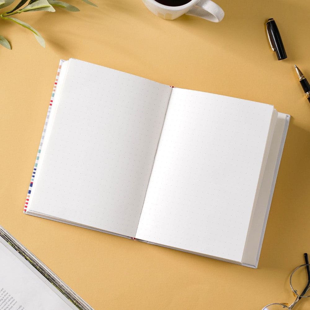 Notebooks help us collect our thoughts and ideas in one place, so having a notebook is not only a great way to recollect daily activities, journalling and long-term aspirations, but it is also a healthy habit when used as a gratitude journal. In the hardbound notebook, make a note of your new year's resolutions, study notes, or a to-do list. The 104 pages in the hard-bound 2023 diary are divided into 34 ruled pages, and 34 pages with dots. The dots are presented in the shape of mini square boxes, helping you to create your own customized planner by easing the process of drawing straight lines and securing neatness. The stationery element can be gifted as a birthday or Christmas gift to a sibling, colleague, or best friend.