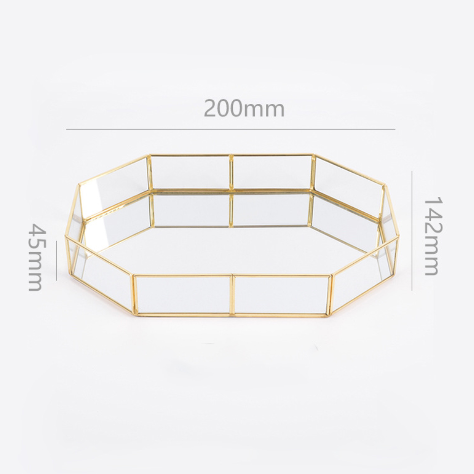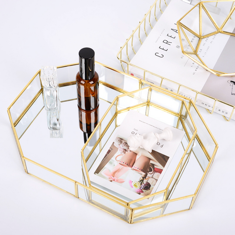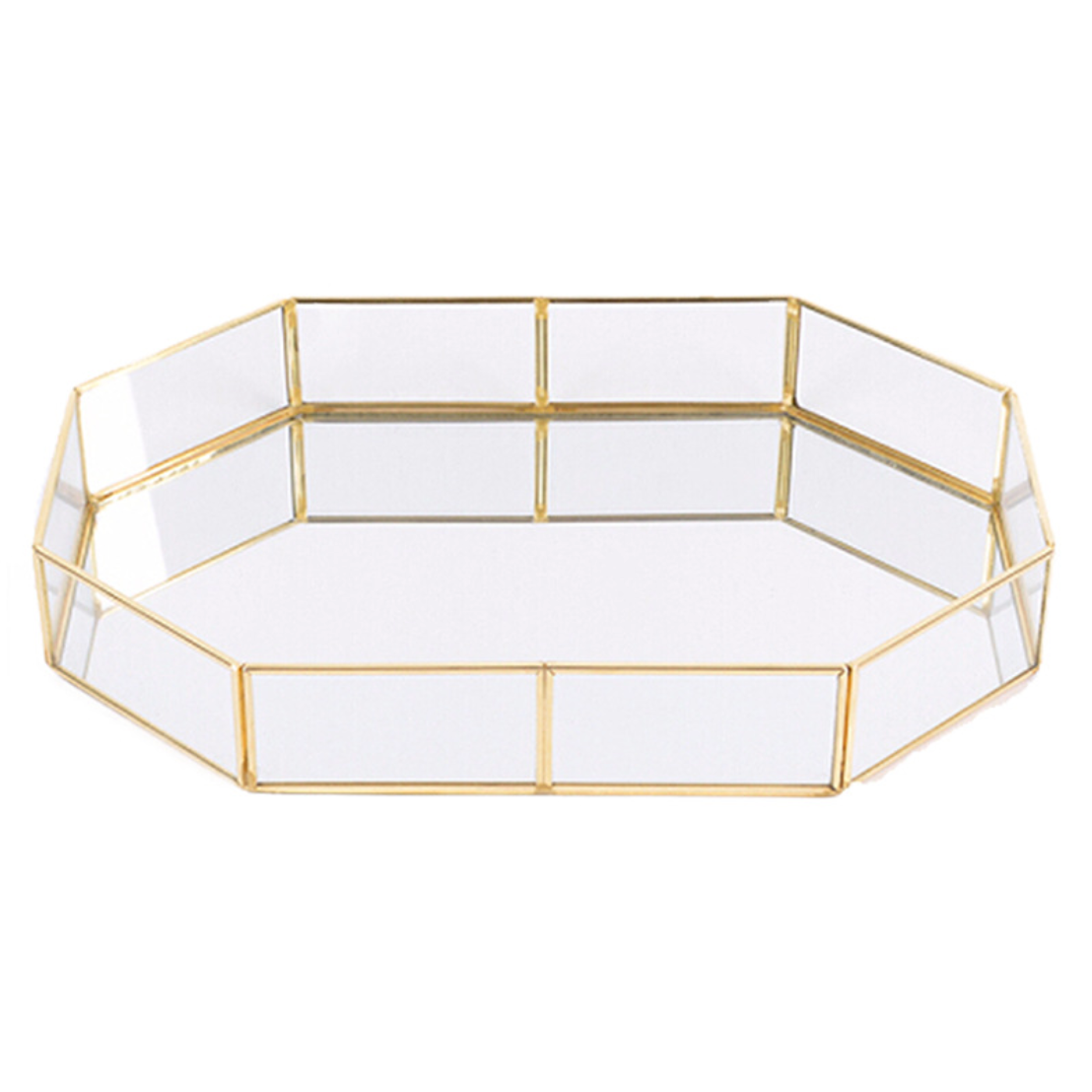 A mirror tray with sides made of glass and metal rims in the shape of an octagon. The tray can sit pretty on any table top like a dressing table as a jewellery organiser or accessory organiser. It can also be kept on a centre table with some showpieces or planters. The tray has a deluxe touch to itself which can add opulence to the home decor.