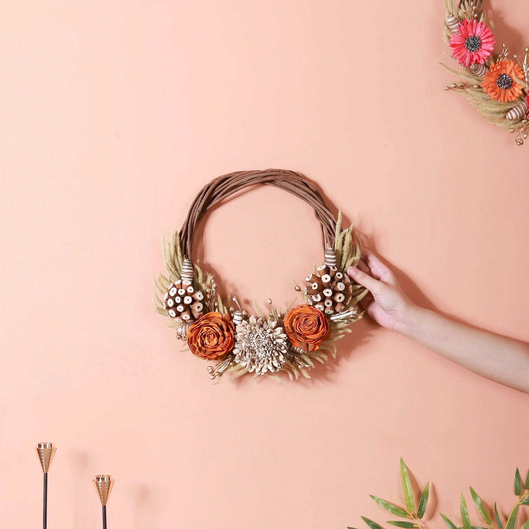 The wreath boasts a stunning assortment of dried artificial elements. The wreath's foundation is a saba grass ring, intricately intertwined. The other decorative elements used in the wreath are vibrant shola flowers and shola balls, which add a pop of colour to the whole setup. Finally, to top it off, dried pampas grass has been studded in the arrangement to add some rustic charm to this beauty.