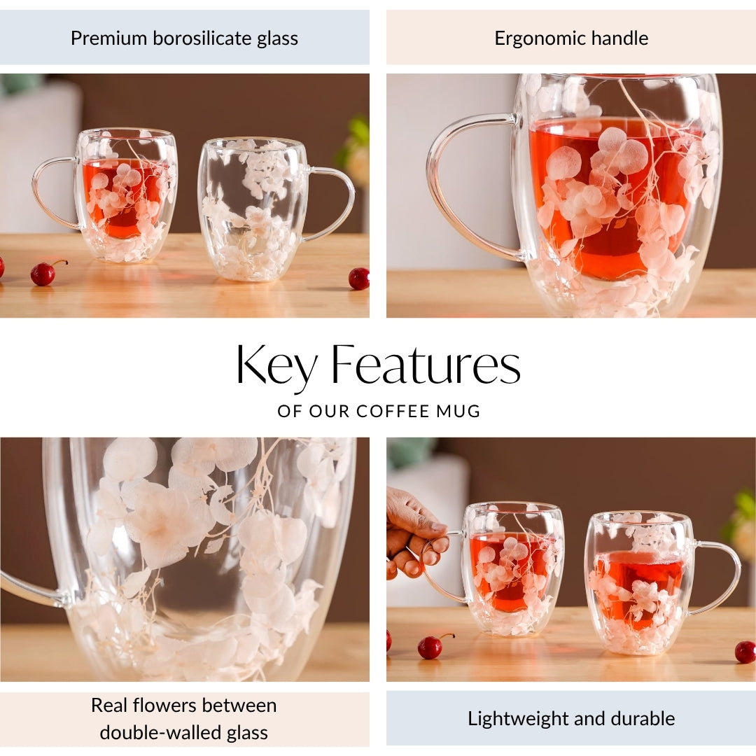 Design: Crafted from premium borosilicate glass, this delicate transparent coffee mug set captures the essence of calmness. Its softly rounded silhouette, gently tapering base, and gracefully curved clear handle give it an effortlessly elegant look. What makes it truly special is the cluster of delicate, peachy-white florals nestled within the double-wall base, adding a dreamy, floral charm to every sip. It's like a little bloom on your table, no vacation ticket needed!