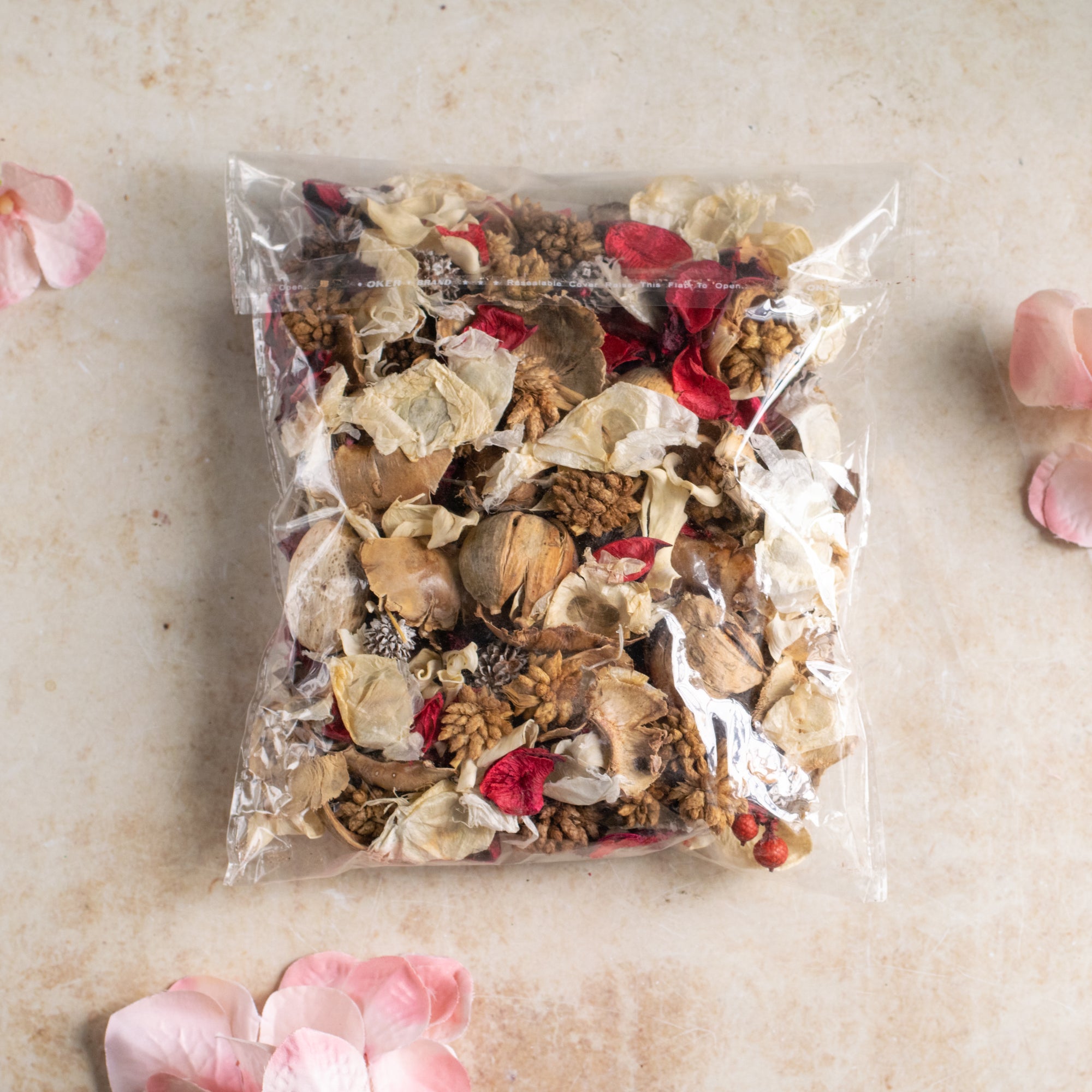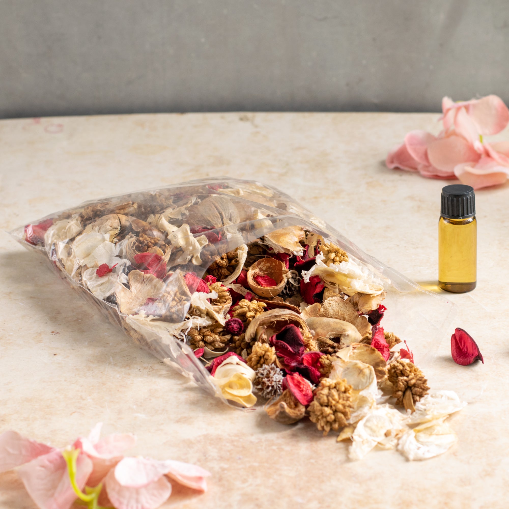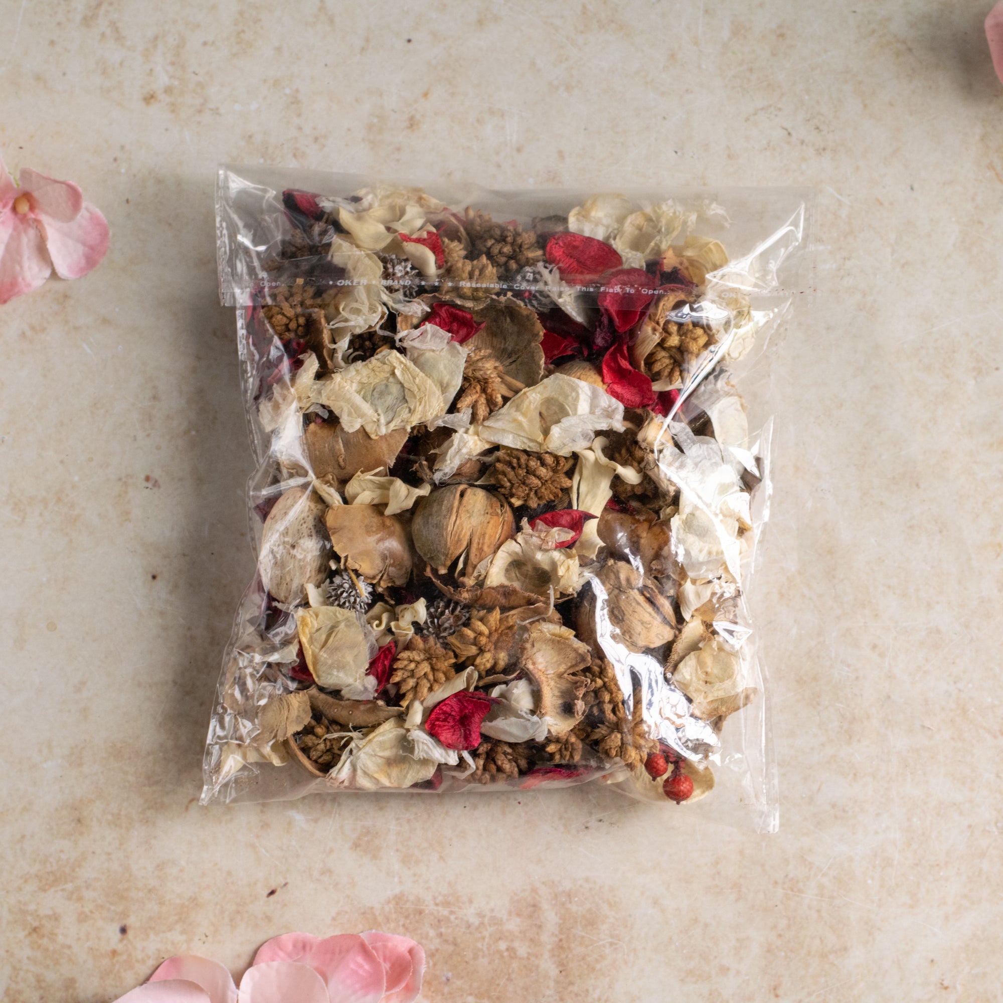 The dried flower potpourri includes a diverse mix of naturally dried flower petals chosen for their aesthetic appeal. The potpourri in itself does not have any fragrance. Instead, it comes with a choice of 8 fragrances - lavender, lemongrass, mogra, jasmine, vanilla, orange, raspberry, and strawberry.