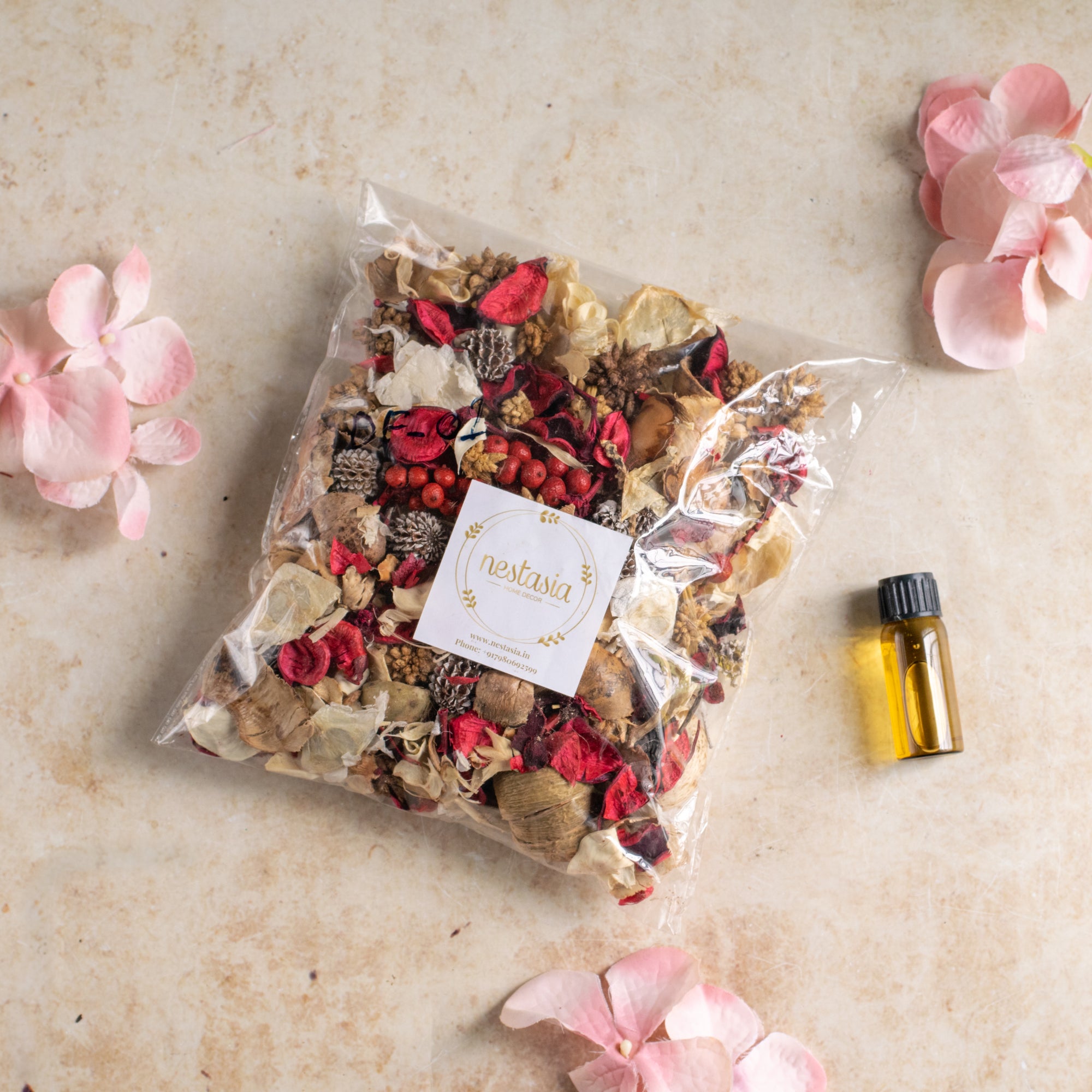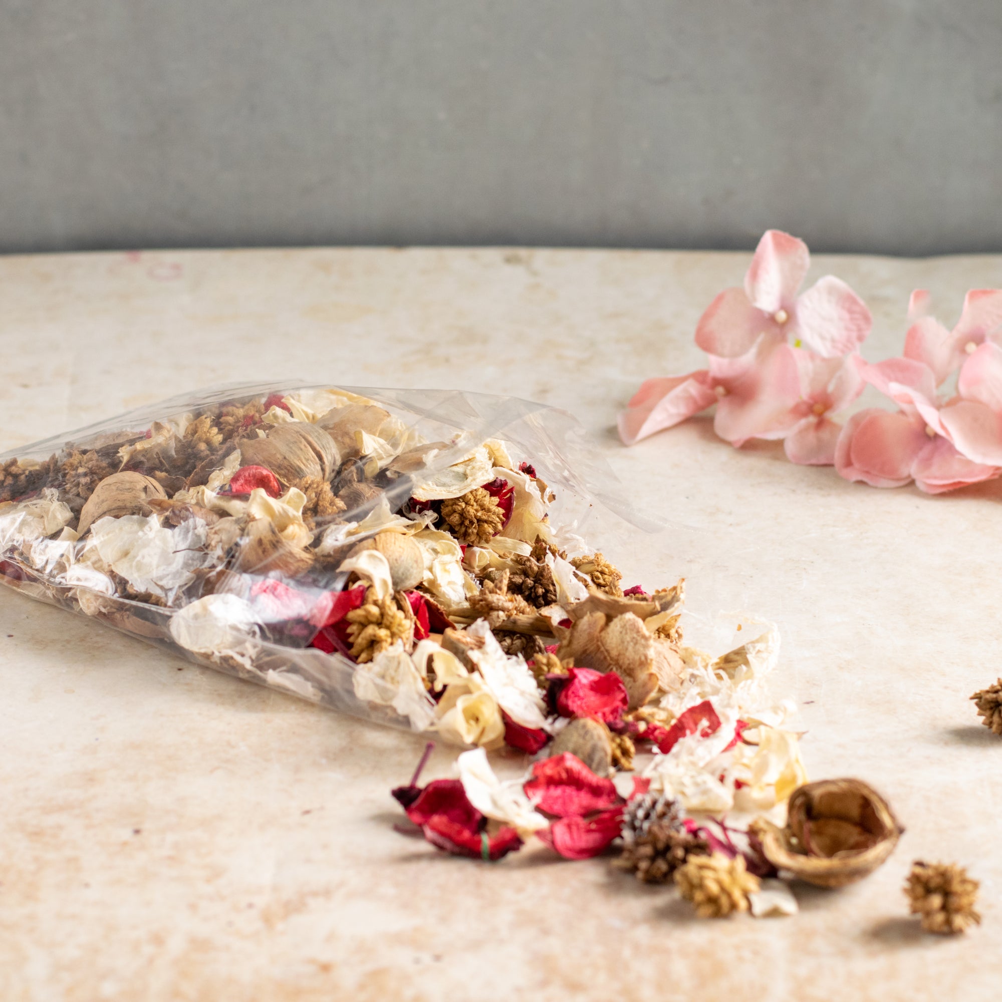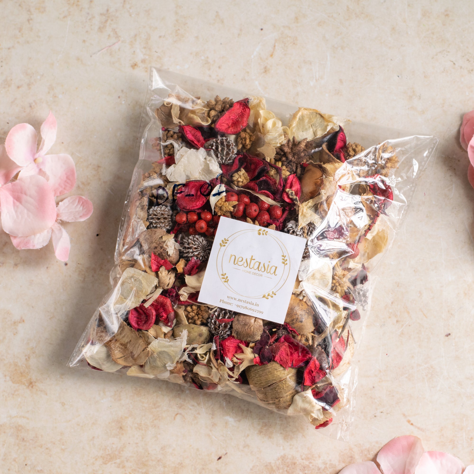 The dried flower potpourri includes a diverse mix of naturally dried flower petals chosen for their aesthetic appeal. The potpourri in itself does not have any fragrance. Instead, it comes with a choice of 8 fragrances - lavender, lemongrass, mogra, jasmine, vanilla, orange, raspberry, and strawberry.