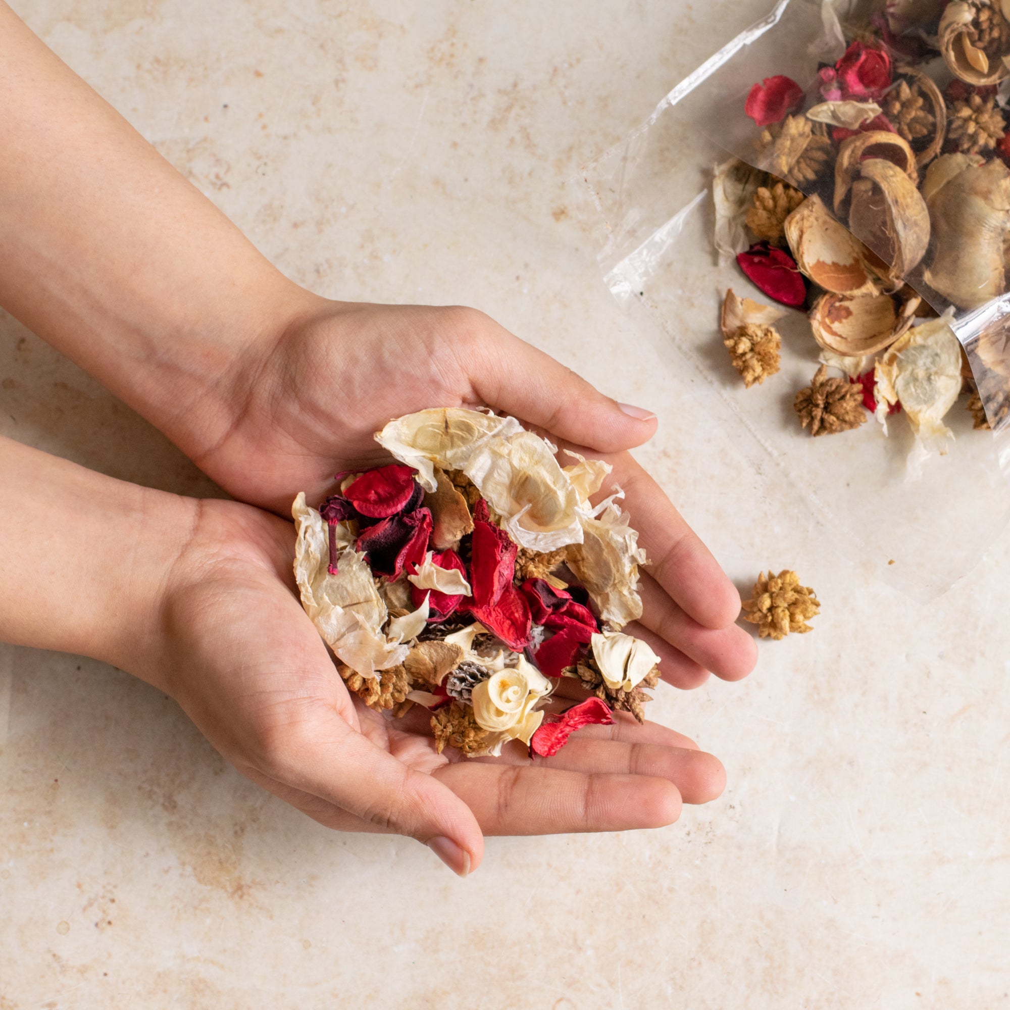 While the potpourri is made from organic, biodegradable materials, it's important to consider the safety of your fur buddies. Although the potpourri blend is not toxic, ingestion might cause some discomfort and warrant medical attention. We recommend keeping the blend away from pets' reach.