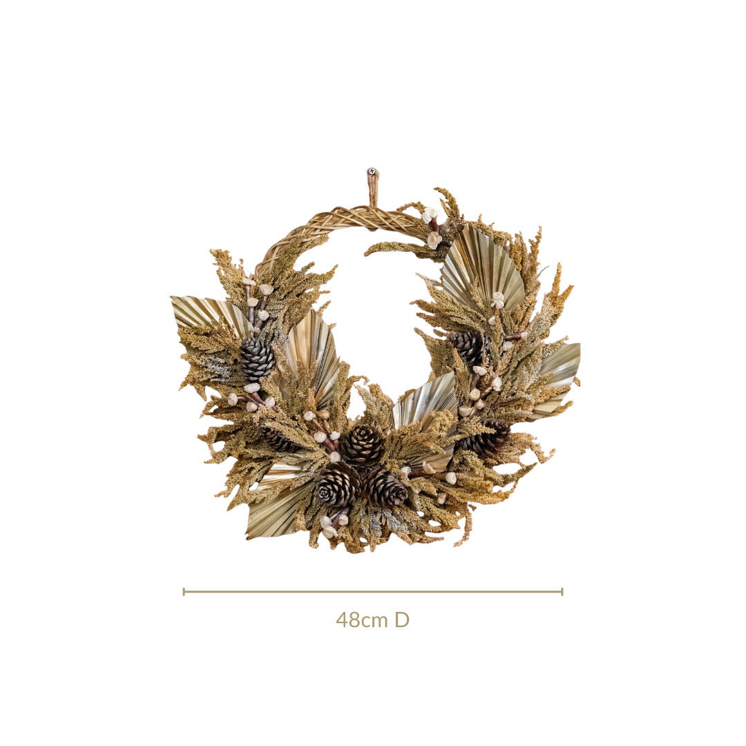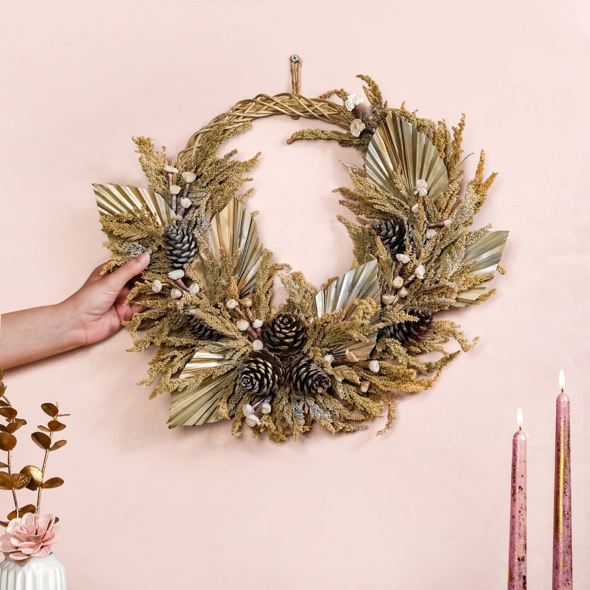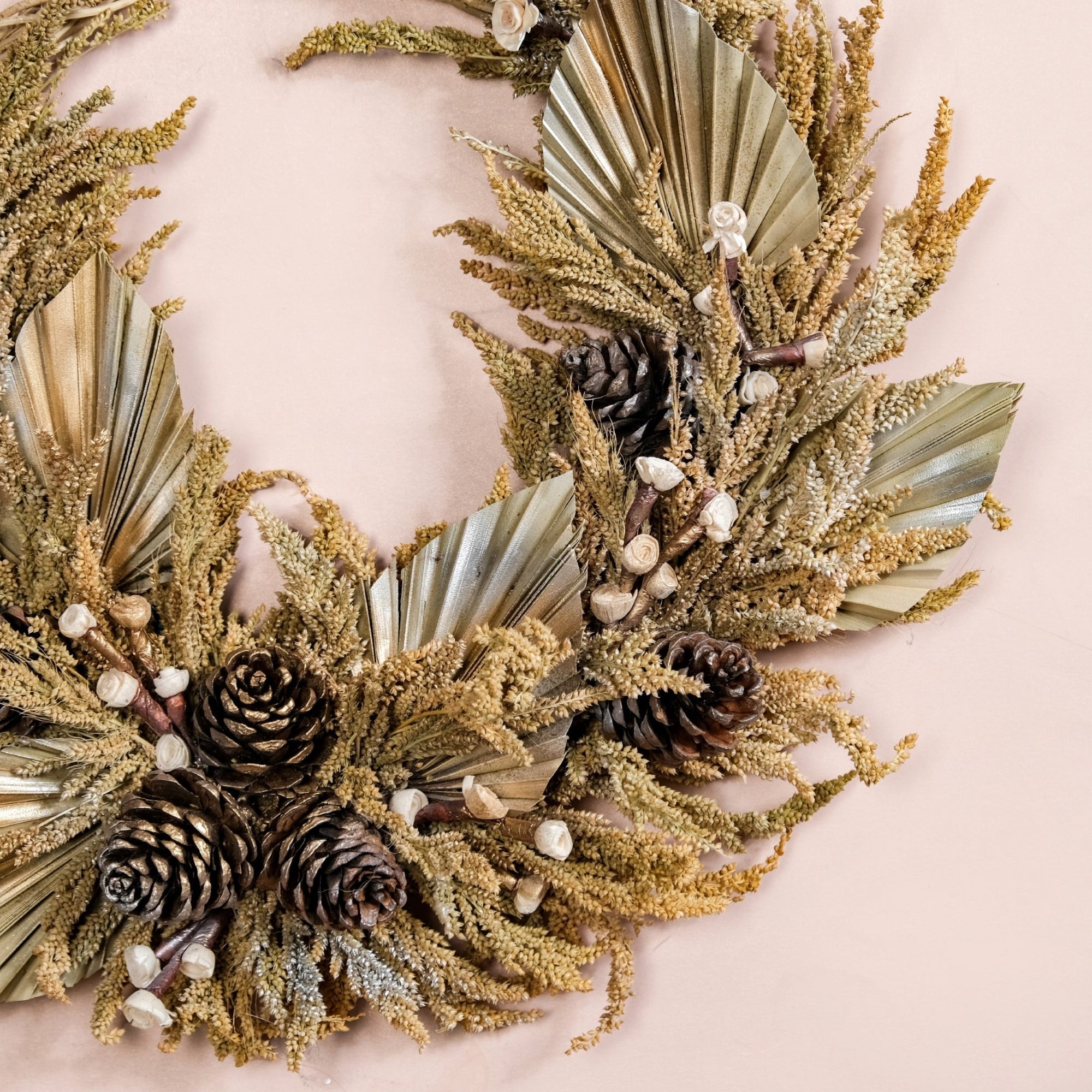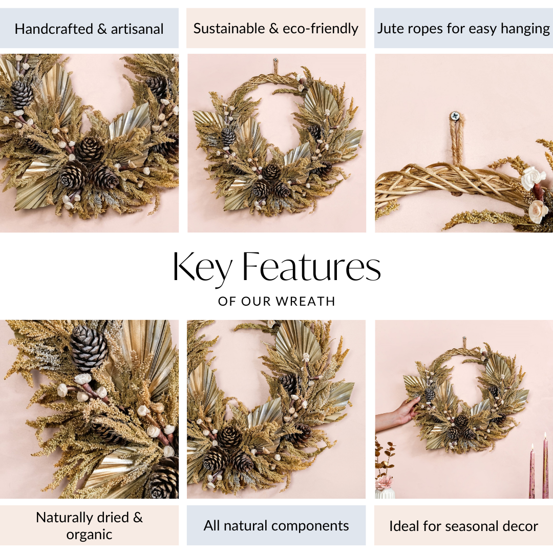Design: This stunning wreath is built on a rustic woven bamboo base, densely layered with warm, yellowish-brown dried grass for a rich, textured look. The design highlights dark brown pine cones contrasted by fan-shaped dried leaves and delicate, small Shola pith flowers. The use of all-natural components gives the wreath an organic, earthy shape and a beautiful monochromatic colour palette ideal for rustic Christmas decorations.