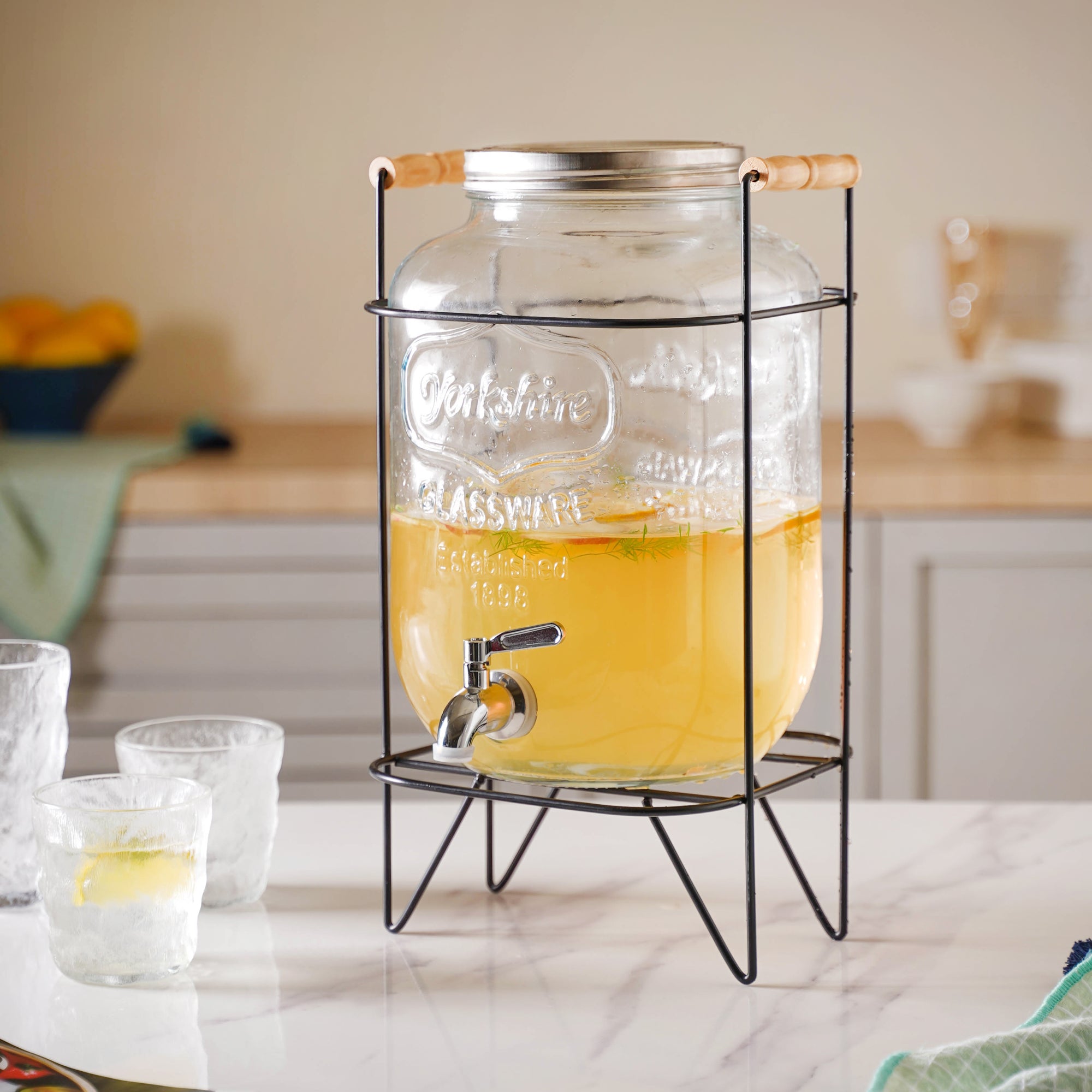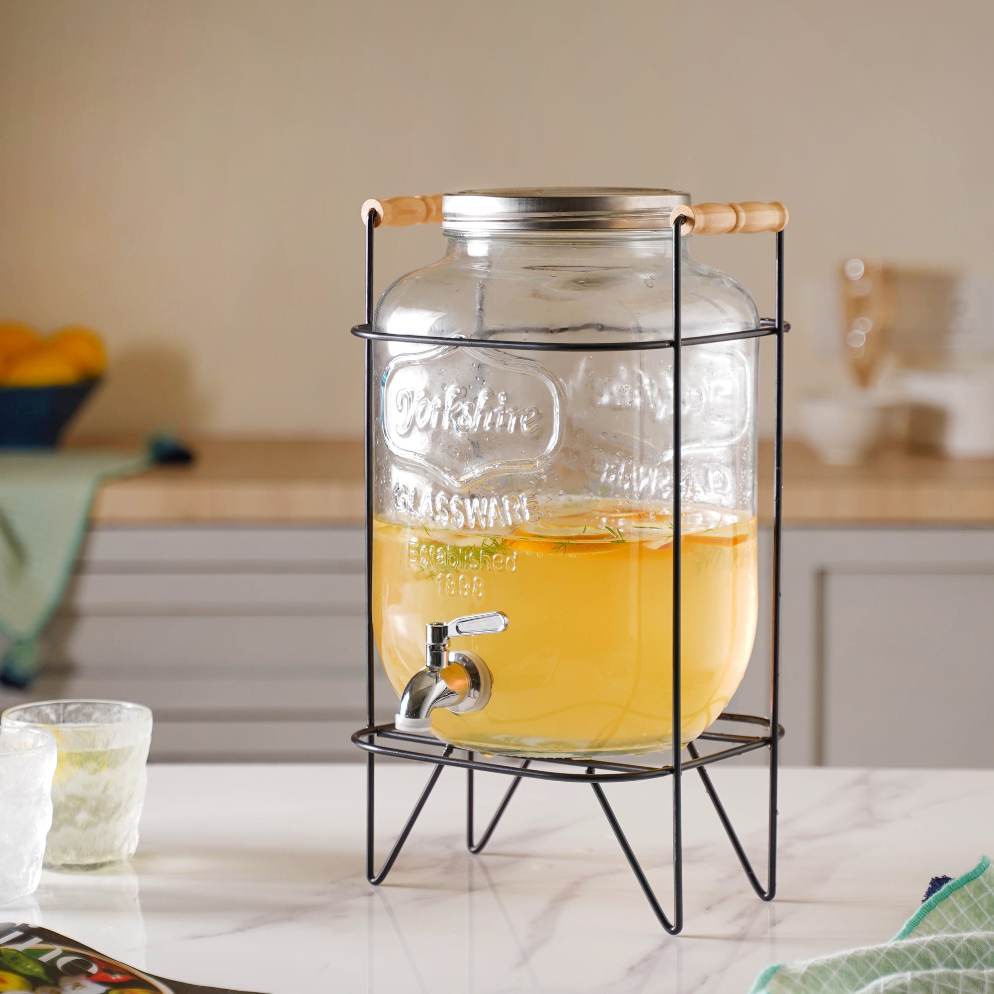 Designed in a humble style, yet having a modern utility finesse, the large glass water dispenser comes in an airtight jar shape and has a convenient stopper. Having a wide mouth and metal rim, it becomes easier to fill the barrel with fruit slices or ice. Even the process of cleaning is easier with the wider mouth. The glass beverage carrier is provided with a leak-proof faucet made of stainless steel. Inserted properly, the faucet gives out a balanced stream of water. The glass mason comes with highly transparent walls which ensures smooth visibility of whatever is inside. One can use it as a glass beverage dispenser during buffets, cookouts, and other celebratory setups. The 8L drink dispenser is simple and sleek and blends perfectly with minimalistic decor, be it at home or office. Plus, it is supported by a metal rack, with two wooden handles, which makes it easier to carry around.