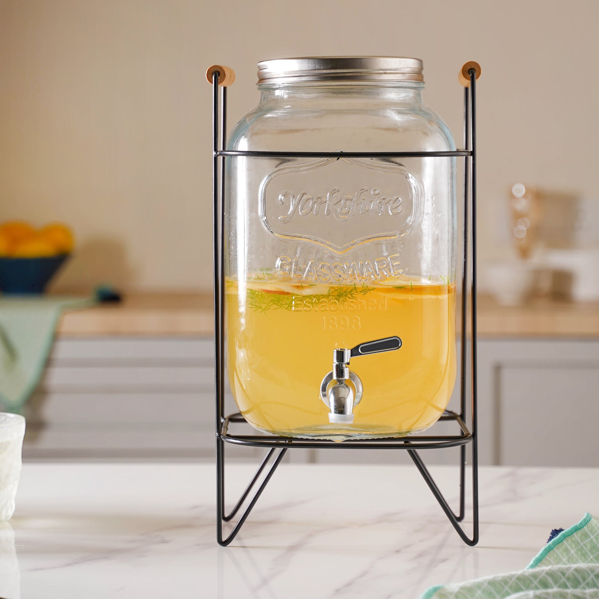 Colour: Transparent (glass jar), metallic (stopper, rim, and faucet), black (iron rack), yellow-brown (wooden handle)