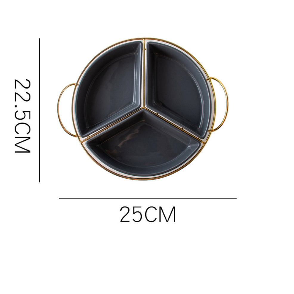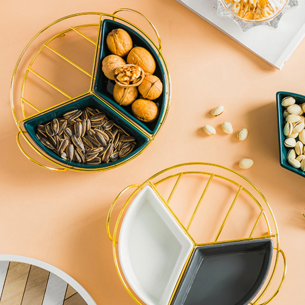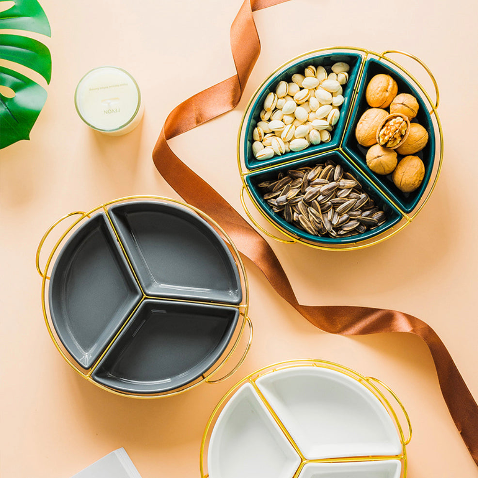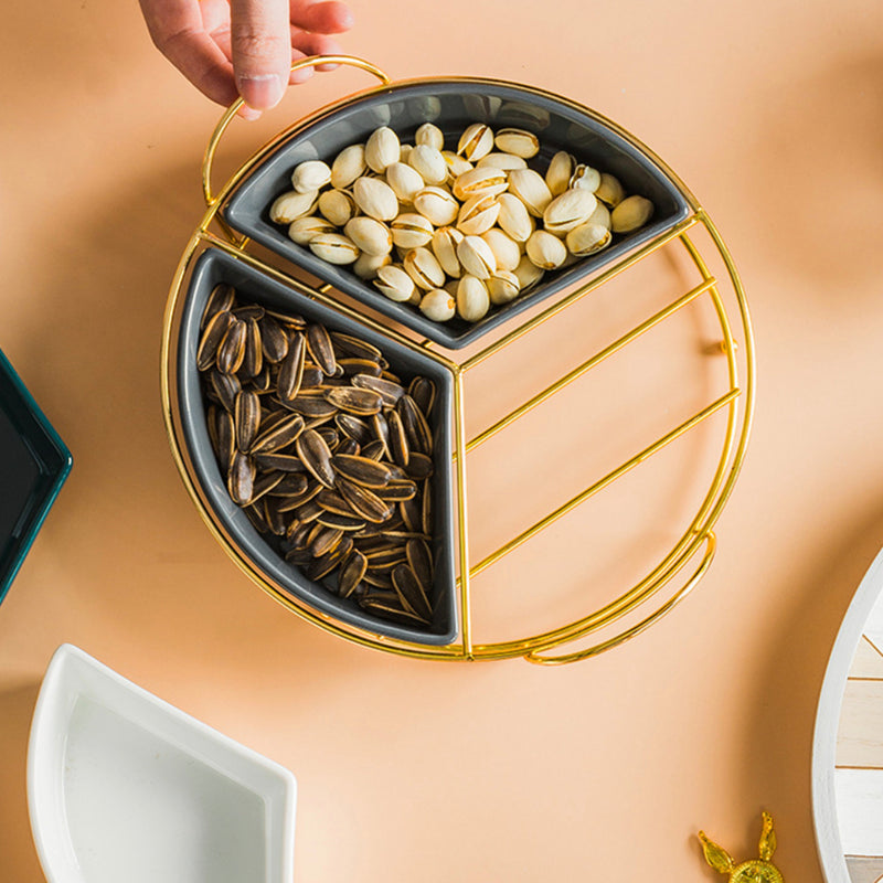 Dry fruits bowl platter that has a golden metal frame and comes in colour variants. The bowls look like a sectioned plated when placed in the metal frame that can also be used to serve candies and munchies to guests. The frame of the dry fruit serving bowl has handles that makes it easier to serve and makes the dry fruit tray look organised. Only the bowls can be placed in the microwave oven and dishwasher. Nestip: The sectioned bowl platter can be used to serve chips and dips
