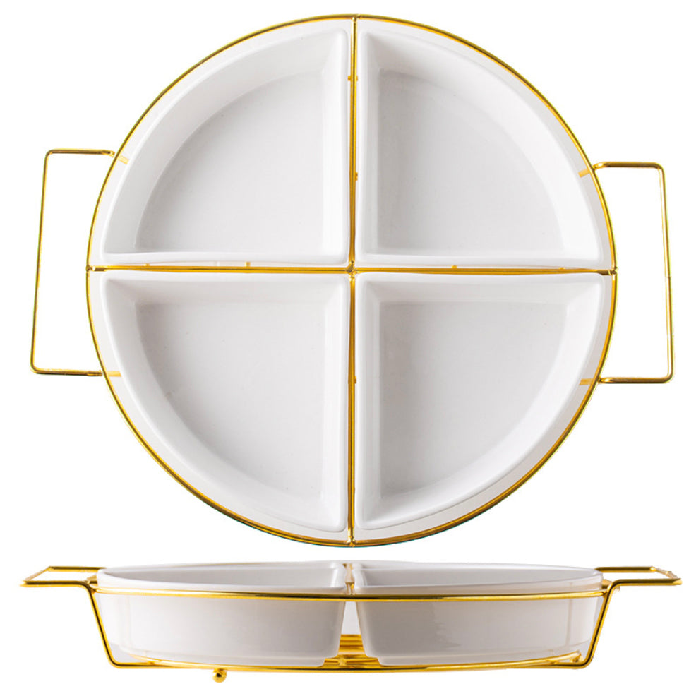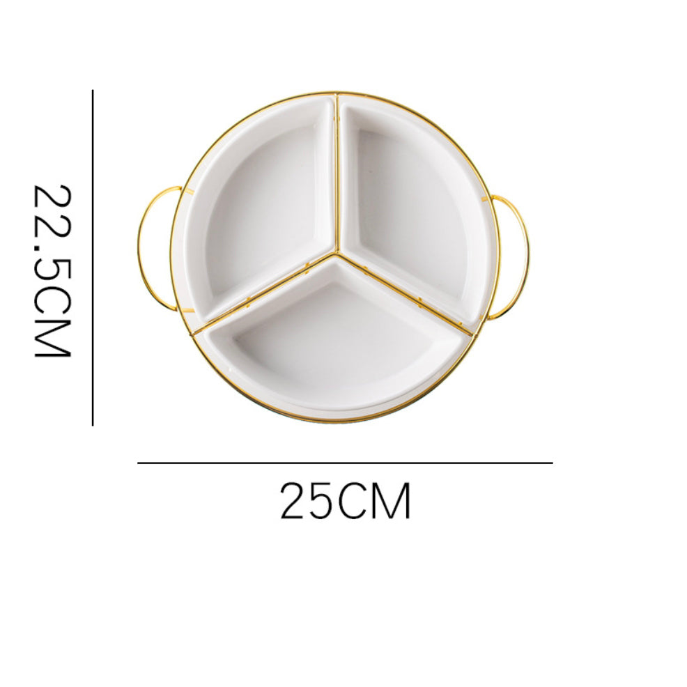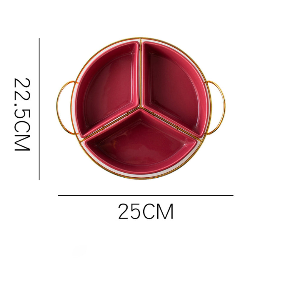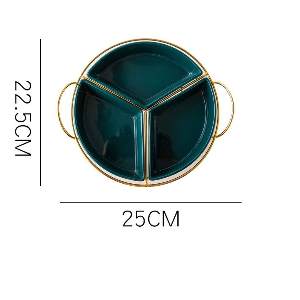 Dry fruits bowl platter that has a golden metal frame and comes in colour variants. The bowls look like a sectioned plated when placed in the metal frame that can also be used to serve candies and munchies to guests. The frame of the dry fruit serving bowl has handles that makes it easier to serve and makes the dry fruit tray look organised. Only the bowls can be placed in the microwave oven and dishwasher. Nestip: The sectioned bowl platter can be used to serve chips and dips