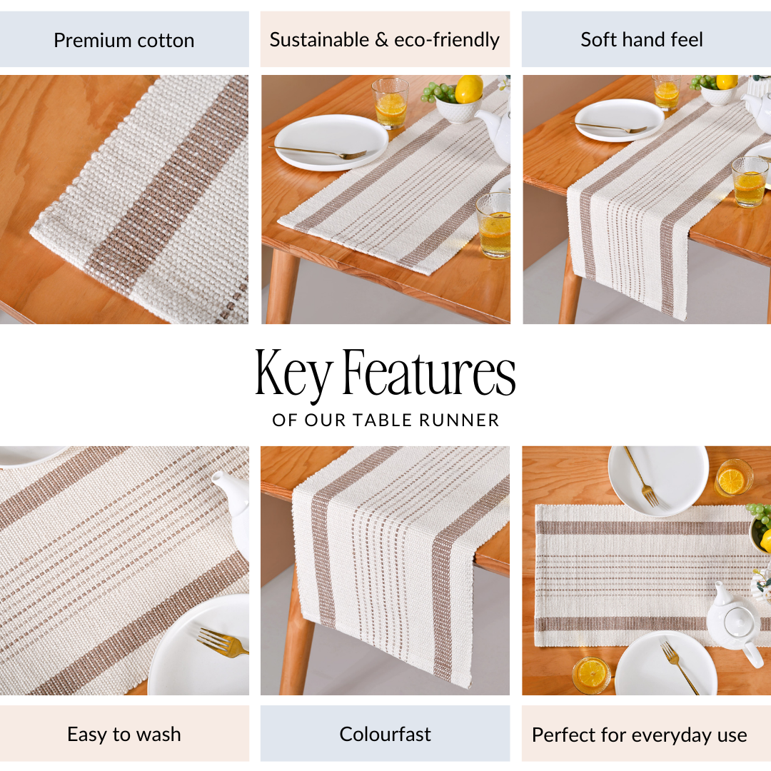 Bring quiet structure and soft texture to your dining table with this cotton table runner. The subtle woven detailing and earthy stripes create a calm and effortless look for both daily meals and hosting.