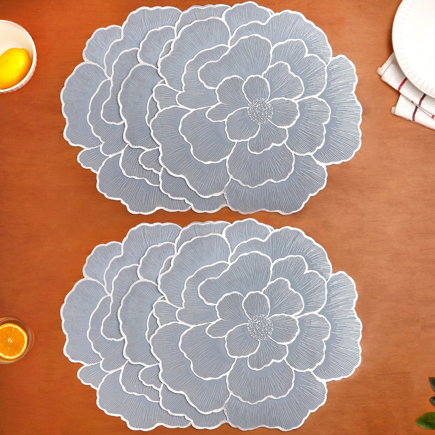 Design: Add a calming touch to your meals with this beautifully embossed floral table mat in a cool-toned pastel blue. Designed for contemporary homes, this mat seamlessly blends function with artistic elegance. The floral silhouette gives your tablescape a refined, graceful appeal. The design features a large embossed flower with intricate petal lines in soft metallic silver, blooming across a muted blue base. The contrast creates a dreamy effect that brings understated beauty and natural elegance to the table.
