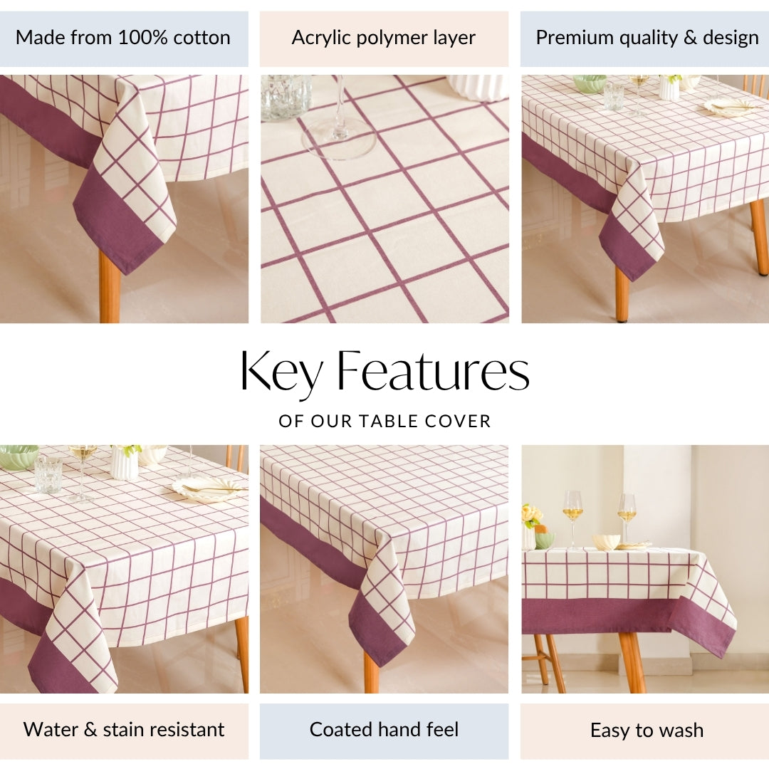 Design: Crafted from 100% cotton with a subtle, yet effective acrylic polymer layer, this table cover offers a refined coated hand feel that drapes beautifully. The timeless design features a charming windowpane check pattern in mauve taupe tones, transitioning seamlessly to the same colour border. This premium design brings sophistication and a polished look to both everyday meals and formal gatherings.