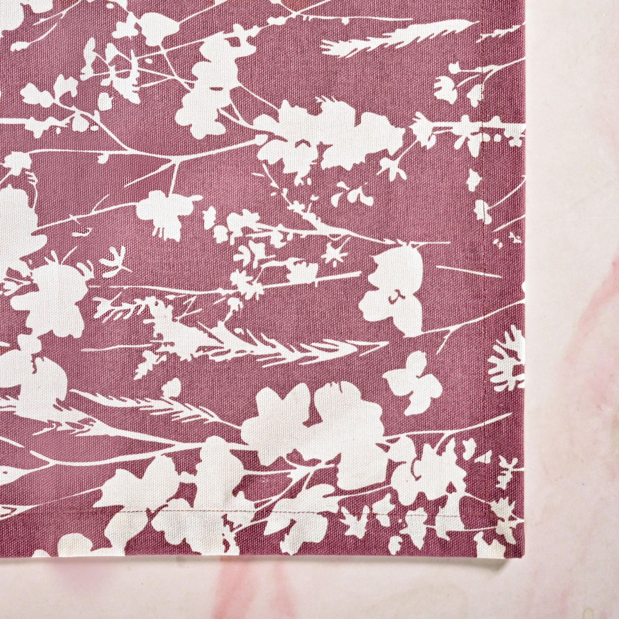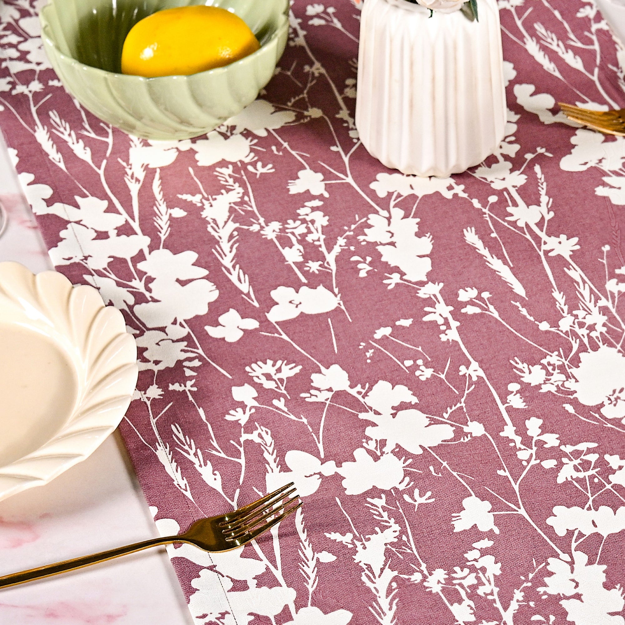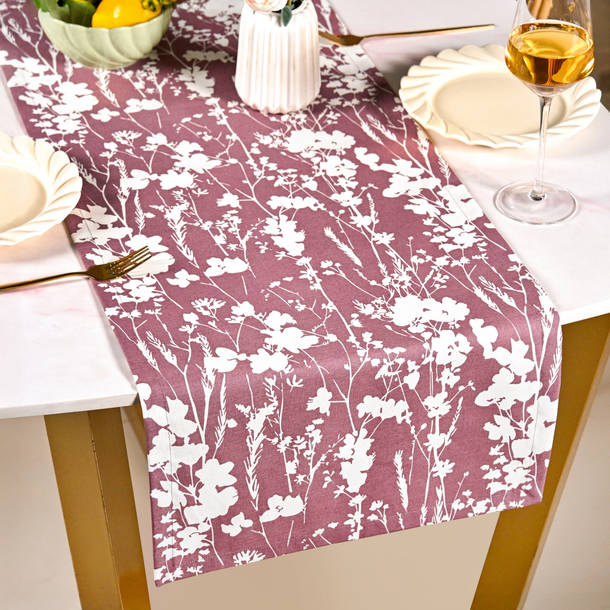 Design: This graceful table runner pairs a muted mauve-taupe backdrop with soft off-white floral silhouettes that mirror the beauty of wildflowers in the breeze. Its evenly spaced design exudes quiet elegance and warmth. Crafted entirely from cotton, it is best suitable for family brunch or romantic dinner tables.