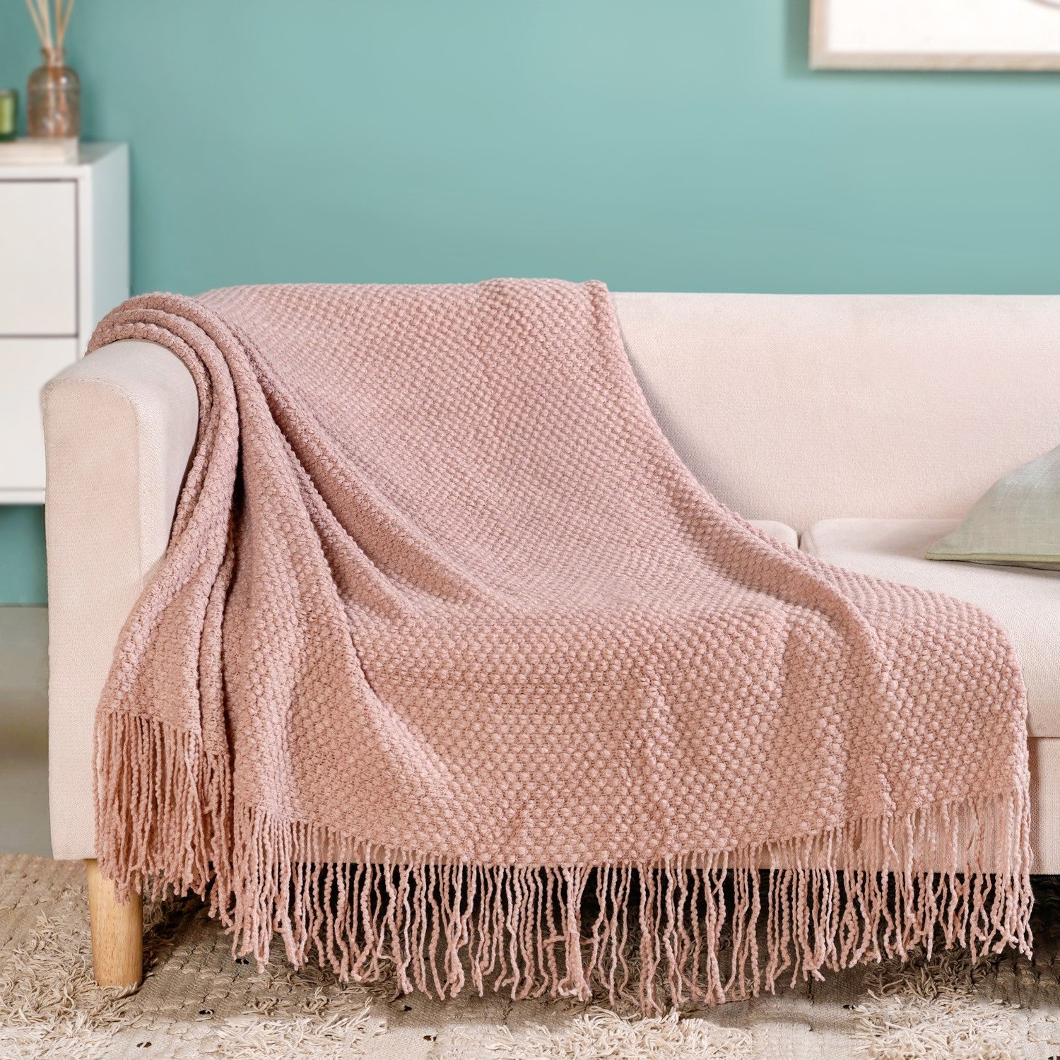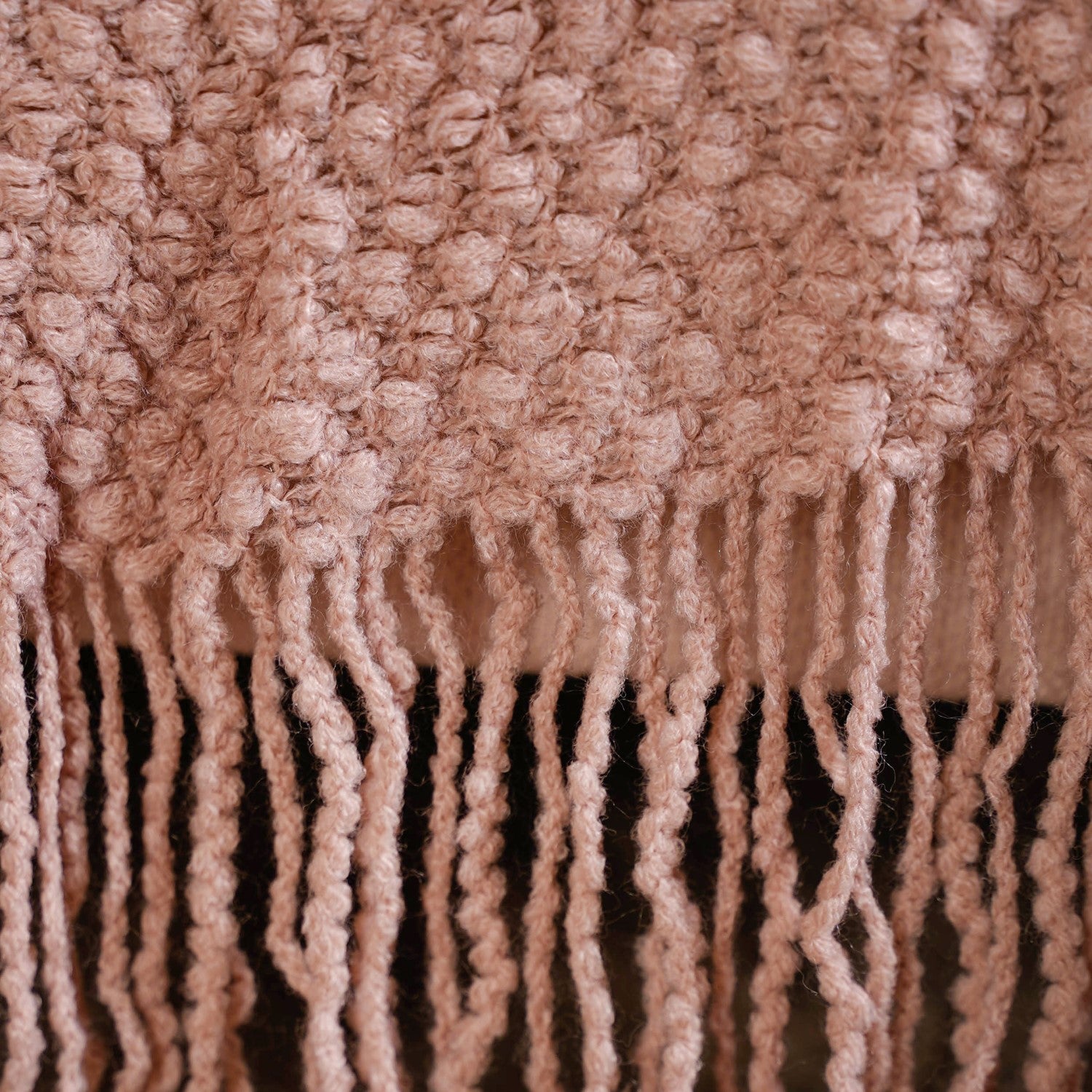 Design: This blush pink acrylic yarn throw blanket features a richly textured, tightly looped knit that creates a plush, pebble-like surface. The soft pastel hue and the fringes along the edges create an aesthetic layer over sofas, armchairs, or beds.