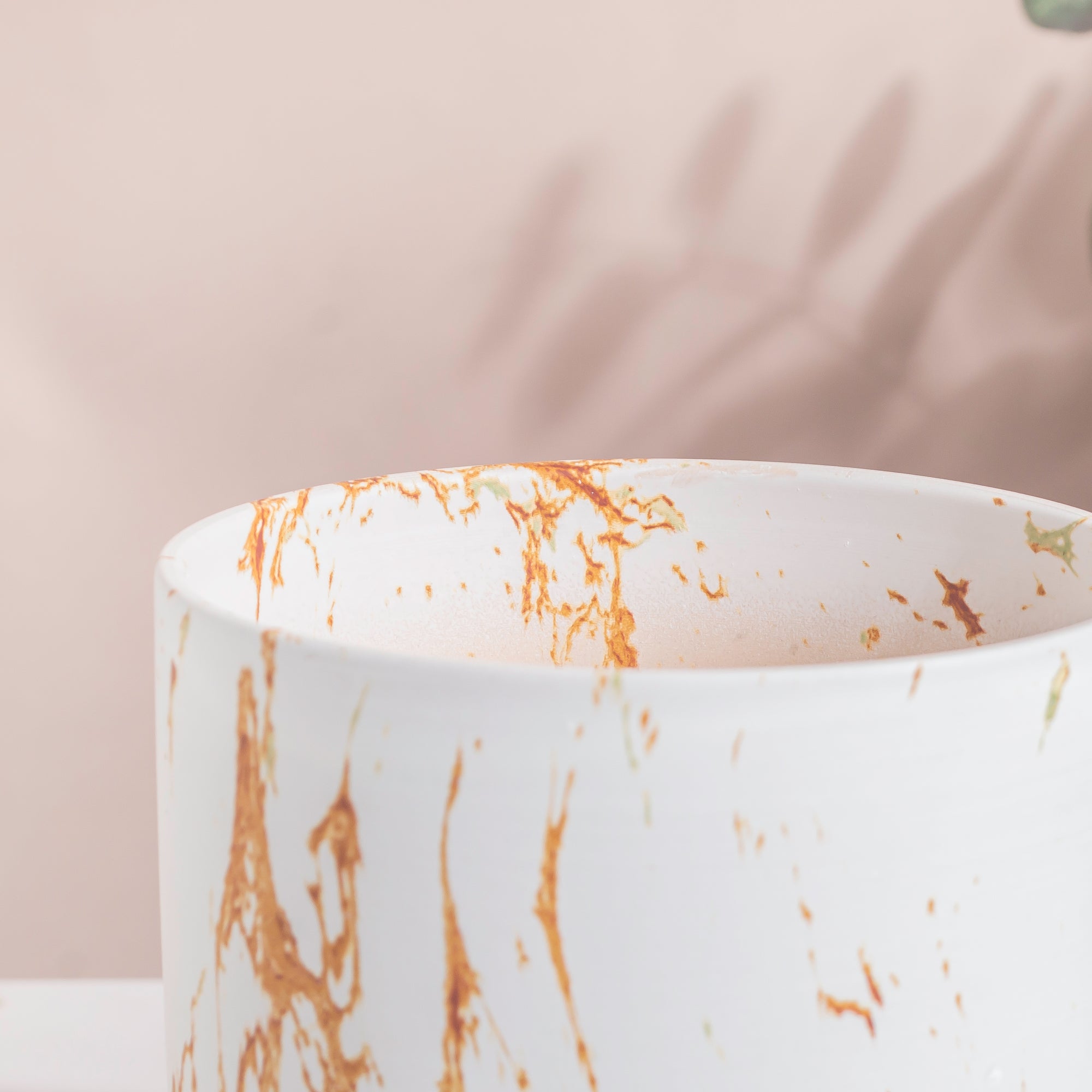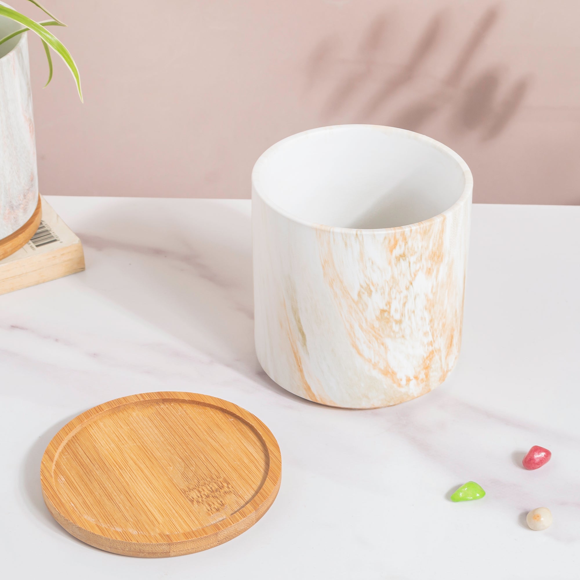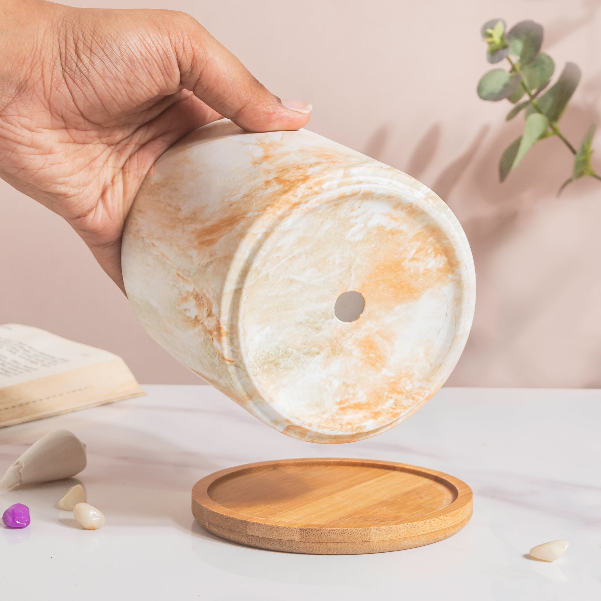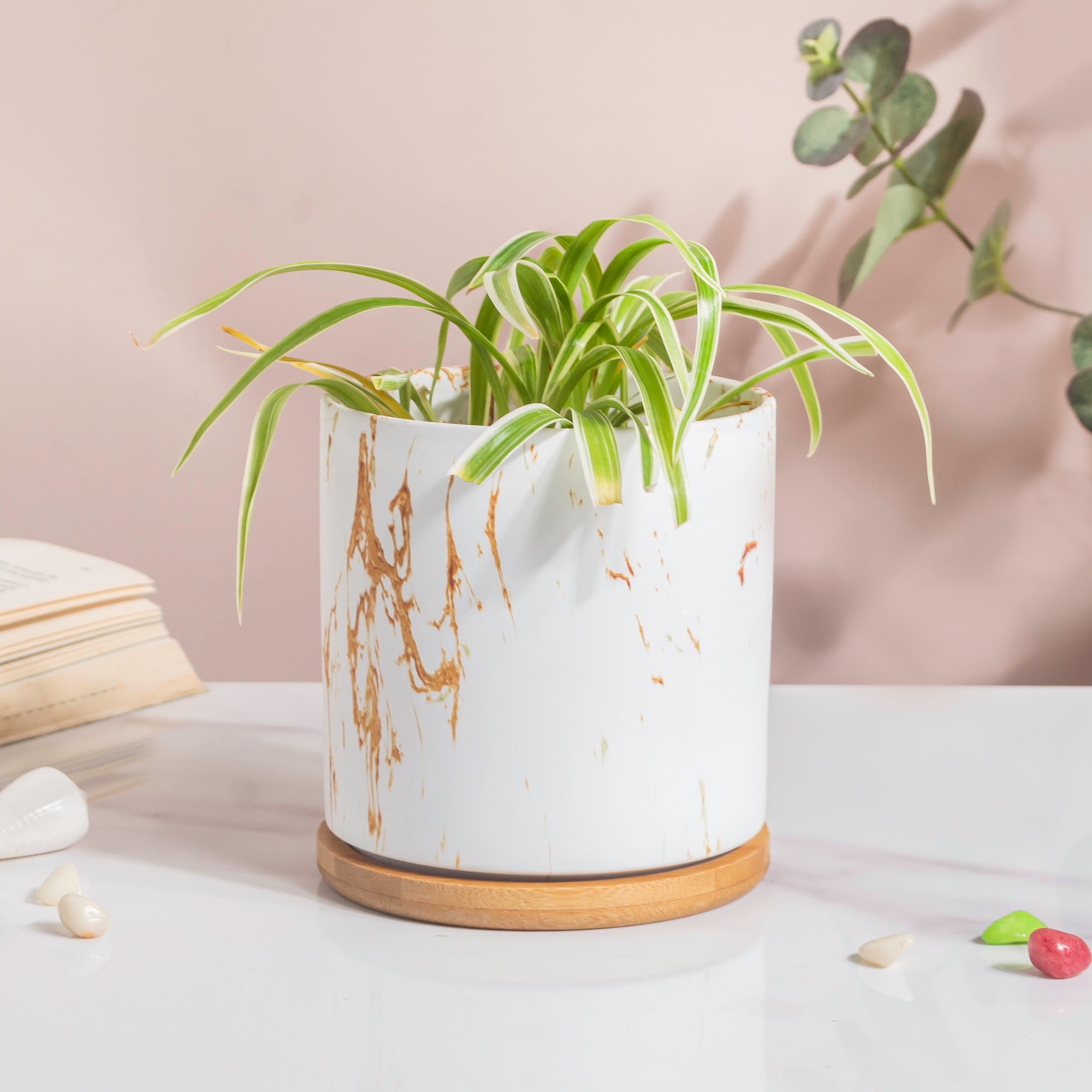 The subtle elegance of the indoor planter set is ideal for any modern and minimalistic room decor. The planter set includes 4 ceramic planters having an attractive marble finish featuring abstract patterns in grey, brown, and red. The planters come with a drainage hole at the bottom, making it easier to water your favourite indoor plants and flowers without overwatering. The wooden coasters of the ceramic planter pots also prevent excess water spillage. Place the planters on the windowsill or balcony to create a fresh and vibrant indoor garden at your home.