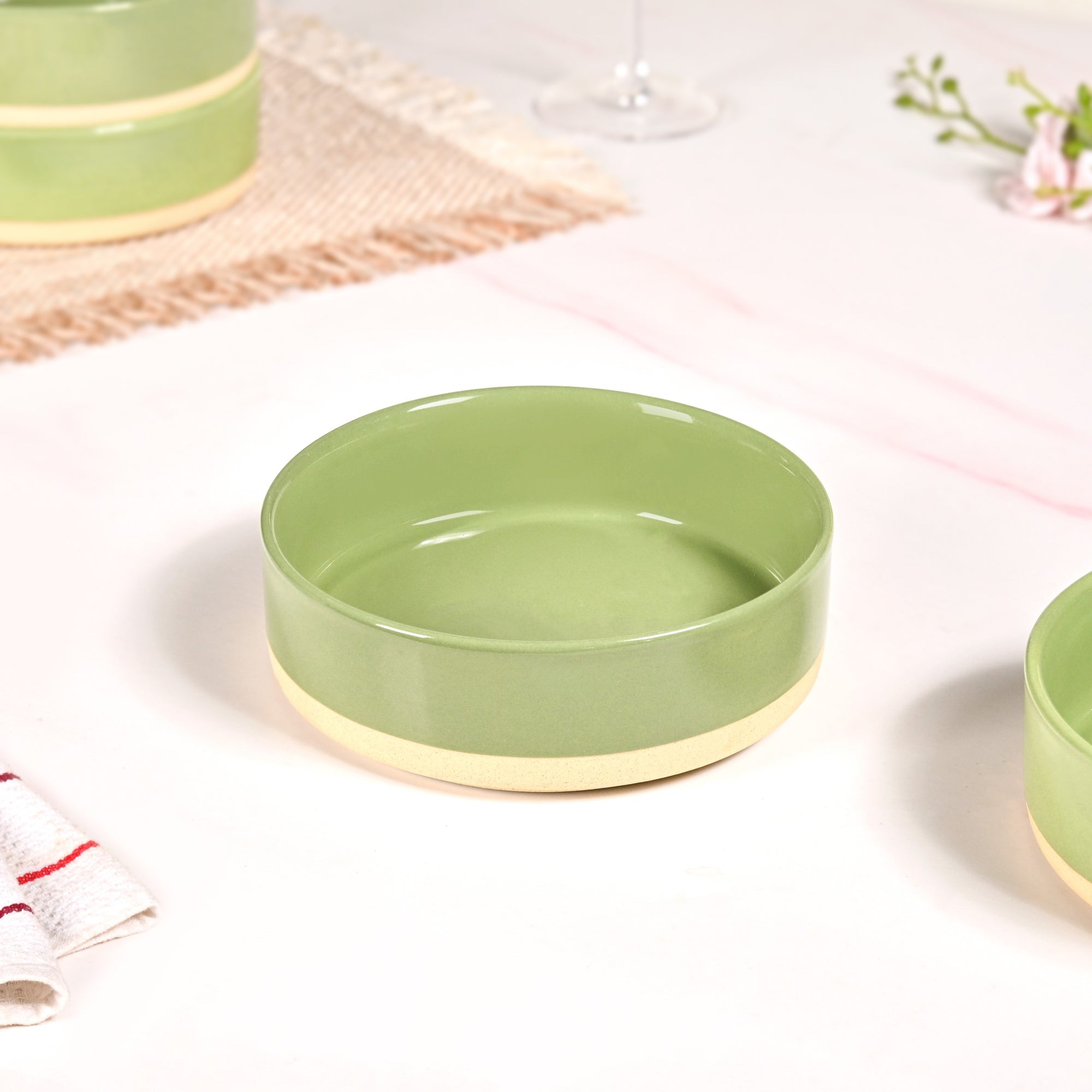 Design: Designed in a refreshing green hue with a natural beige base, the bowl embodies an earthy charm. Its minimalist design, paired with a soothing two-toned finish, makes it a versatile piece that complements both modern and rustic tablescapes. The smooth glazed finish lends a polished look, while the natural, earthy tones bring a calming touch to your dining spread. Whether for personal use or hosting, this bowl effortlessly combines function with timeless style.