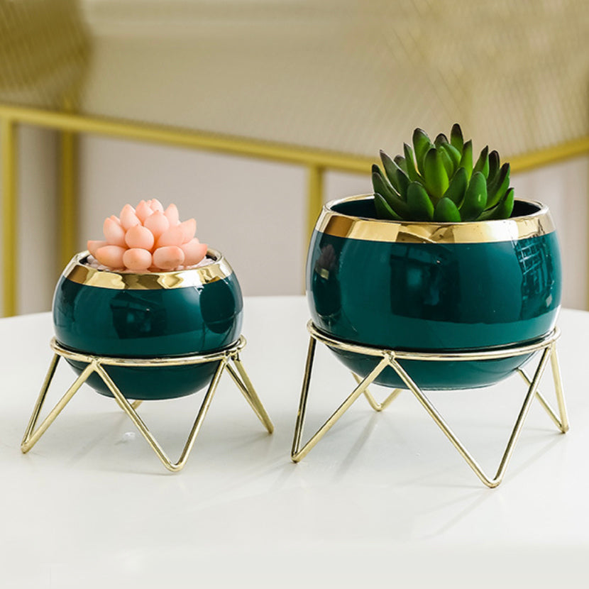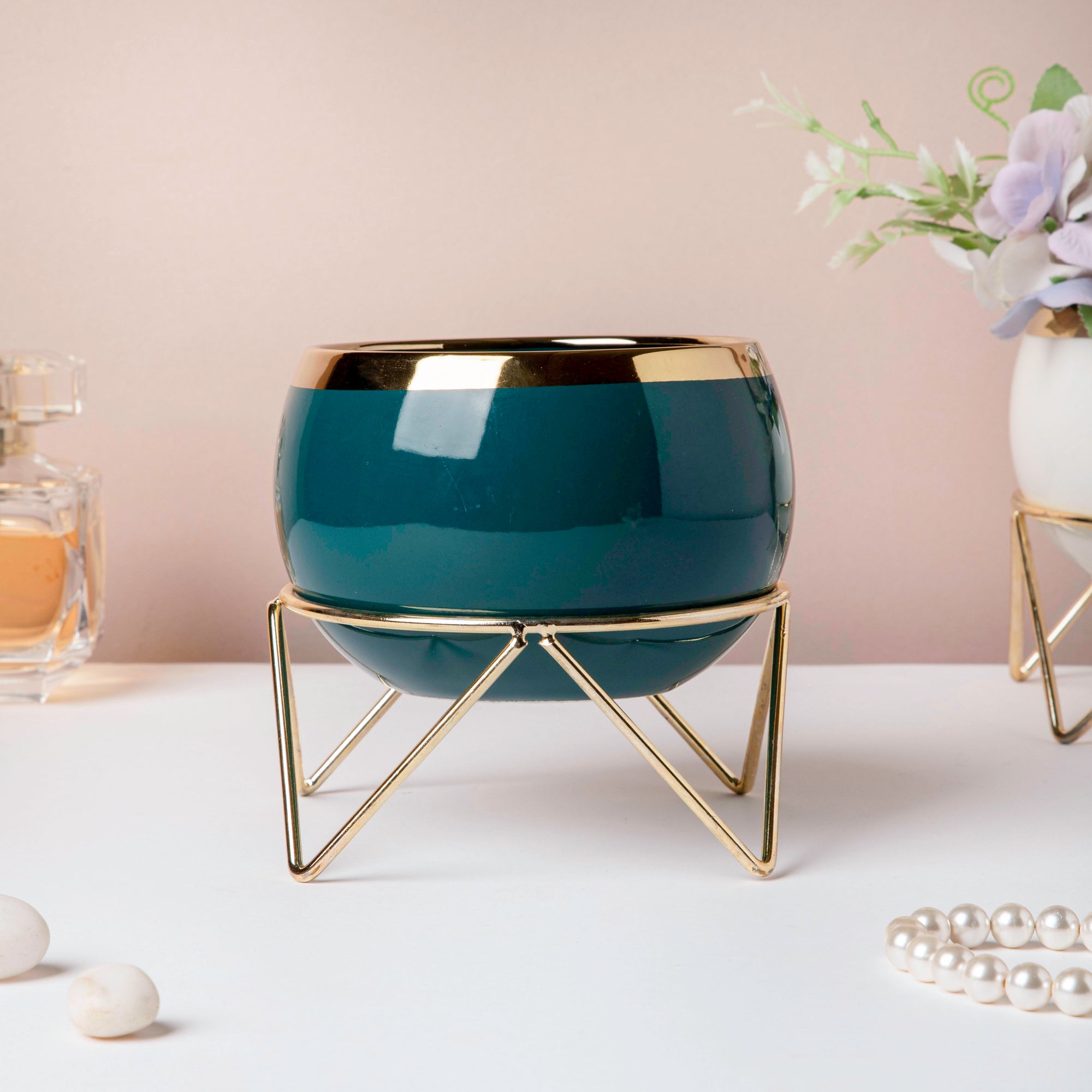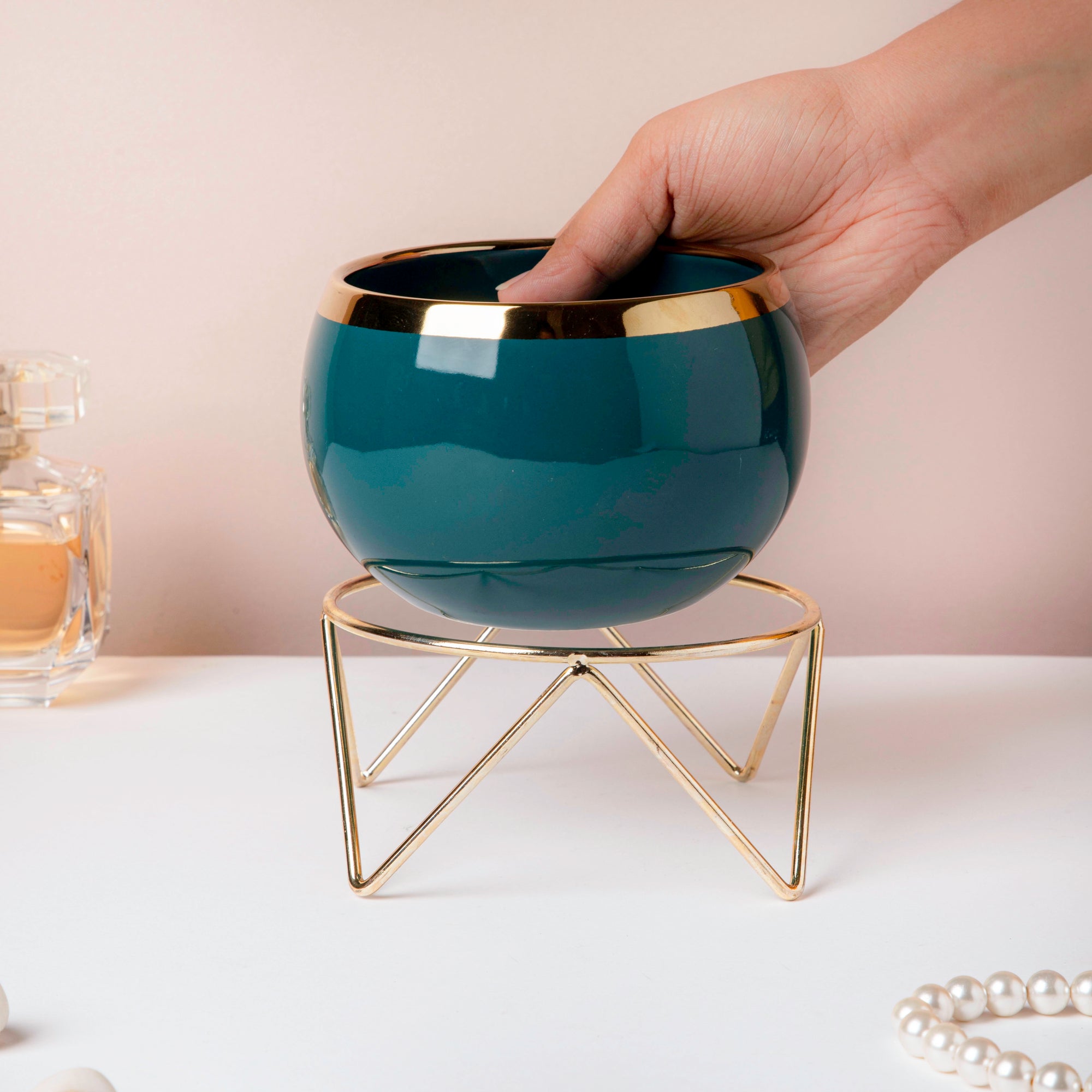 The emerald green planter has a bowl-shaped form that is accentuated by a stunning gold rim and golden-hued metal support. The planter beautifully improves the natural charm of the plants while also giving a vibrant addition to the living area. The planter's vibrant appearance makes it easy to incorporate into any environment for a sleek and exquisite look.