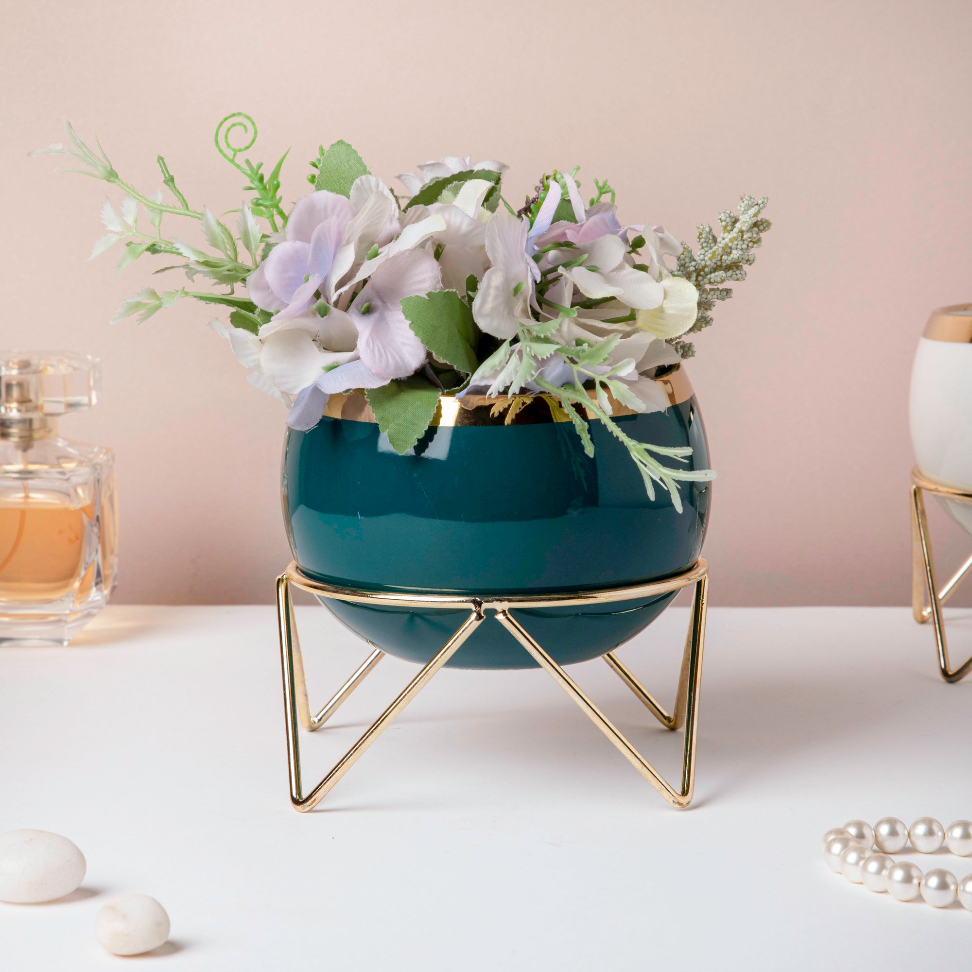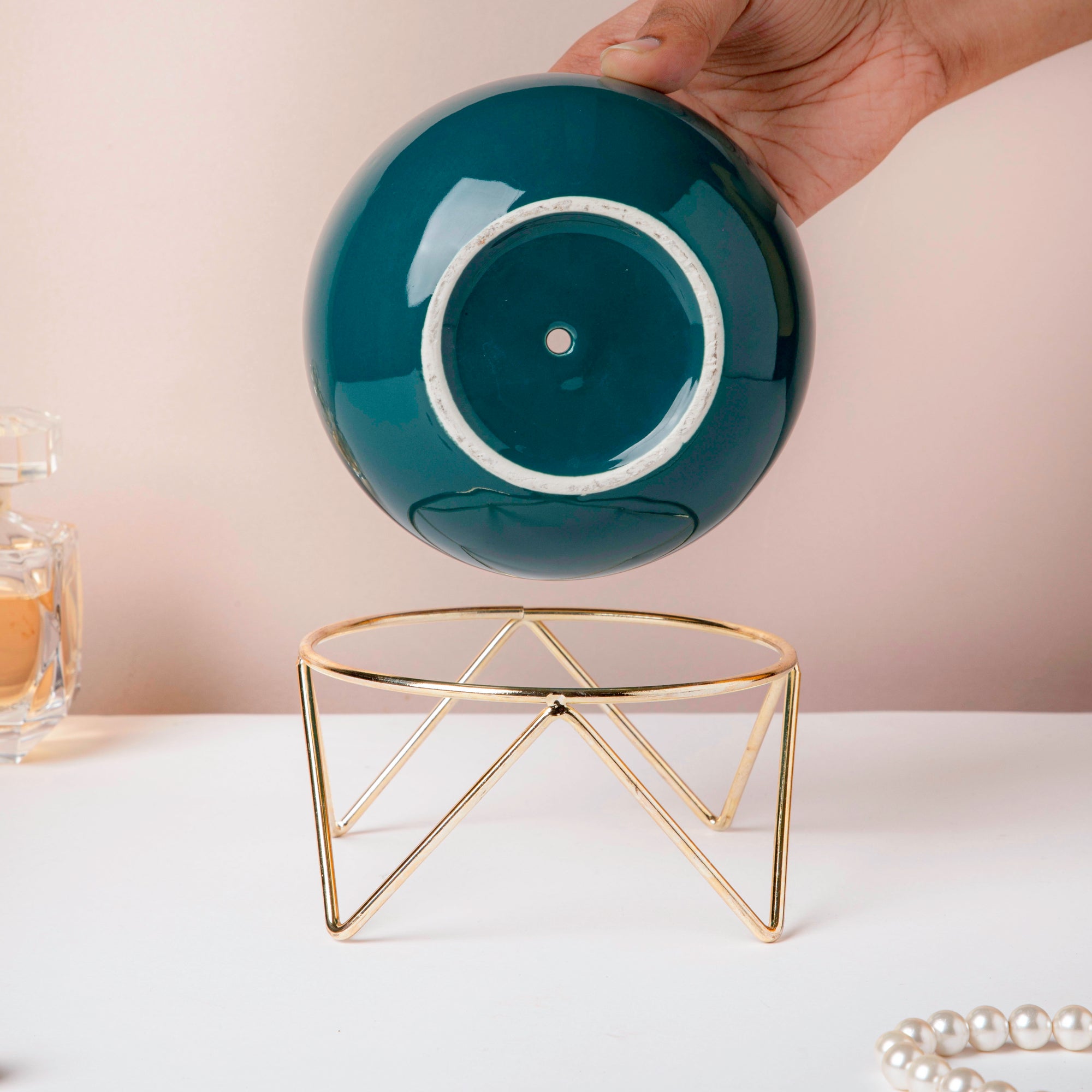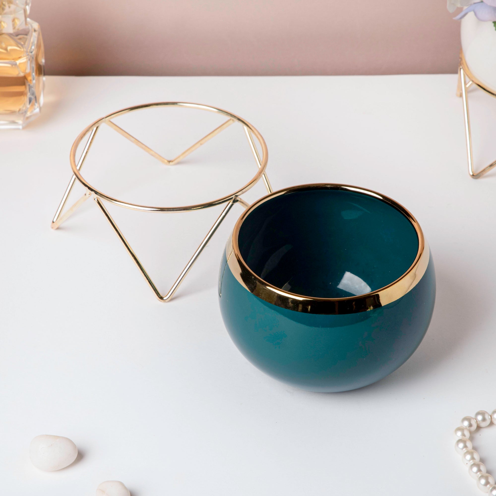 The emerald green planter has a bowl-shaped form that is accentuated by a stunning gold rim and golden-hued metal support. The planter beautifully improves the natural charm of the plants while also giving a vibrant addition to the living area. The planter's vibrant appearance makes it easy to incorporate into any environment for a sleek and exquisite look.