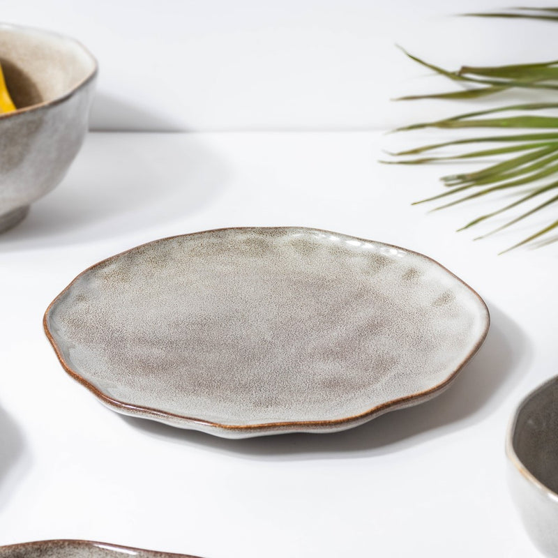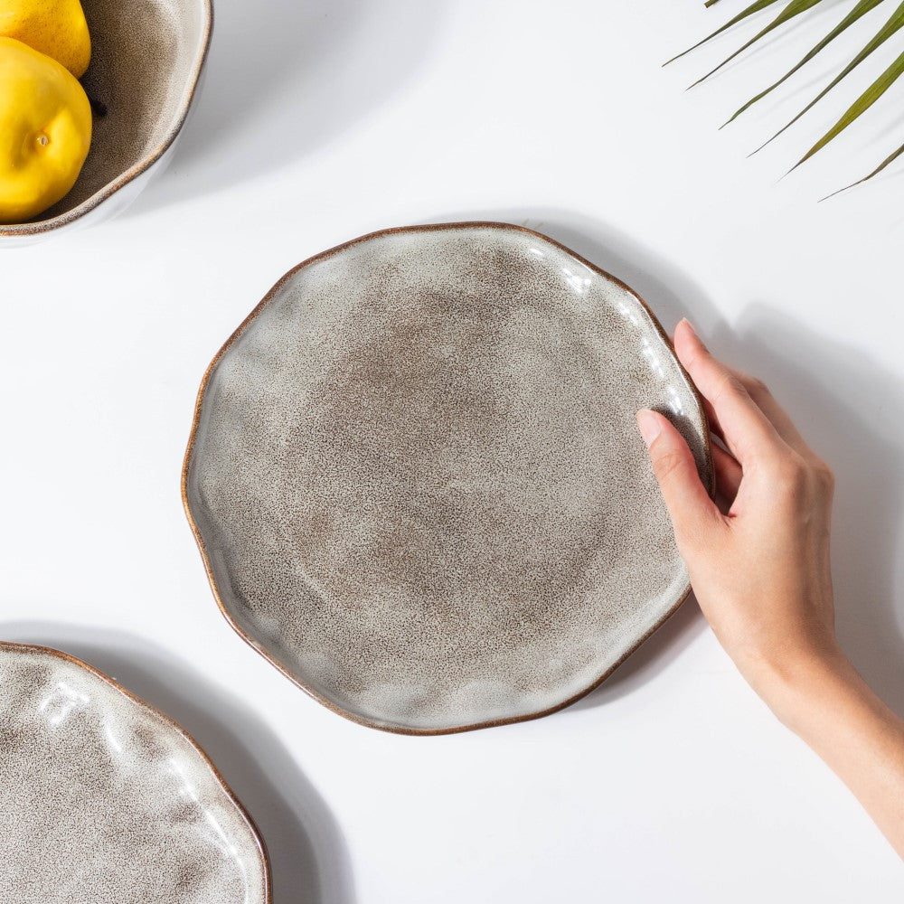 The handcrafted clay ceramic snack plate features a brilliant sheen and textured form to glam up the table setting. With brown specks sprinkled on the grey surface, the snack plate combines contemporary and rustic charm that can transform the table setting into a lavish and elaborate one. Use the ceramic plate as a starter plate to serve appetisers before the main course, or as a dish to serve evening fritters and fries.