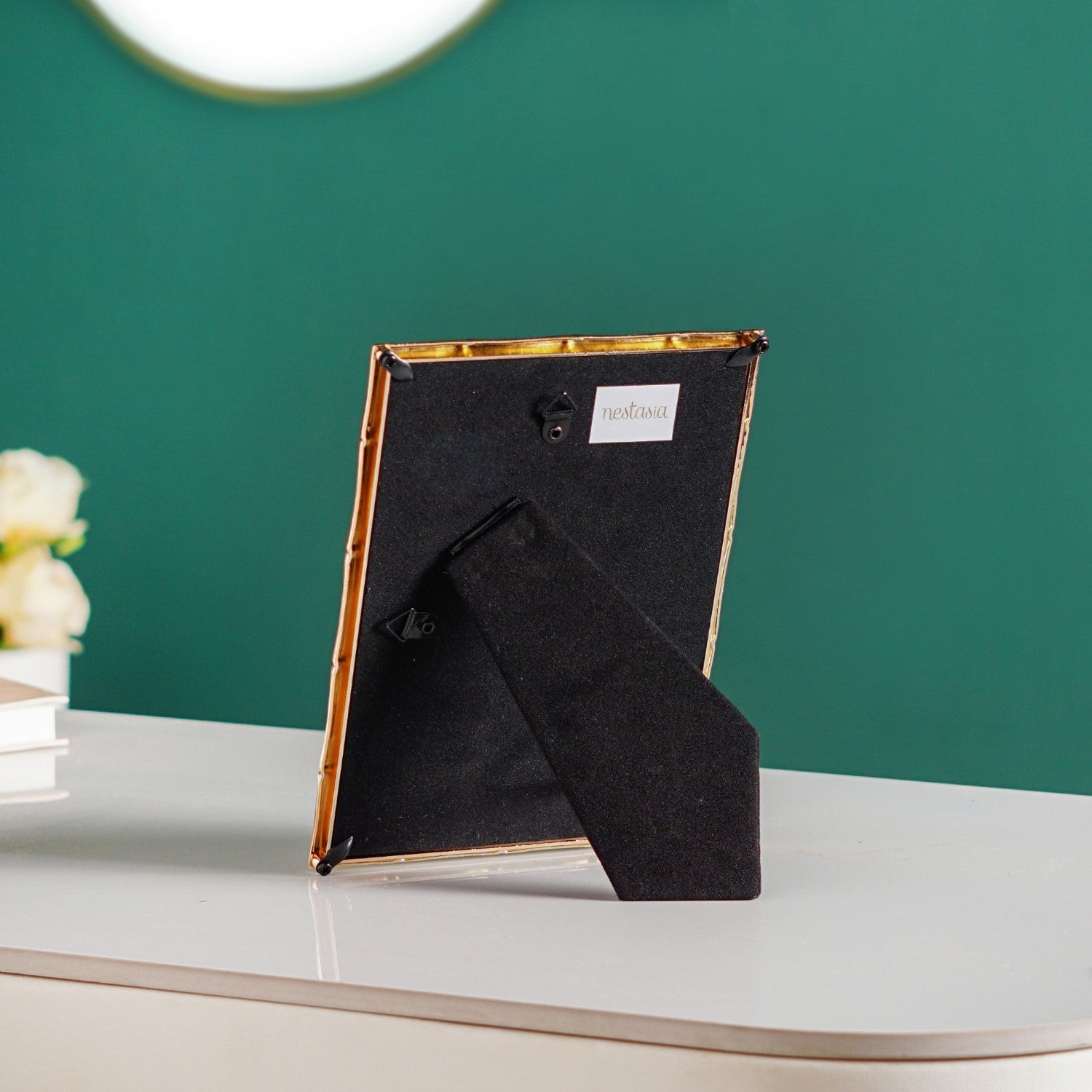 Design: This sophisticated piece features a gold-toned resin frame sculpted to resemble bamboo stems, complete with soft ridge detailing and a glossy finish. The acrylic front offers clear, sharp visibility, while its minimalist structure ensures the spotlight remains on your photo. It has a velvet cover on its back, along with an attached satin thread to its stand. It's compact and perfectly suitable for gifting.