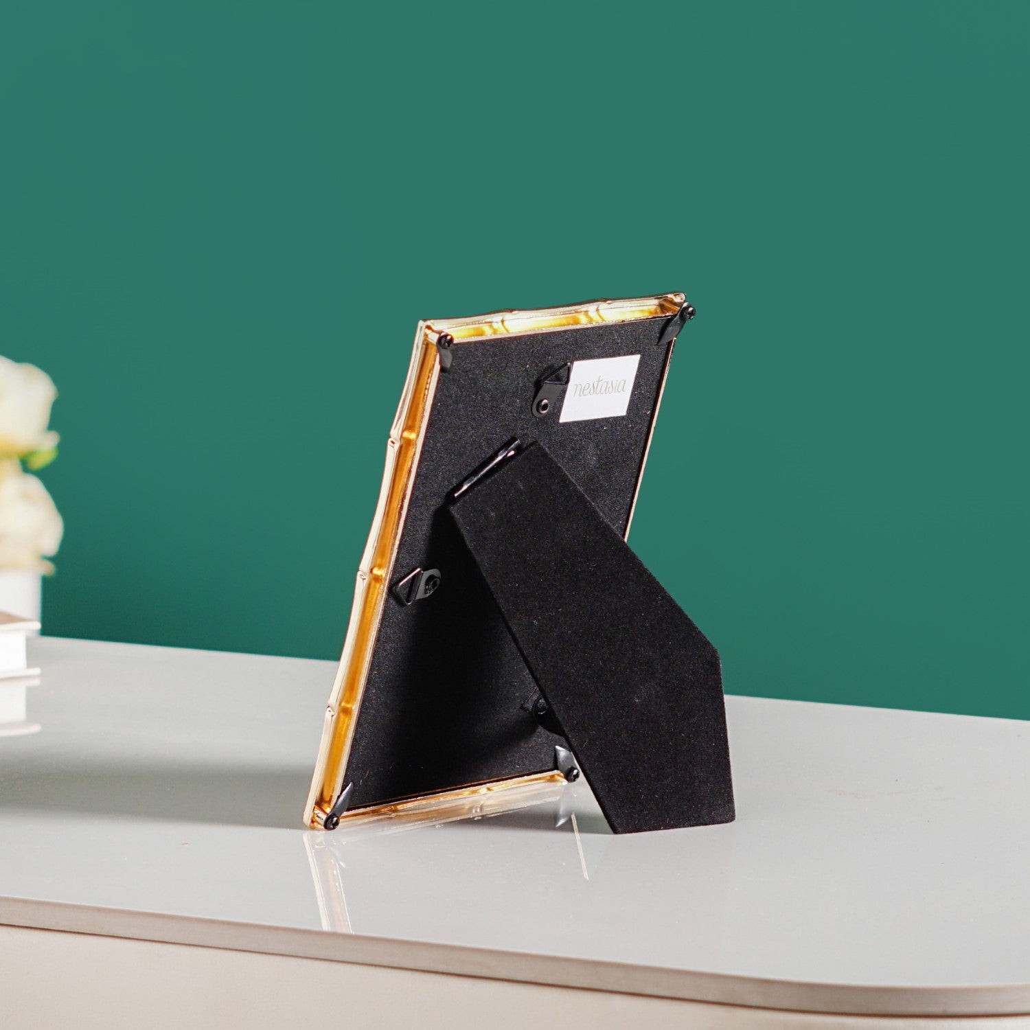 Design: This elegant photo frame features a gleaming gold finish with a bamboo-inspired resin border that adds a touch of natural sophistication. The surface is smooth and polished, with subtle ridge-like segments mimicking real bamboo joints. The inner display is covered with clear acrylic, giving it a crisp look.