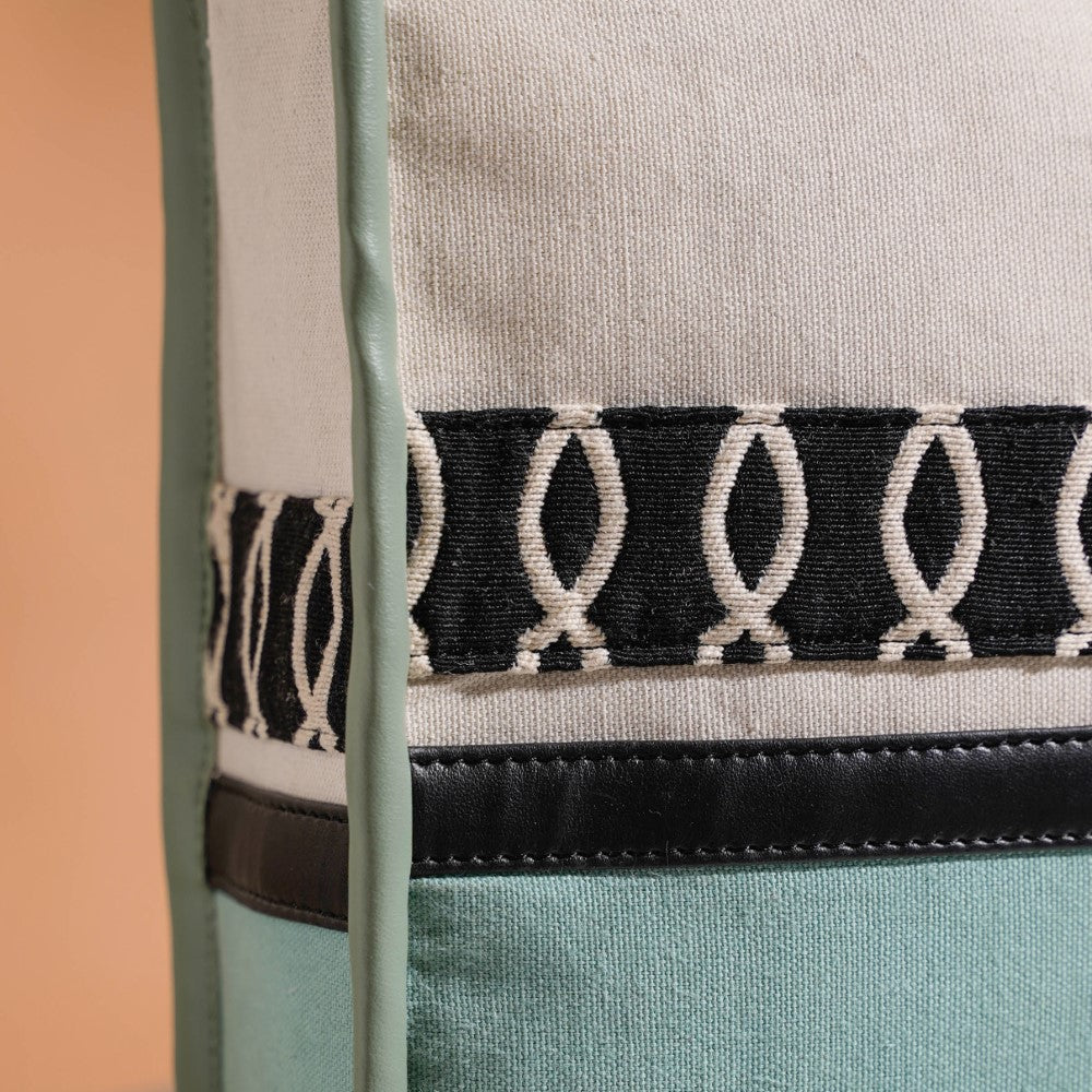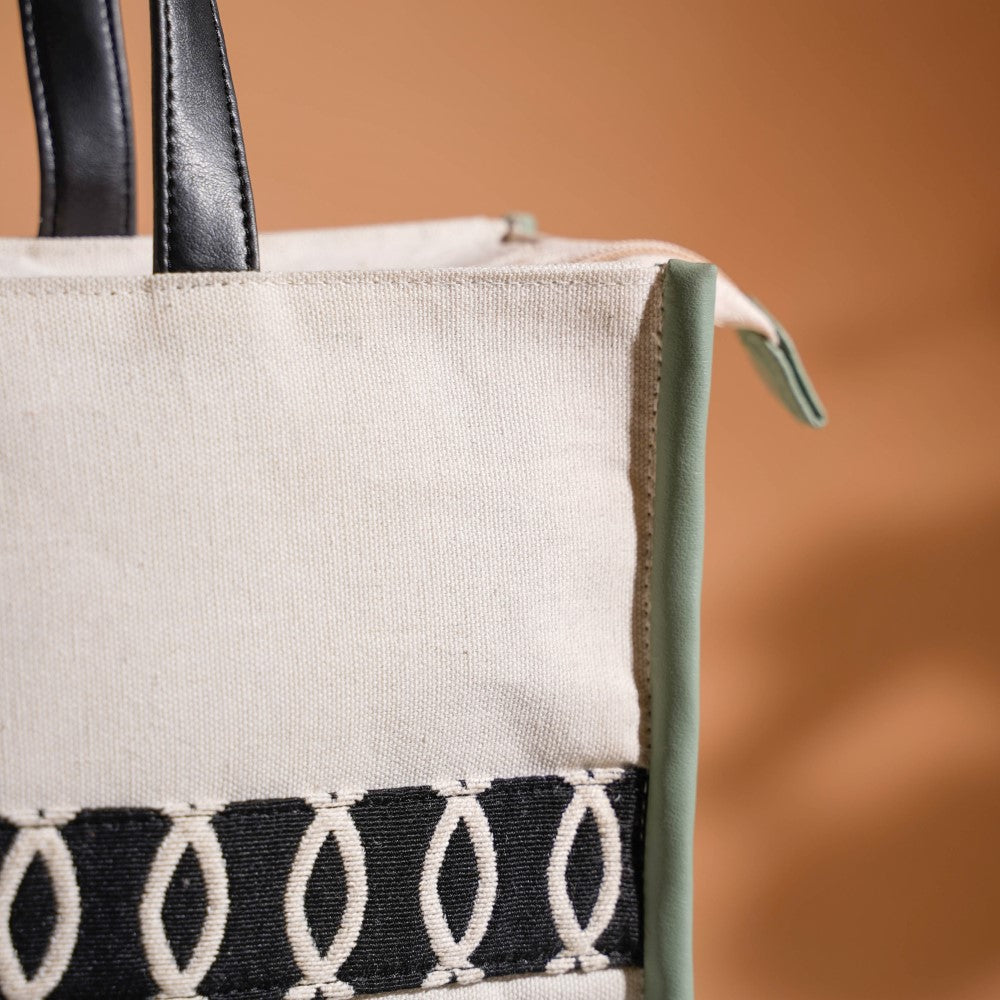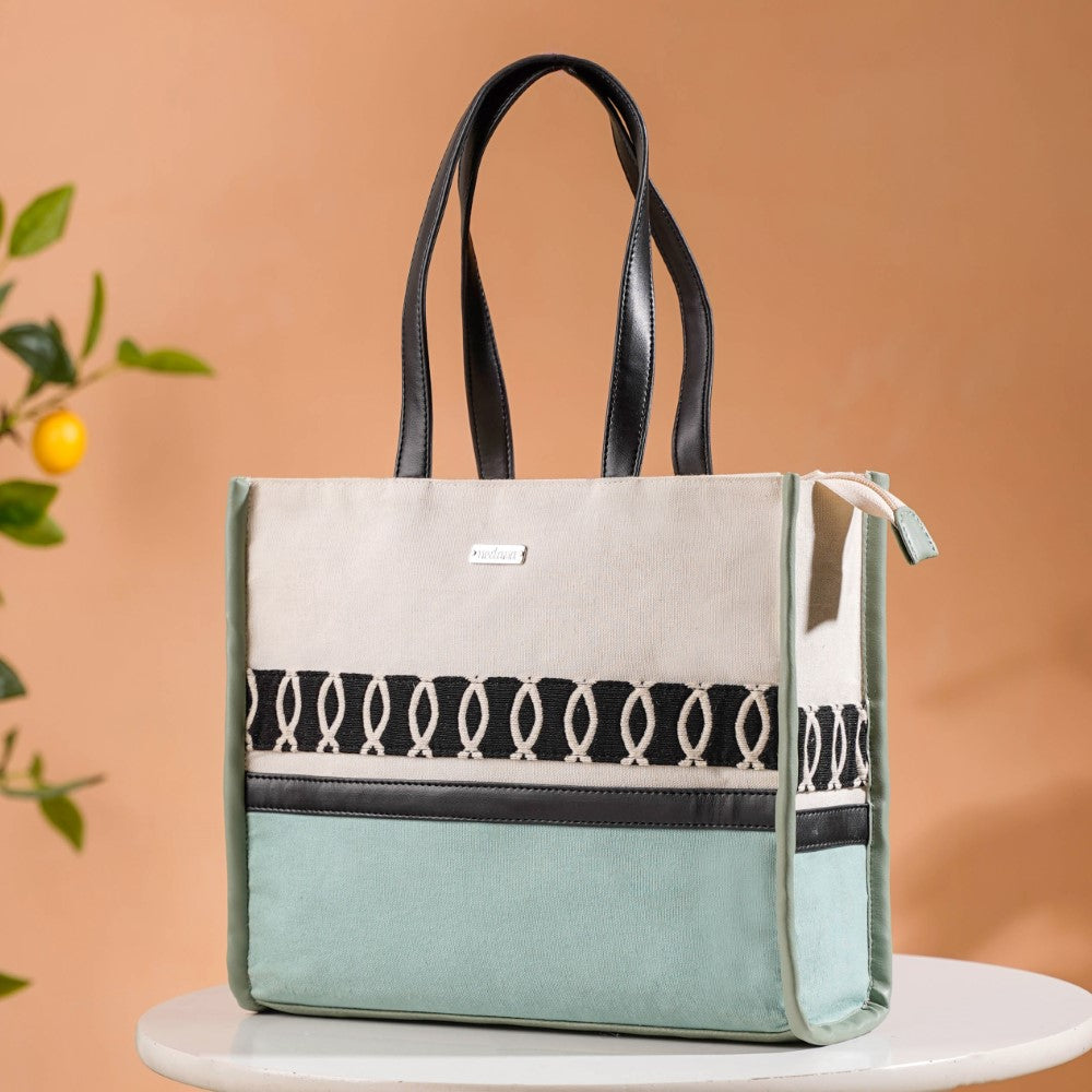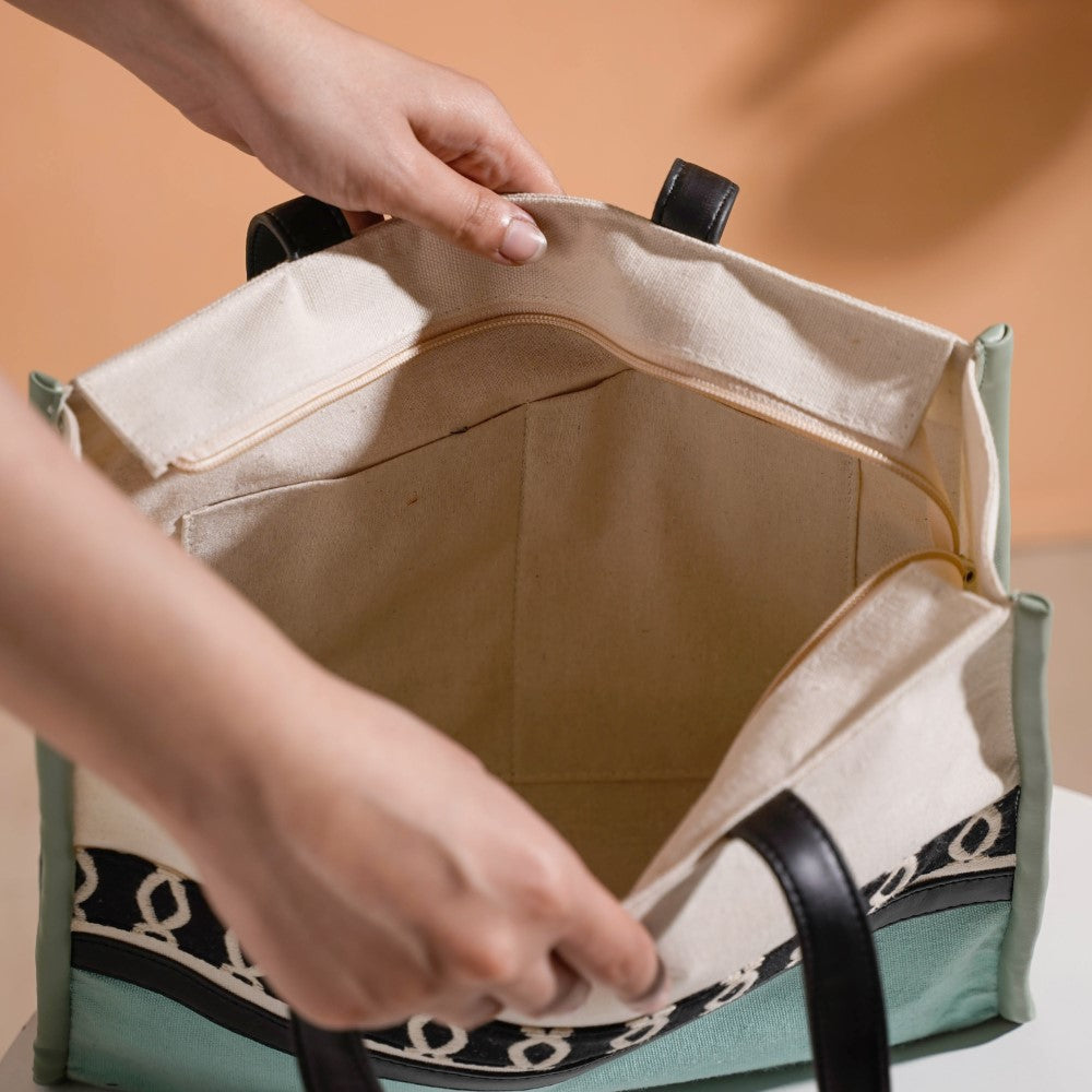 Embrace your inner fashionista with this chic mint green and white tote bag. Due to its handcrafted construction from top-notch canvas material, this small canvas tote bag is the ideal fusion of functionality and design. Our tote bag's spacious compartment, which also includes a safe metal zipper mechanism, is perfect for carrying your everyday essentials. Whether you're heading to work or going on a vacation, this multipurpose tote bag will be your trustworthy travel companion.