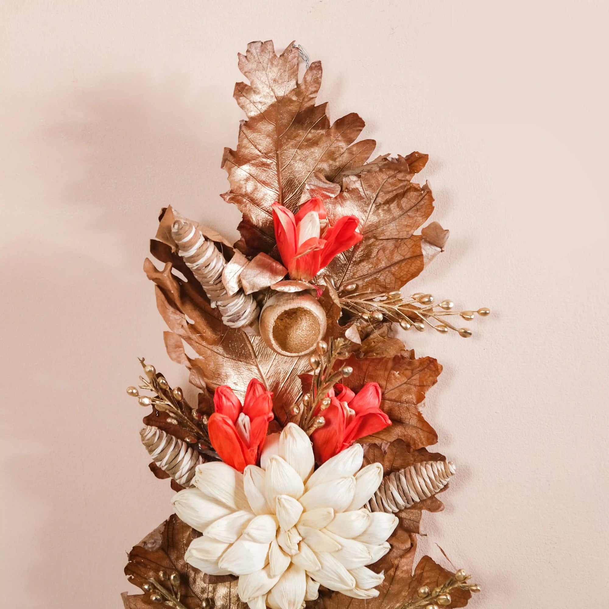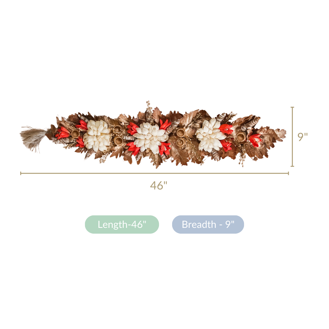 The decor's versatile design allows it to be used for special events, parties, seasonal themes, and festivities as well as an elegant addition to your everyday decor. Infuse your space with natural beauty with the decor's delicate shola flowers, naturally dried leaves, graceful bell cups, and golden-hued dried berries. The beautiful decor will bring a piece of the outdoors into your home, despite the time of year.