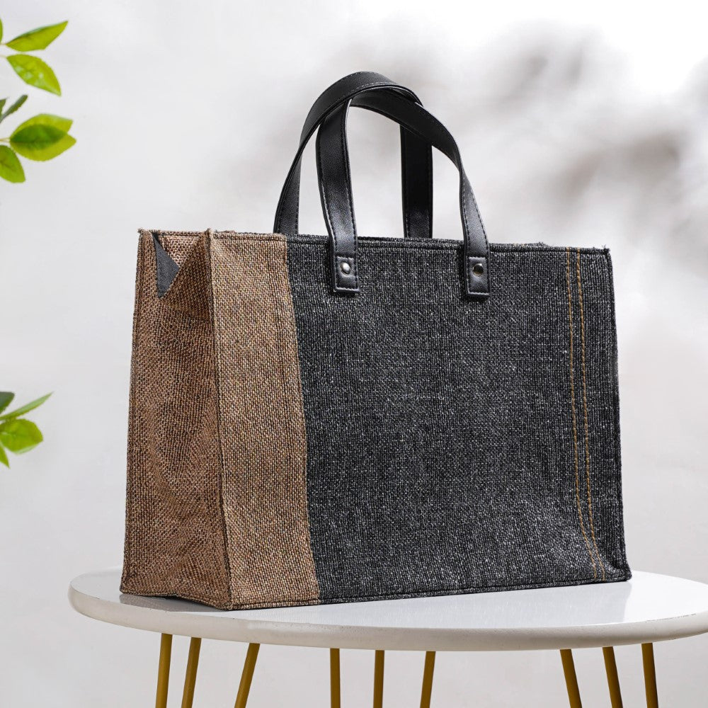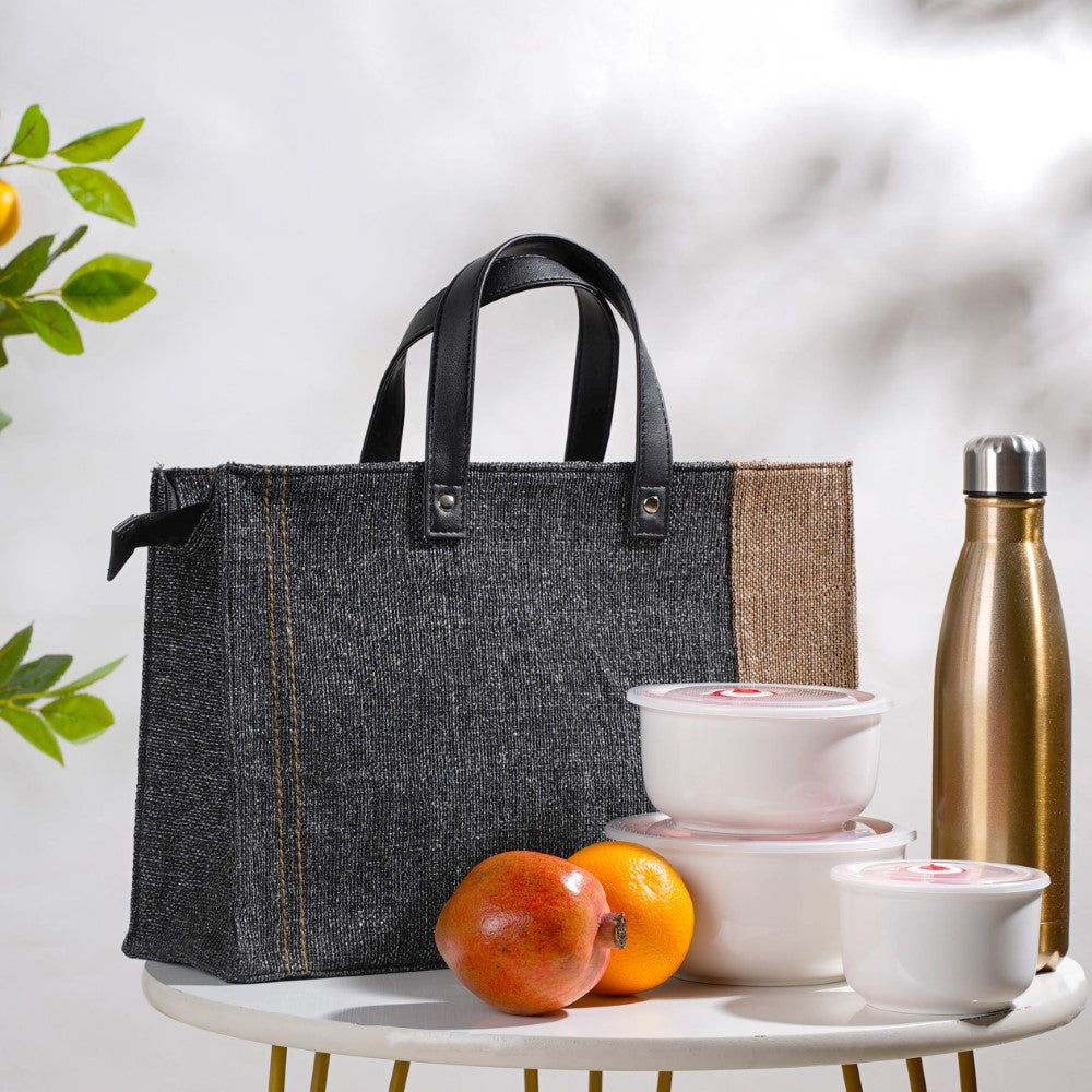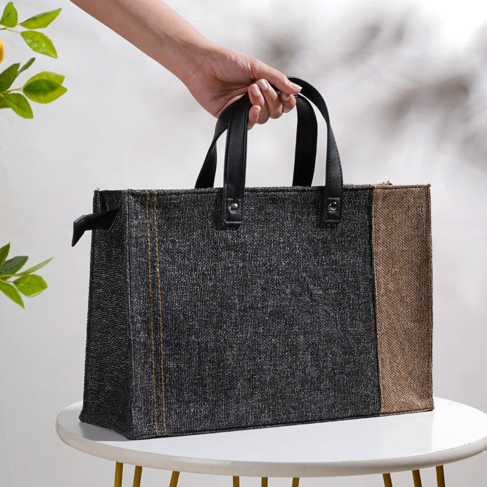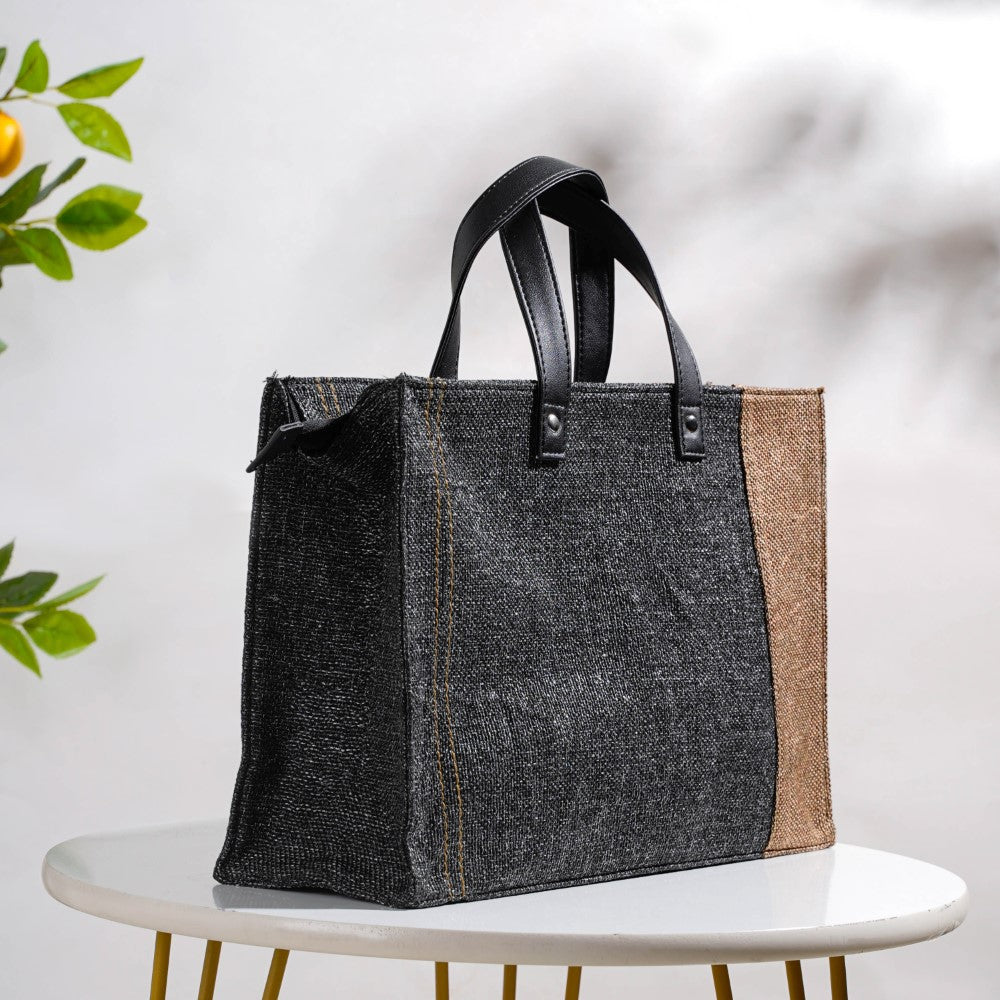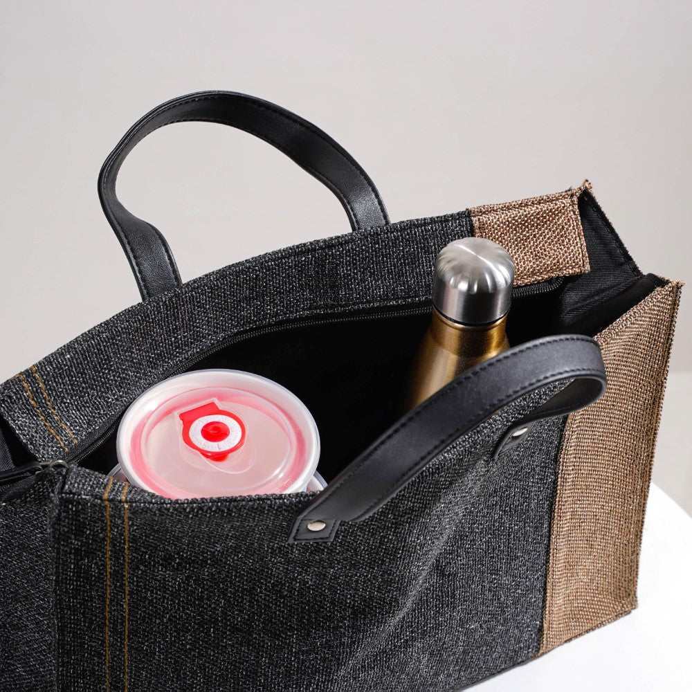 Upgrade your lunchtime experience with Nestasia's functional and chic black and beige jute lunch bag. The spacious compartment with a smooth zipper is included in our expertly handstitched 100% organic jute lunch bag for easy carrying of lunch boxes, water bottles, snacks, and other items. The bag's strong vegan leather handles will make it easy for you to carry, whether you're taking it to work or intend to take it on your upcoming weekend getaway.