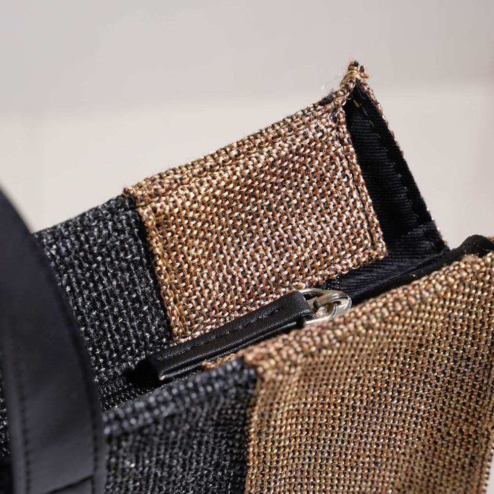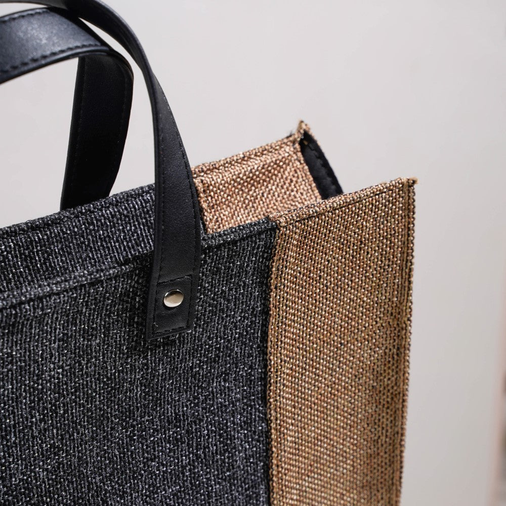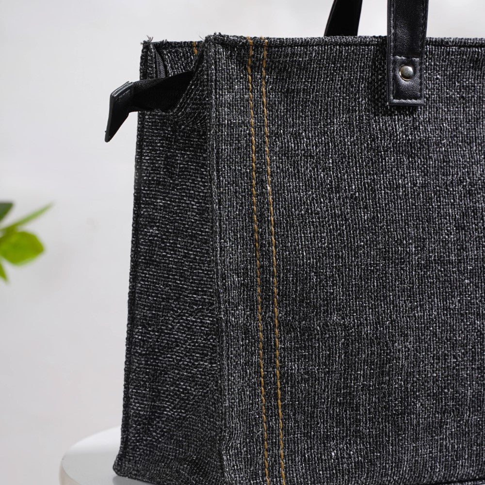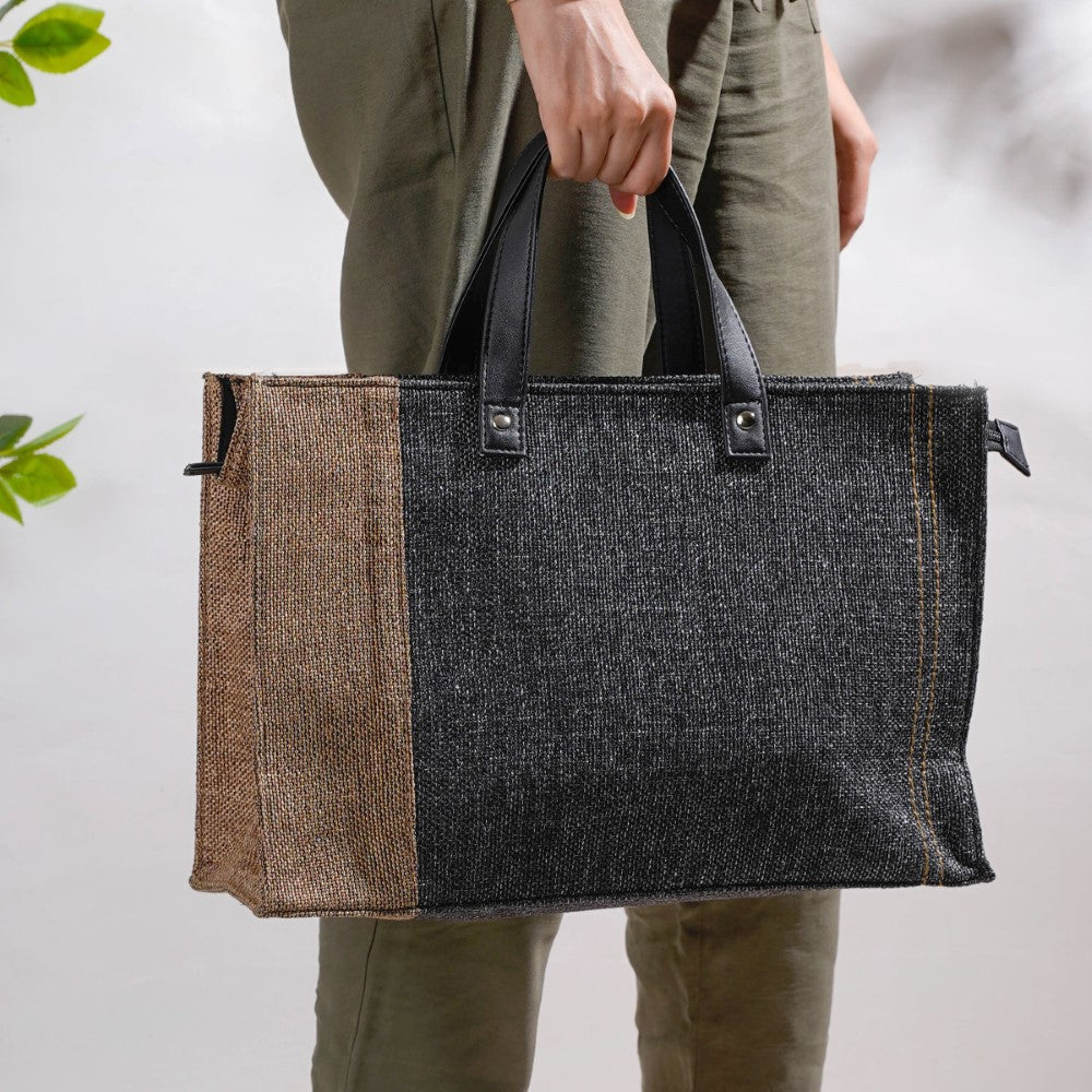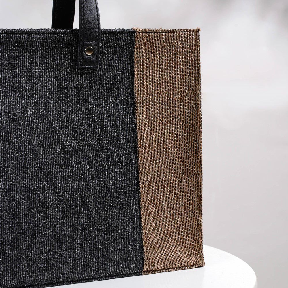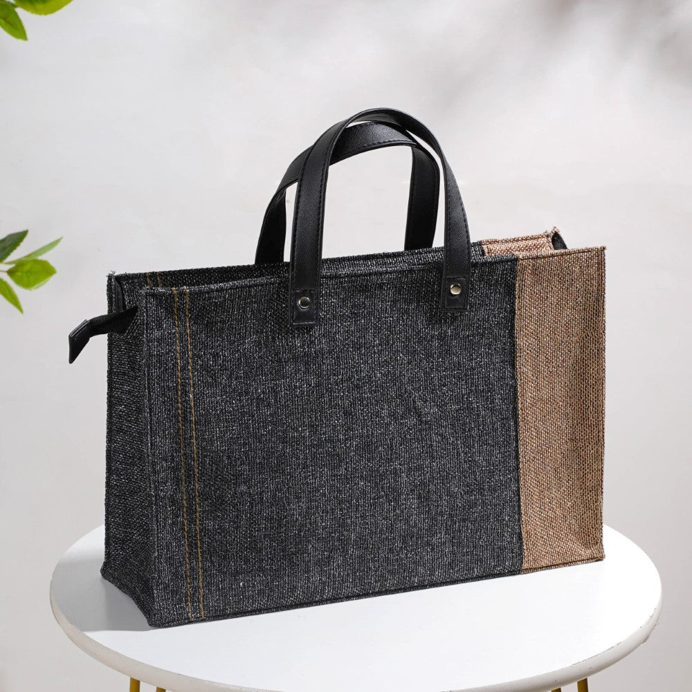 Upgrade your lunchtime experience with Nestasia's functional and chic black and beige jute lunch bag. The spacious compartment with a smooth zipper is included in our expertly handstitched 100% organic jute lunch bag for easy carrying of lunch boxes, water bottles, snacks, and other items. The bag's strong vegan leather handles will make it easy for you to carry, whether you're taking it to work or intend to take it on your upcoming weekend getaway.