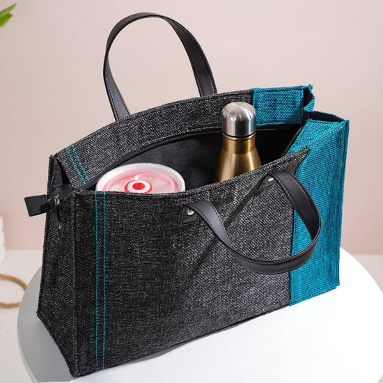Invest in Nestasia's stylish and practical black and teal jute lunch bag to elevate your lunchtime experience. Our expertly handstitched jute lunch bag includes a spacious compartment with a smooth zipper for convenient transportation of lunch boxes, water bottles, snacks, and other necessities. It is made of 100% organic jute. Whether you're carrying the bag to work or planning to take it on your upcoming weekend break, its sturdy vegan leather handles will make it simple for you to do so.