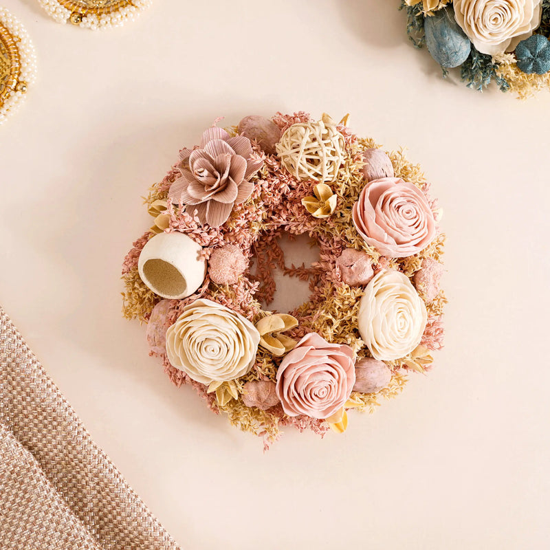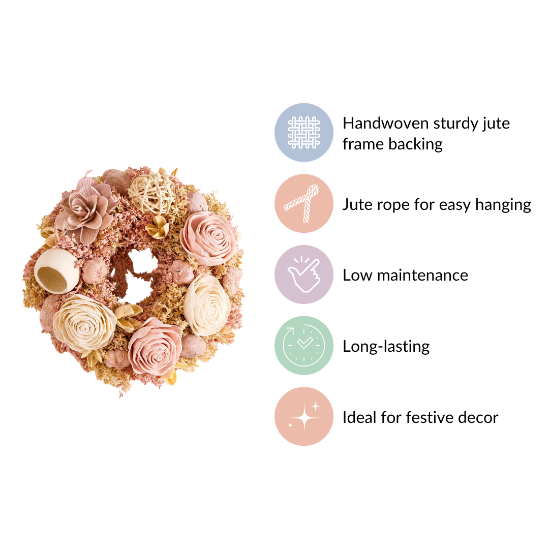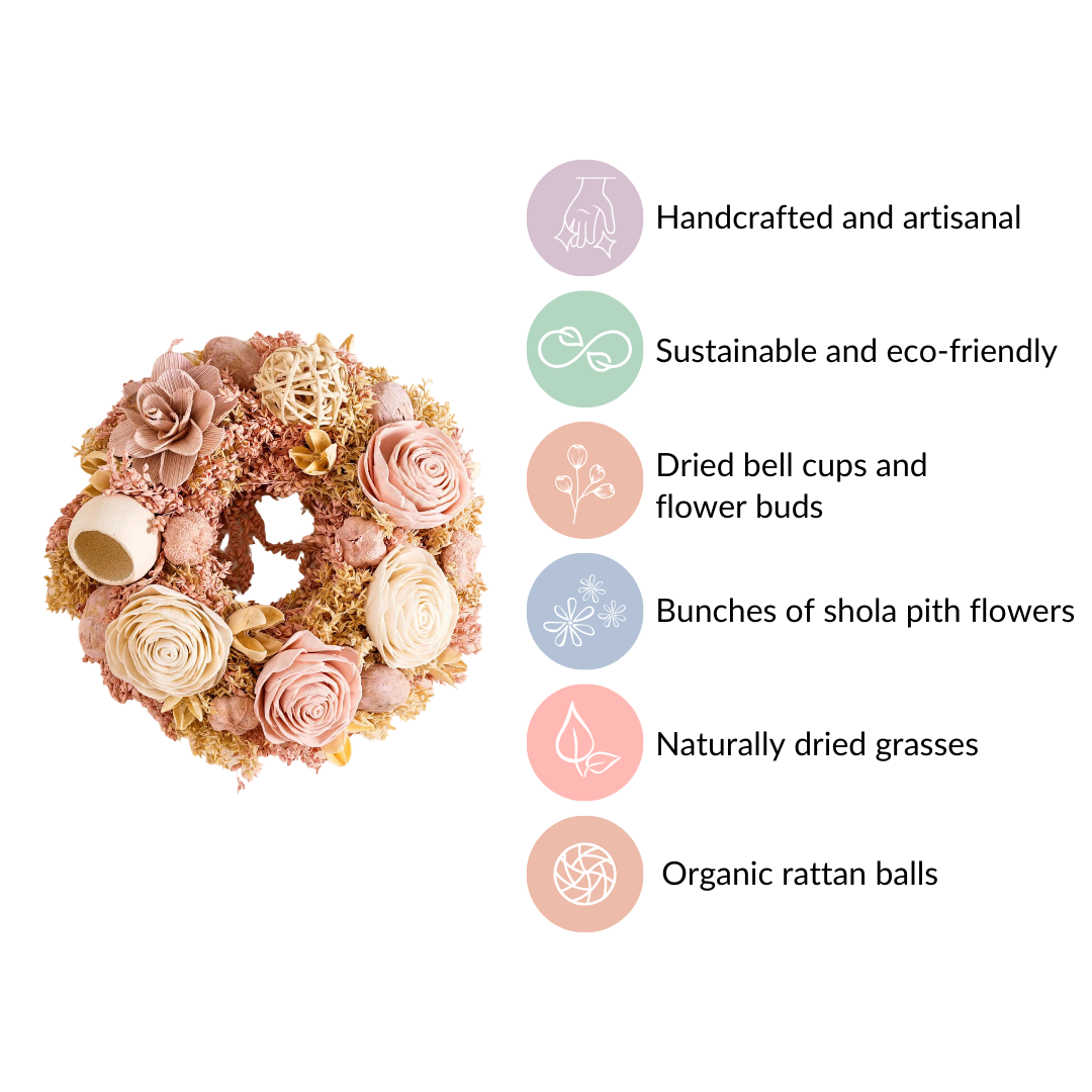 Discover unparalleled elegance with our dried flower wreath, an epitome of artisanal craftsmanship and eco-friendly finesse. Handcrafted by skilled artisans, this wreath showcases a harmonious blend of sustainable shola pith flowers, organic rattan balls, dried bell cups, and naturally dried grasses. Its sturdy handwoven jute frame backing ensures durability, while the included jute rope allows effortless hanging. Perfect for festive decor, this wreath garland for wall decor emanates timeless beauty, making it a must-have for those who appreciate luxurious, sustainable, and long-lasting elegance.