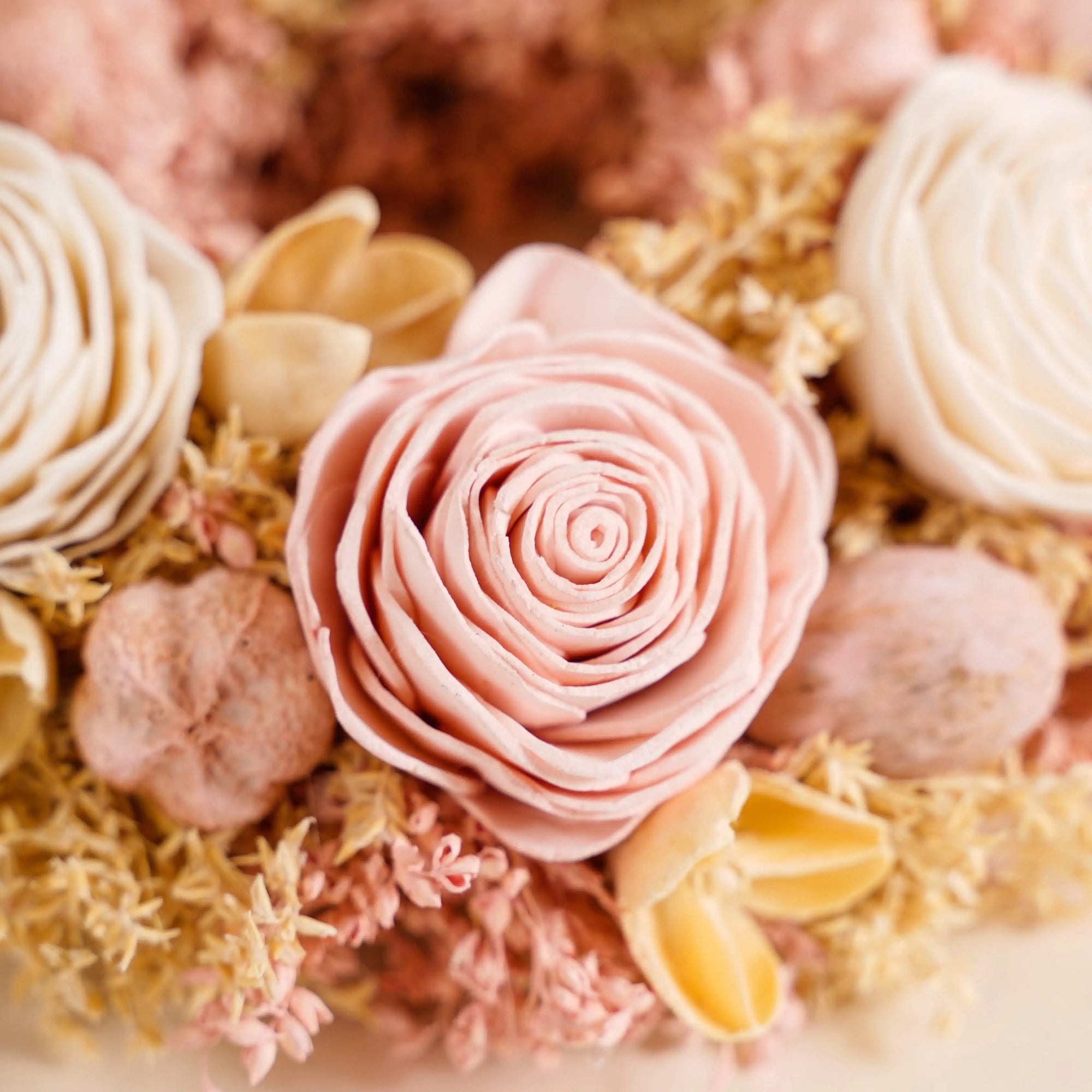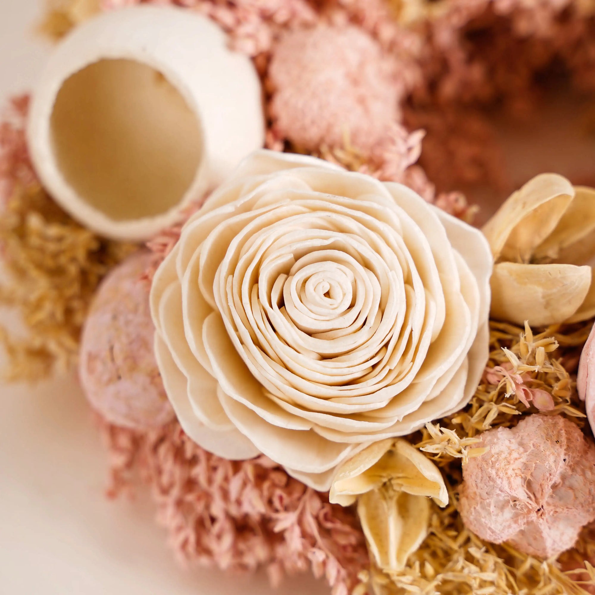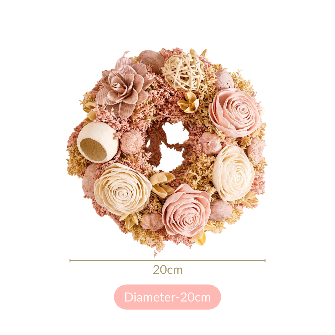 Rest assured, our wreath is expertly crafted to minimise shedding and maintain its shape. However, a slight shedding of dried components is natural. To prevent this, handle it gently and avoid excessive touching. Regular maintenance, such as light dusting, ensures its longevity and preserves its exquisite form.