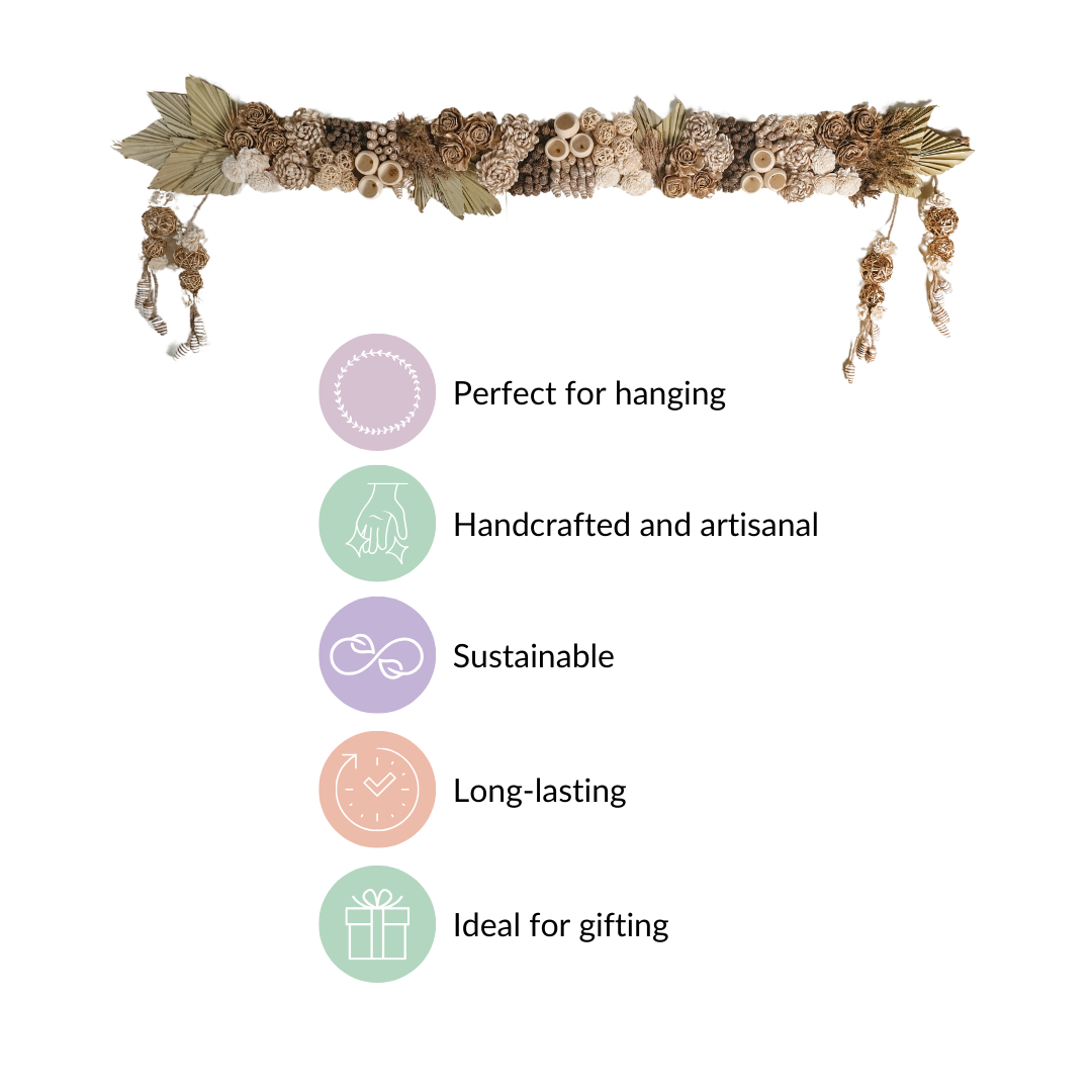 The shola flowers and other components of this toran were sourced ethically and environmentally. The natural plant product, shola, is environmentally friendly, biodegradable, and lightweight. We take immense pride in our responsibility towards eco-conscious practices, and the use of sustainable components in the toran reflects the same.
